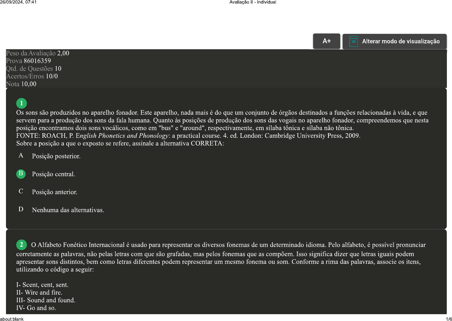 <p>26/09/2024, 07:41 Avaliação Individual A+ Alterar modo de visualização Peso da Avaliação 2,00 Prova 86016359 Qtd. de Questões 10 Acertos/Erros 10/0 Nota 10,00 1 Os sons são produzidos no aparelho fonador. Este aparelho, nada mais é do que um conjunto de órgãos destinados a funções relacionadas à vida, e que servem para a produção dos sons da fala humana. Quanto às posições de produção dos sons das vogais no aparelho fonador, compreendemos que nesta posição encontramos dois sons vocálicos, como em "bus" e "around", respectivamente, em sílaba tônica e sílaba não tônica. FONTE: ROACH, P. English Phonetics and Phonology: a practical course. 4. ed. London: Cambridge University Press, 2009. Sobre a posição a que exposto se refere, assinale a alternativa CORRETA: A Posição posterior. B Posição central. C Posição anterior. D Nenhuma das alternativas. 2 O Alfabeto Fonético Internacional é usado para representar os diversos fonemas de um determinado idioma. Pelo alfabeto, é possível pronunciar corretamente as palavras, não pelas letras com que são grafadas, mas pelos fonemas que as compõem. Isso significa dizer que letras iguais podem apresentar sons distintos, bem como letras diferentes podem representar um mesmo fonema ou som. Conforme a rima das palavras, associe os itens, utilizando código a seguir: I- Scent, cent, sent. II- Wire and fire. Sound and found. about:blank 1/6</p><p>26/09/2024, 07:41 Avaliação - Individual ( ) Althoug. ( ) Bent, lent. ( ) Hire and liar. ( ) Pound. Assinale a alternativa que apresenta a sequência CORRETA: A B II. C II - III. D III IV - II - I. 3 As consoantes são sons produzidos com alguma obstrução quando ar passa pela boca ou nariz. Elas podem ser vozeadas ou desvozeadas, dependendo do uso das pregas vocais no ato da sua produção. Sobre as consoantes vozeadas e desvozeadas, classifique V para as sentenças verdadeiras e F para as falsas: ( ) Dizer consoantes desvozeadas é mesmo que dizer consoantes surdas. ( ) Consoantes vozeadas é mesmo que consoantes palatais. ( ) As consoantes "s" e "f" são vozeadas. ( ) As consoantes "v" e "b" são vozeadas. Assinale a alternativa que apresenta a sequência CORRETA: A B C about:blank 2/6</p><p>26/09/2024, 07:41 Avaliação - Individual D - - - 4 Roach (2009) estuda as posições dos sons das vogais no aparelho fonador. Com base em seus estudos, os sons possuem uma posição específica de realização. Sobre essa posição, veja a afirmação a seguir: Nessa posição temos sons que são produzidos na posição fechada e que diferem na altura e no comprimento. A posição da língua é um pouco mais baixa e centralizada e levantada na frente da articulação, que pode ser percebido no final das sílabas, por exemplo, na palavra "see" /si/ (ver) e na palavra "meat" /mit/ (carne). FONTE: ROACH, P. English Phonetics, and Phonology: a practical course. 4. ed. London: Cambridge University Press, 2009. Acerca do exposto, assinale a alternativa CORRETA: A Nas duas palavras o som vocálico ocorre na posição posterior. B Nas duas palavras som vocálico ocorre na posição central. C Nas duas palavras som vocálico ocorre na posição anterior. D Nas primeira palavra som vocálico ocorre na posição posterior e na segunda, central. 5 In each language, pronunciation represents some difficulty for the new learners. Sometimes, pronunciation of certain sounds can become slightly different because of interference of the nearby combinations, or the place they occur in words and sentences. This happens, for example, with the structure "ing". When pronouncing the "ing" sound at the end of words, this sound shoud be: I- Long and voiced, nasal sound. II- Identical to the nasal sounds in the portuguese words "antes", "ontem". III- By always pronounciating the "g" sound. Check the right option: A I and III are correct. B Option I only is correct. about:blank 3/6</p><p>26/09/2024, 07:41 Avaliação Individual C Option III only is false. D I and II are false. 6 Ao falarmos, os sons são produzidos pela interação entre várias partes do aparelho fonador. Assim, podemos nos referir ao lugar de articulação, modo de articulação, a velocidade de passagem do ar, sua força etc. O modo de articulação dos fonemas consonantais mostra um espectro de ocorrências diversificado em Sobre exposto, classifique V para as sentenças verdadeiras e F para as falsas: ( ) Consoantes labiodentais, a articulação se dá com fechamento parcial dos lábios. ( ) Consoantes laterais: a produção do som ocorre com a língua entre os dentes. ( ) Consoantes africadas: ocorrem com a colocação dos dentes sobre centro da língua. ) Consoantes bilabiais, a articulação se dá com fechamento dos lábios. Assinale a alternativa que apresenta a sequência CORRETA: A V-V-F-F B C F-F-F-V D 7 As línguas possuem sons e estes sons são representados na escrita por letras. Ocorre, por vezes, que a representação de um som se faça por meio de várias letras. No entanto, contrário também ocorre: letras escritas que não se pronunciam. Sobre as silent letters, assinale a alternativa CORRETA: A O T é sempre mudo quando está entre vogais. B O L não é pronunciado antes das letras M, P ou da vogal O. C A letra G nas palavras é muda quando é seguida por M, S, ou WE. about:blank 4/6</p><p>26/09/2024, 07:41 Avaliação Individual D Palavras começadas com KN sempre têm K mudo. 8 O som schwa é sempre átono, ou seja, não é pronunciado com Os dicionários da Língua Inglesa descrevem como uma vogal neutra, formada isoladamente, da seguinte forma: a língua fica suspensa e imóvel no meio da cavidade bucal e os lábios permanecem em posição normal. O resultado é um som fechado, quase ameaçador, um grunhido. O schwa perde impacto porque é um som rápido que ocorre tipicamente em sílabas não acentuadas. Alguns exemplos de vocábulos com som do schwa: above, again, suppose, photograph, scenery. Sobre exposto, cla