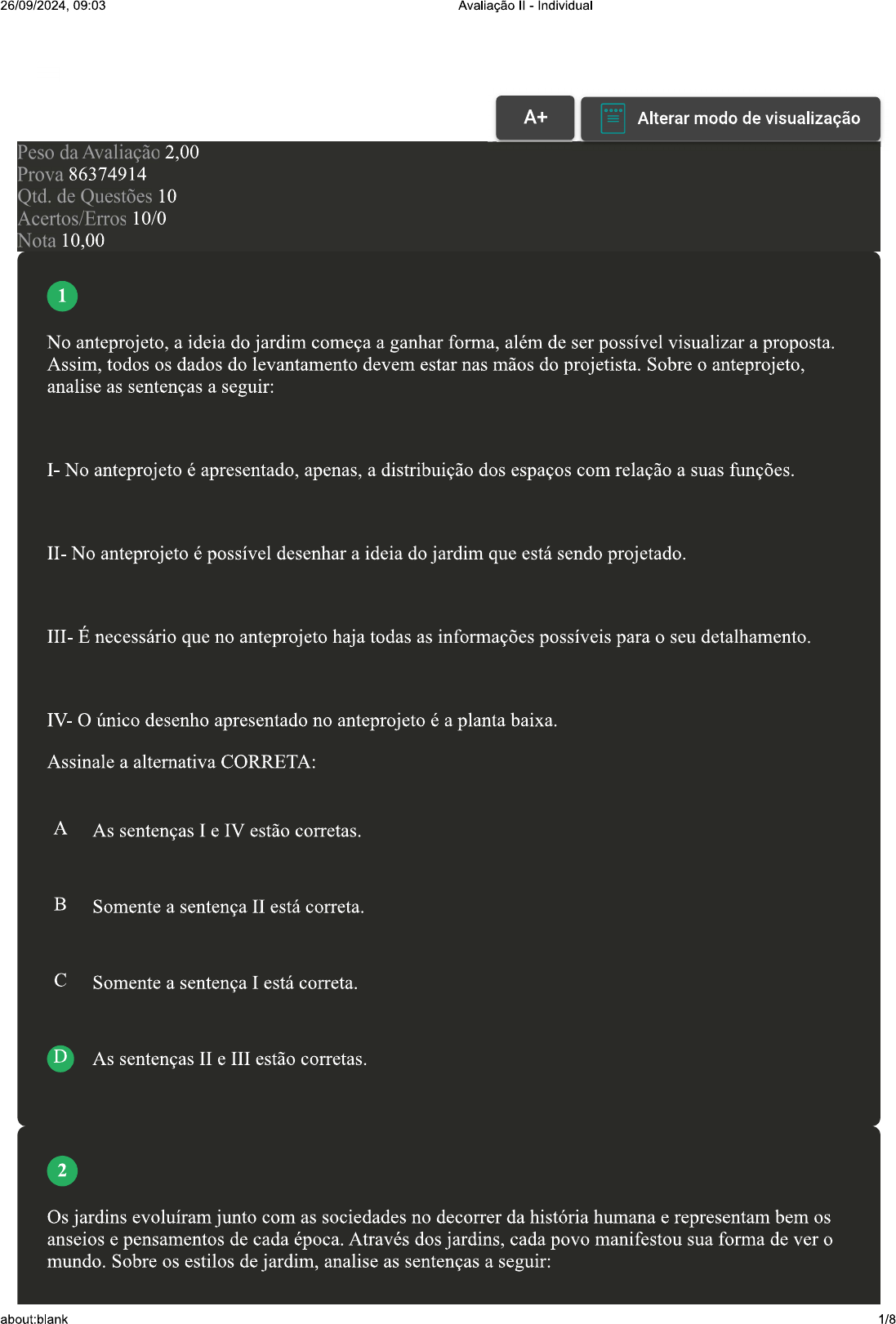 <p>26/09/2024 09:03 Avaliação Individual A+ Alterar modo de visualização Peso da Avaliação 2,00 Prova 86374914 Qtd. de Questões 10 Acertos/Erros 10/0 Nota 10,00 1 No anteprojeto, a ideia do jardim começa a ganhar forma, além de ser possível visualizar a proposta. Assim, todos os dados do levantamento devem estar nas mãos do projetista. Sobre anteprojeto, analise as sentenças a seguir: I- No anteprojeto é apresentado, apenas, a distribuição dos espaços com relação a suas funções. II- No anteprojeto é possível desenhar a ideia do jardim que está sendo projetado. III- É necessário que no anteprojeto haja todas as informações possíveis para seu detalhamento. IV- O único desenho apresentado no anteprojeto é a planta baixa. Assinale a alternativa CORRETA: A As sentenças I e IV estão corretas. B Somente a sentença II está correta. C Somente a sentença I está correta. D As sentenças II e III estão corretas. 2 Os jardins evoluíram junto com as sociedades no decorrer da história humana e representam bem os anseios e pensamentos de cada época. Através dos jardins, cada povo manifestou sua forma de ver mundo. Sobre os estilos de jardim, analise as sentenças a seguir: about:blank 1/8</p><p>26/09/2024, 09:03 Avaliação Individual I- Os jardins suspensos da Babilônia são os mais famosos da Idade Antiga. II- Os jardins da Idade Média ficaram marcados por sua exuberância. III- Os jardins da Idade Moderna eram simples e pouco elaborados. IV- Nos jardins é possível observar a influência de outros estilos. Assinale a alternativa CORRETA: A Somente a sentença III está correta. B As sentenças II e III estão corretas. C Somente a sentença I está correta. D As sentenças I e IV estão corretas. 3 Os princípios de estética são utilizados para dispor os elementos naturais e arquitetônicos da melhor forma e assim tornar espaço agradável para as pessoas que frequentam. Sobre os princípios de estética, analise as sentenças a seguir: I- A mensagem utiliza linhas, formas, texturas e cores para transmitir sensações agradáveis aos frequentadores do espaço paisagístico. II- A escala é utilizada para dispor os elementos no jardim com base no distanciamento entre eles. III- A harmonia propõe que se faça a melhor combinação entre os elementos para que haja unidade na disposição dos diversos elementos. about:blank 2/8</p><p>26/09/2024, 09:03 Avaliação Individual IV- O clímax se refere ao momento em que os usuários adentram a composição paisagística e, assim, se sentem muito bem. Assinale a alternativa CORRETA: A As sentenças I e IV estão corretas. B As sentenças II, III e IV estão corretas. As sentenças I, II e III estão corretas D Somente a sentença IV está correta. 4 Quando se projeta um jardim, existe uma mensagem que paisagista transmite para aqueles que contemplam. Para que essa mensagem seja recebida, paisagista faz uso da combinação de elementos de comunicação, os quais são linha, forma, textura e cor. Sobre os elementos de comunicação do jardim, classifique V para as sentenças verdadeiras e F para as falsas: ( ) A percepção das linhas na paisagem pode se dar tanto na direção horizontal quanto na direção vertical. ( ) Com relação à vegetação, as formas mais marcantes são as copas de árvores e arbustos. ( ) A percepção da textura não sofre influência da escala que padrão apresenta. ( ) A cor pode ser tratada como um instrumento técnico que ajuda a transmitir a mensagem proposta na composição. Assinale a alternativa que apresenta a sequência CORRETA: A V-V-F-V B C about:blank 3/8</p><p>26/09/2024, 09:03 Avaliação Individual D 5 Os elementos arquitetônicos, além da função estética, atuam para tornar jardim um espaço funcional. A escolha dos elementos arquitetônicos ajuda a definir estilo ao qual jardim se propõe. Sobre os elementos arquitetônicos, classifique V para as sentenças verdadeiras e F para as falsas: ( ) Os caminhos para circulação de pessoas são construídos com objetivo estético, de forma que é obrigatório a escolha de materiais que ornem com os demais elementos. ( ) O uso de pérgulas e caramanchões se deve à necessidade de um local para oferecer às pessoas um espaço sombreado, os quais podem ser cobertos com plantas envasadas. ( ) Em áreas com elevação do terreno podem ser colocados mirantes para que as pessoas possam ter uma visão privilegiada da paisagem. ( ) Os jardins podem frequentados durante a noite, e para garantir maior segurança aos usuários devem ser utilizadas luminárias. Assinale a alternativa que apresenta a sequência CORRETA: A B F-F-V-V D 6 "Definimos Paisagismo como um processo consciente de manejo, planejamento e recriação física da paisagem, e que se utiliza de princípios artísticos na construção de ambientes e cenários em qualquer escala de atuação, postura essa tradicionalmente aceita e reproduzida no meio acadêmico" (NIEMEYER, 2019, p. 11). A respeito do conceito de paisagismo, avalie as asserções a seguir e a relação proposta entre elas: about:blank 4/8</p><p>26/09/2024, 09:03 Avaliação Individual I- Conceitos como paisagem, visão paisagística, jardim e jardinagem estão interligados ao conceito de paisagismo, uma vez que são termos utilizados para definir aspectos que constroem a ligação entre ser humano, ambiente urbano e os elementos naturais. PORQUE II- O paisagismo é uma ciência e uma arte que busca trazer a natureza mais pra perto do ser humano, numa combinação organizada e harmoniosa que promova a beleza e a qualidade de vida na área urbana. Assinale a alternativa CORRETA: A A primeira asserção é uma proposição verdadeira, e a segunda, uma proposição falsa. B A primeira asserção é uma proposição falsa, e a segunda, uma proposição verdadeira. C As duas asserções são proposições verdadeiras, mas a segunda não é uma justificativa correta da primeira. D As duas asserções são propos