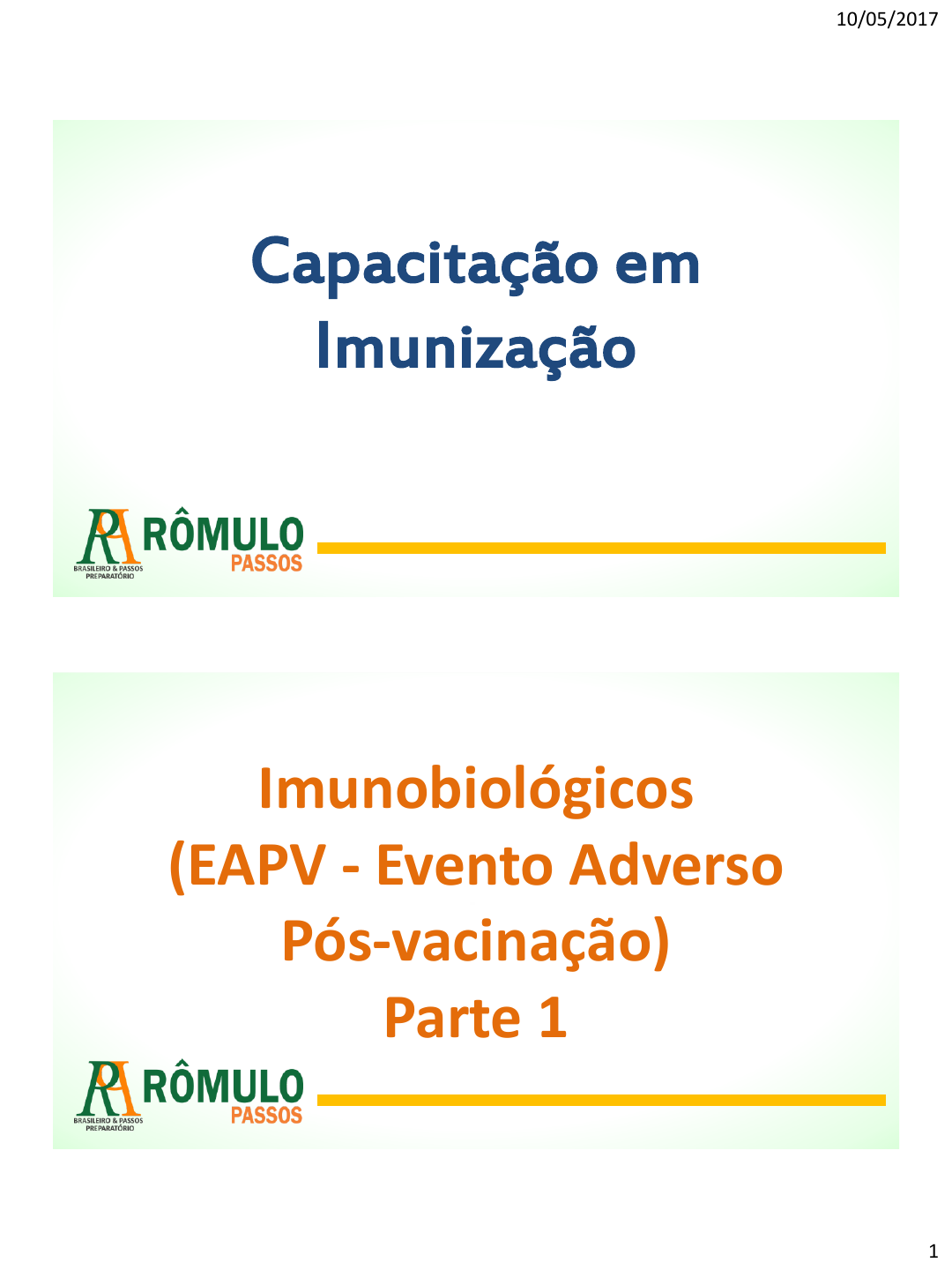 <p>10/05/2017</p><p>1</p><p>Capacitação em</p><p>Imunização</p><p>Imunobiológicos</p><p>(EAPV - Evento Adverso</p><p>Pós-vacinação)</p><p>Parte 1</p><p>Naiara Albuquerque Teixeira - 058.471.863-20</p><p>10/05/2017</p><p>2</p><p>Evento Adverso Pós-vacinação - EAPV</p><p>É qualquer</p><p>ocorrência médica</p><p>indesejada após a</p><p>vacinação</p><p>Que, não</p><p>necessariamente,</p><p>possui uma</p><p>relação causal</p><p>Com o uso de uma</p><p>vacina ou outro</p><p>imunobiológico</p><p>Um EAPV pode ser qualquer evento</p><p>indesejável ou não intencional, isto é,</p><p>sintoma, doença ou um achado laboratorial</p><p>anormal (CIOMS; WHO, 2012).</p><p>Curso de Capacitação em Imunização</p><p>Curso de Capacitação em Imunização</p><p>Os eventos</p><p>adversos causados</p><p>pelas vacinações</p><p>são apenas uma</p><p>fração dos que</p><p>ocorrem após as</p><p>vacinações.</p><p>EAPV -</p><p>Inesperados ou</p><p>Esperados</p><p>Conceitos Gerais - EAPV</p><p>www.romulopassos.com.br</p><p>Naiara Albuquerque Teixeira - 058.471.863-20</p><p>10/05/2017</p><p>3</p><p>Curso de Capacitação em Imunização</p><p>EAPV</p><p>Esperados</p><p>Triviais</p><p>Febre, dor e</p><p>edema local</p><p>Graves</p><p>Convulsões febris,</p><p>anafilaxia</p><p>Inesperados</p><p>Não identificados</p><p>anteriormente</p><p>(vacinas novas)</p><p>Invaginação</p><p>intestinal VORH</p><p>Problemas ligados</p><p>à qualidade do</p><p>produto</p><p>Contaminação de</p><p>lotes abscessos</p><p>locais</p><p>Conceitos Gerais - EAPV</p><p>www.romulopassos.com.br</p><p>Curso de Capacitação em Imunização</p><p>Conceitos Gerais - EAPV</p><p>www.romulopassos.com.br</p><p>Há necessidade de cuidadosa</p><p>investigação</p><p>Diagnóstico diferencial</p><p>Possível tratamento</p><p>VACINA</p><p>ASSOCIAÇÃO</p><p>TEMPORAL</p><p>EAPV</p><p>Naiara Albuquerque Teixeira - 058.471.863-20</p><p>10/05/2017</p><p>4</p><p>Curso de Capacitação em Imunização</p><p>Quando é</p><p>realmente causado</p><p>pela vacina</p><p>Investigar</p><p>Fatores relacionados à vacina</p><p>Fatores relacionados aos</p><p>vacinados</p><p>Fatores relacionados à</p><p>administração</p><p>www.romulopassos.com.br</p><p>Conceitos Gerais - EAPV</p><p>Curso de Capacitação em Imunização</p><p>www.romulopassos.com.br</p><p>Investigar</p><p>Fatores relacionados à</p><p>vacina</p><p>Tipo (viva ou não viva), cepa, meio de</p><p>cultura dos microrganismos;</p><p>Processo de inativação ou atenuação,</p><p>adjuvantes;</p><p>Estabilizadores ou substâncias</p><p>conservadoras, lote da vacina.</p><p>Fatores relacionados aos</p><p>vacinados</p><p>Idade, sexo, número e datas das doses</p><p>anteriores da vacina;</p><p>Eventos adversos às doses prévias,</p><p>doenças concomitantes;</p><p>Doenças alérgicas, autoimunidade,</p><p>deficiência imunológica.</p><p>Fatores relacionados à</p><p>administração</p><p>Agulha e seringa, local de inoculação, via</p><p>de inoculação</p><p>Evento Adverso Pós-vacinação - EAPV</p><p>Naiara Albuquerque Teixeira - 058.471.863-20</p><p>10/05/2017</p><p>5</p><p>Curso de Capacitação em Imunização</p><p>www.romulopassos.com.br</p><p>Atenção Especial - EAPV</p><p> Primária - deficiências</p><p>congênitas da imunidade.</p><p> Secundária - decorrentes</p><p>de doenças ou tratamentos</p><p>que comprometem a</p><p>imunidade.</p><p>Decorrentes de depressão</p><p>imunológica</p><p> Reações de</p><p>hipersensibilidade:</p><p> I (anafiláticas),</p><p> II (destruição da bainha</p><p>de mielina dos nervos),</p><p> III (formação de</p><p>complexos imunes), ou</p><p> IV (hipersensibilidade</p><p>tardia).</p><p>Por reações de</p><p>hipersensibilidade</p><p>Curso de Capacitação em Imunização</p><p>www.romulopassos.com.br</p><p>É importante considerar ainda que, em geral, vacinas mais reatogênicas</p><p>são também mais eficazes.</p><p>Desse modo, deve-se buscar um equilíbrio entre reatogenicidade e</p><p>imunogenicidade</p><p>como os de natureza epidemiológica.</p><p>A decisão sobre</p><p>qual vacina deve ser usada depende da avaliação de vários fatores</p><p>Considerações - EAPV</p><p>Naiara Albuquerque Teixeira - 058.471.863-20</p><p>10/05/2017</p><p>6</p><p>Curso de Capacitação em Imunização</p><p>www.romulopassos.com.br</p><p>deve ser preocupação permanente e</p><p>objeto de estudo</p><p>A ↓ das reações ou complicações pós-vacinações, com a ↑ efetividade</p><p>possível das vacinas</p><p>de todos os responsáveis pelas</p><p>imunizações, em todos os níveis de gestão.</p><p>Novas vacinas, menos reatogênicas ou mais seguras, estão em</p><p>desenvolvimento ou já foram aprovadas.</p><p>considerando custo-benefício, eficácia e</p><p>eficiência,</p><p>A incorporação destas à rotina dos programas de imunização deve ser</p><p>criteriosa</p><p>potencial de coberturas vacinais amplas,</p><p>garantir o abastecimento regular.</p><p>Considerações - EAPV</p><p>www.romulopassos.com.br</p><p>EAPV</p><p>Baseada em critérios</p><p>clínicos ou imunológicos</p><p>que correlacionam ou</p><p>substituem os</p><p>marcadores de proteção</p><p>de uma doença</p><p>imunoprevenível.</p><p>Falha de</p><p>vacinação</p><p>Classificação</p><p>dos EAPV</p><p>Erros de</p><p>imunização</p><p>De acordo com o</p><p>tipo de</p><p>manifestação,</p><p>gravidade e</p><p>causalidade.</p><p>Qualquer evento evitável que</p><p>pode causar ou levar a um uso</p><p>inapropriado de</p><p>imunobiológicos, ou causar</p><p>dano a um paciente, enquanto</p><p>está sob o controle de</p><p>profissionais de saúde,</p><p>pacientes ou consumidores.</p><p>Evento Adverso Pós-vacinação - EAPV</p><p>Curso de Capacitação em Imunização</p><p>Naiara Albuquerque Teixeira - 058.471.863-20</p><p>10/05/2017</p><p>7</p><p>Curso de Capacitação em Imunização</p><p>www.romulopassos.com.br</p><p>FA</p><p>LH</p><p>A</p><p>D</p><p>E</p><p>V</p><p>A</p><p>C<