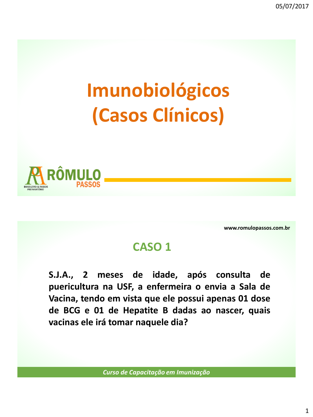 <p>05/07/2017</p><p>1</p><p>Imunobiológicos</p><p>(Casos Clínicos)</p><p>Curso de Capacitação em Imunização</p><p>www.romulopassos.com.br</p><p>S.J.A., 2 meses de idade, após consulta de</p><p>puericultura na USF, a enfermeira o envia a Sala de</p><p>Vacina, tendo em vista que ele possui apenas 01 dose</p><p>de BCG e 01 de Hepatite B dadas ao nascer, quais</p><p>vacinas ele irá tomar naquele dia?</p><p>CASO 1</p><p>Naiara Albuquerque Teixeira - 058.471.863-20</p><p>05/07/2017</p><p>2</p><p>Curso de Capacitação em Imunização</p><p>www.romulopassos.com.br</p><p>Resolução do caso:</p><p> Pentavalente, VIP, Rotavírus e Pneumo 10.</p><p> Deverá retornar a Sala de Vacina aos 3 meses de</p><p>idade.</p><p>CASO 1</p><p>Curso de Capacitação em Imunização</p><p>www.romulopassos.com.br</p><p>Considere o caso abaixo e proceda a resolução:</p><p>C.S.M., 2 meses de idade, chega a Sala de vacina</p><p>da Unidade de Saúde. Sua mãe refere que o</p><p>mesmo não tem caderneta de vacinação e nunca</p><p>tomou nenhuma vacina.</p><p>CASO 2</p><p>Naiara Albuquerque Teixeira - 058.471.863-20</p><p>05/07/2017</p><p>3</p><p>Curso de Capacitação em Imunização</p><p>www.romulopassos.com.br</p><p>Resolução do caso:</p><p> Deve ser preparada uma caderneta de vacinação para</p><p>C.S.M. com os aprazamentos a partir daquele momento;</p><p> C.S.M. tomará BCG, Pentavalente, VIP, Rotavírus e</p><p>Pneumo 10;</p><p> C.S.M. perdeu a dose de Hepatite B (recombinante), dada</p><p>até 30 dias após o nascimento;</p><p> Deverá retornar a Sala de Vacina aos 3 meses de idade.</p><p>CASO 2</p><p>Curso de Capacitação em Imunização</p><p>www.romulopassos.com.br</p><p>B.J.S., 5 meses de idade, chega a Sala de Vacina da unidade de</p><p>saúde. Ao checar sua caderneta de vacinação a enfermeira</p><p>percebe que seu histórico é:</p><p>• Ao nascer – BCG e Hepatite B;</p><p>• 2 meses – Pentavalente, VIP, Rotavírus e Pneumo 10;</p><p>• 3 meses – Meningo C;</p><p>Como ficará seu cronograma vacinal a partir daquele momento?</p><p>CASO 3</p><p>Naiara Albuquerque Teixeira - 058.471.863-20</p><p>05/07/2017</p><p>4</p><p>Curso de Capacitação em Imunização</p><p>www.romulopassos.com.br</p><p>Resolução do caso:</p><p>No momento (5 meses) tomará as seguintes vacinas:</p><p> Pentavalente, VIP, Rotavírus e Pneumo 10, (Meningo C*)</p><p>Aos 6 meses tomará as seguintes vacinas:</p><p> Pentavalente, VIP, (Meningo C*)</p><p>Seguirá as próximas vacinas com aprazamento normal.</p><p>CASO 3</p><p>Curso de Capacitação em Imunização</p><p>www.romulopassos.com.br</p><p>Durante campanha para atualização de caderneta de vacinação no</p><p>Distrito Federal, um vacinador observou que, na caderneta de</p><p>vacinação de uma criança de 12 meses de idade, não constava a</p><p>terceira dose das vacinas Pentavalente, VIP, bem como a vacina</p><p>contra a febre amarela e o sarampo, caxumba e rubéola.</p><p>Como proceder neste caso?</p><p>CASO 4</p><p>Naiara Albuquerque Teixeira - 058.471.863-20</p><p>05/07/2017</p><p>5</p><p>Curso de Capacitação em Imunização</p><p>www.romulopassos.com.br</p><p>Resolução do caso:</p><p>A criança irá tomar no momento:</p><p> 3ª dose da Pentavalente + 3ª dose da VIP + Febre Amarela</p><p>Agendar retorno após 30 dias:</p><p> Tríplice Viral + Pneumo 10 + Meningo C</p><p> Observação: Só tomará DTP a partir dos 18 meses, mínimo de 6</p><p>meses após a dose de pentavalente.</p><p>CASO 4</p><p>Curso de Capacitação em Imunização</p><p>www.romulopassos.com.br</p><p>Considere que um lactente de 4 meses de idade</p><p>tenha sido levado a um centro de saúde para</p><p>receber a primeira dose da vacina contra o</p><p>Rotavírus.</p><p>Como proceder?</p><p>CASO 5</p><p>Naiara Albuquerque Teixeira - 058.471.863-20</p><p>05/07/2017</p><p>6</p><p>Curso de Capacitação em Imunização</p><p>www.romulopassos.com.br</p><p>Resolução do caso:</p><p>O lactente não será vacinado contra o Rotavírus pois a idade</p><p>máxima para primeira dose é de 3 meses e 15 dias.</p><p>CASO 5</p><p>Curso de Capacitação em Imunização</p><p>www.romulopassos.com.br</p><p>A mãe leva seu filho de 2 meses de idade a Sala de</p><p>Vacina para tomar as vacinas que precisar. Ela relata a</p><p>Téc. de Enfermagem que seu filho tem histórico na</p><p>família de convulsão (o primo da criança), e que na</p><p>semana anterior estava “gripadinho”.</p><p>Como proceder neste caso?</p><p>CASO 6</p><p>Naiara Albuquerque Teixeira - 058.471.863-20</p><p>05/07/2017</p><p>7</p><p>Curso de Capacitação em Imunização</p><p>www.romulopassos.com.br</p><p>Resolução do caso:</p><p>O lactente será vacinado com as vacinas de rotina, pois o</p><p>histórico familiar de convulsão e a “gripe na semana anterior”</p><p>são episódios considerados como uma falsa contraindicação:</p><p> Pentavalente, VIP, Rotavírus e Pneumo 10;</p><p>CASO 6</p><p>Curso de Capacitação em Imunização</p><p>www.romulopassos.com.br</p><p>7. Uma mãe chega a unidade de saúde relatando</p><p>que seu filho tomou a vacina da febre amarela com</p><p>9 meses, e lhe falaram sobre o reforço aos 4 anos.</p><p>Hoje ela o trouxe para tomar o reforço.</p><p>Como você procederia neste caso?</p><p>CASO 7</p><p>Naiara Albuquerque Teixeira - 058.471.863-20</p><p>05/07/2017</p><p>8</p><p>Curso de Capacitação em Imunização</p><p>www.romulopassos.com.br</p><p>Resolução do caso:</p><p>Deve-se explicar a mãe que a vacina da febre amarela sofreu</p><p>uma alteração no seu esquema vacinal, que a partir de agora</p><p>ela é ofertada em dose única independente da idade, sendo</p><p>assim seu filho já está vacinado e imunizado, não necessitando</p><p>mais de nenhuma outra dose.</p><p>CASO 7</p><p>Curso de Capacitação em Imunização</p><p>www.romulopassos.com.br</p><p>8. Uma gestante no início de seu período gestacional chega a</p><p>Unidade de Saúde da Família para o Pré-Natal. Quando</p