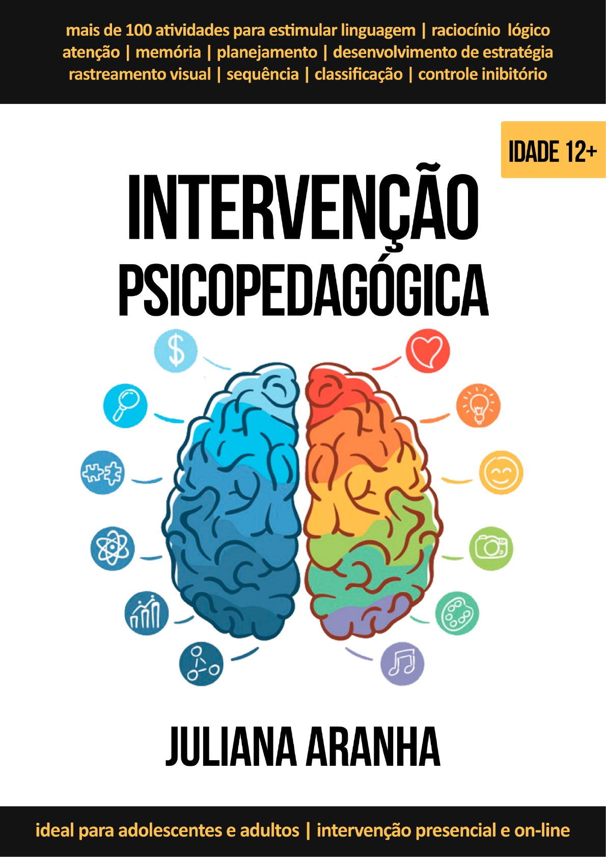 <p>1</p><p>Licenciado para - F</p><p>R</p><p>A</p><p>N</p><p>C</p><p>IE</p><p>LE</p><p>D</p><p>E</p><p>B</p><p>E</p><p>M</p><p>S</p><p>ILV</p><p>A</p><p>G</p><p>O</p><p>U</p><p>LA</p><p>R</p><p>T</p><p>- 01033346969 - P</p><p>rotegido por E</p><p>duzz.com</p><p>2</p><p>Olá, Psico!!</p><p>Que alegria ter você aqui comigo nessa caminhada chamada intervenção</p><p>psicopedagógica!</p><p>Quando comecei a atuar na Psicopedagogia, sentia grande dificuldade no momento de</p><p>estruturar as minhas intervenções psicopedagógicas, pois não sabia exatamente quais</p><p>atividades realizar com meus pacientes de realidades tão diversas: os que apresentam</p><p>dificuldades de aprendizagem (sem distúrbios específicos), com transtornos de</p><p>aprendizagem (dislexia e discalculia) e com transtorno do déficit de atenção e</p><p>hiperatividade (TDAH). Essa dificuldade aumentava quando se tratava dos pacientes</p><p>adolescentes e adultos, pois materiais para essa faixa etária eram escassos ou de difícil</p><p>acesso.</p><p>Ao longo do tempo, percebi que essa “angústia” não era só minha. No meu perfil do</p><p>Instagram, @ju_psicopedagoga_campinas, costumo receber semanalmente dezenas de</p><p>comentários e dúvidas sobre o que fazer na intervenção que atenda adolescentes e</p><p>adultos – exatamente como eu!!!</p><p>Para resolver esse entrave, passei (e passo ainda) horas estudando, pesquisando e</p><p>estruturando materiais de intervenção psicopedagógica clínica. Hoje, conto com meu</p><p>acervo de recursos, os quais me dão suporte nas intervenções com meus pacientes.</p><p>E, para ajudar profissionais e pacientes (e as famílias dos pacientes que sempre estão</p><p>envolvidas nesse processo), elaborei esse EBOOK DE INTERVENÇÃO PSICOPEDAGÓGICA,</p><p>com os recursos que mais utilizo no consultório.</p><p>Aqui você encontrará mais de 100 atividades lúdicas, contemplando os domínios</p><p>executivo e verbal, que ajudarão a estimular linguagem, raciocínio lógico, atenção,</p><p>memória, planejamento, desenvolvimento de estratégia, rastreamento visual, sequência,</p><p>classificação, controle inibitório etc. que contribuirão para um melhor desenvolvimento</p><p>cognitivo dos seus pacientes.</p><p>A sequência das atividades é uma sugestão. Você poderá usar suas próprias ideias e fazer</p><p>modificações, conforme as demandas de cada caso.</p><p>Bom trabalho!</p><p>Com carinho,</p><p>Juliana Aranha</p><p>Licenciado para - F</p><p>R</p><p>A</p><p>N</p><p>C</p><p>IE</p><p>LE</p><p>D</p><p>E</p><p>B</p><p>E</p><p>M</p><p>S</p><p>ILV</p><p>A</p><p>G</p><p>O</p><p>U</p><p>LA</p><p>R</p><p>T</p><p>- 01033346969 - P</p><p>rotegido por E</p><p>duzz.com</p><p>3</p><p>Não menospreze os pequenos começos.</p><p>Muitas coisas que se tornam grandes e importantes,</p><p>começaram pequenas e insignificantes.</p><p>Até com Jesus foi assim:</p><p>“Pode vir alguma coisa boa de Nazaré?”</p><p>João 1:45</p><p>Licenciado para - F</p><p>R</p><p>A</p><p>N</p><p>C</p><p>IE</p><p>LE</p><p>D</p><p>E</p><p>B</p><p>E</p><p>M</p><p>S</p><p>ILV</p><p>A</p><p>G</p><p>O</p><p>U</p><p>LA</p><p>R</p><p>T</p><p>- 01033346969 - P</p><p>rotegido por E</p><p>duzz.com</p><p>4</p><p>Licenciado para - F</p><p>R</p><p>A</p><p>N</p><p>C</p><p>IE</p><p>LE</p><p>D</p><p>E</p><p>B</p><p>E</p><p>M</p><p>S</p><p>ILV</p><p>A</p><p>G</p><p>O</p><p>U</p><p>LA</p><p>R</p><p>T</p><p>- 01033346969 - P</p><p>rotegido por E</p><p>duzz.com</p><p>5</p><p>CAMPINAS - SP, 2020.</p><p>APOSTILA DIGITAL PROTEGIDA POR DIREITOS AUTORAIS.</p><p>IMAGENS LICENCIADAS POR FREEPIK – FREEPIK.COM</p><p>É PROIBIDO REPRODUZIR, PUBLICAR OU DISTRIBUIR POR QUALQUER</p><p>OUTRO MEIO O TODO OU PARTE DO CONTEÚDO DESSE E-BOOK, SEM</p><p>PRÉVIA AUTORIZAÇÃO DA AUTORA.</p><p>Licenciado para - F</p><p>R</p><p>A</p><p>N</p><p>C</p><p>IE</p><p>LE</p><p>D</p><p>E</p><p>B</p><p>E</p><p>M</p><p>S</p><p>ILV</p><p>A</p><p>G</p><p>O</p><p>U</p><p>LA</p><p>R</p><p>T</p><p>- 01033346969 - P</p><p>rotegido por E</p><p>duzz.com</p><p>http://www.julianaaranha.com/</p><p>https://www.instagram.com/ju_psicopedagoga_campinas/?hl=pt-br</p><p>6</p><p>Atenção e Funções Executivas ........................................... 7</p><p>Atividades de 1 a 50</p><p>Raciocínio lógico ............................................................... 28</p><p>Atividades de 51 a 70</p><p>Linguagem ........................................................................ 41</p><p>Atividades de 71 a 111</p><p>Respostas ......................................................................... 61</p><p>Licenciado para - F</p><p>R</p><p>A</p><p>N</p><p>C</p><p>IE</p><p>LE</p><p>D</p><p>E</p><p>B</p><p>E</p><p>M</p><p>S</p><p>ILV</p><p>A</p><p>G</p><p>O</p><p>U</p><p>LA</p><p>R</p><p>T</p><p>- 01033346969 - P</p><p>rotegido por E</p><p>duzz.com</p><p>7</p><p>Licenciado para - F</p><p>R</p><p>A</p><p>N</p><p>C</p><p>IE</p><p>LE</p><p>D</p><p>E</p><p>B</p><p>E</p><p>M</p><p>S</p><p>ILV</p><p>A</p><p>G</p><p>O</p><p>U</p><p>LA</p><p>R</p><p>T</p><p>- 01033346969 - P</p><p>rotegido por E</p><p>duzz.com</p><p>8</p><p>As atividades propostas a seguir têm por objetivo treinar habilidades de</p><p>atenção, flexibilidade cognitiva, viso construção espacial, memória,</p><p>classificação, sequência etc.</p><p>As habilidades requeridas são atenção difusa, atenção concentrada,</p><p>memória operacional, viso construção espacial, entre outras.</p><p>Nos exercícios de memorização, peça ao seu paciente que diga em voz alta</p><p>o que vê e faça uma breve descrição. Isso ajudará no processo de atenção e</p><p>memória.</p><p>Oriente o paciente que, ao procurar itens diferentes e iguais, use a estratégia</p><p>de passar o dedo abaixo de cada figura. Isso ajudará na localização o item</p><p>procurado.</p><p>Licenciado para - F</p><p>R</p><p>A</p><p>N</p><p>C</p><p>IE</p><p>LE</p><p>D</p><p>E</p><p>B</p><p>E</p><p>M</p><p>S</p><p>ILV</p