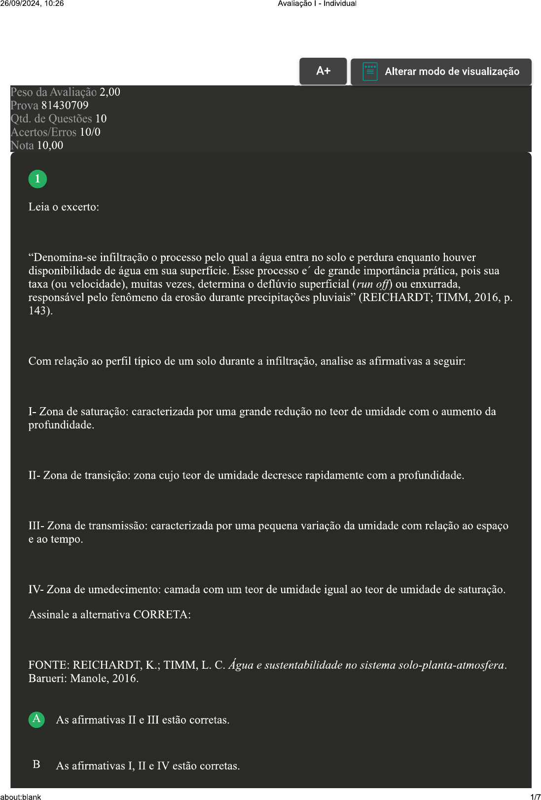 <p>26/09/2024, 10:26 Avaliação - Individual A+ Alterar modo de visualização Peso da Avaliação 2,00 Prova 81430709 Qtd. de Questões 10 Acertos/Erros 10/0 Nota 10,00 1 Leia excerto: "Denomina-se infiltração processo pelo qual a água entra no solo e perdura enquanto houver disponibilidade de água em sua superfície. Esse processo e' de grande importância prática, pois sua taxa (ou velocidade), muitas vezes, determina deflúvio superficial (run off) ou enxurrada, responsável pelo fenômeno da erosão durante precipitações pluviais" (REICHARDT; TIMM, 2016, p. 143). Com relação ao perfil típico de um solo durante a infiltração, analise as afirmativas a seguir: I- Zona de saturação: caracterizada por uma grande redução no teor de umidade com aumento da profundidade. II- Zona de transição: zona cujo teor de umidade decresce rapidamente com a profundidade. III- Zona de transmissão: caracterizada por uma pequena variação da umidade com relação ao espaço e ao tempo. IV- Zona de umedecimento: camada com um teor de umidade igual ao teor de umidade de saturação. Assinale a alternativa CORRETA: FONTE: REICHARDT, K.; TIMM, L. C. Água e sustentabilidade no sistema Barueri: Manole, 2016. A As afirmativas II e III estão corretas. B As afirmativas I, II e IV estão corretas. about:blank 1/7</p><p>26/09/2024, 10:26 Avaliação Individual C As afirmativas I e III estão corretas. D As afirmativas III e IV estão corretas. 2 A água é um elemento-chave na produção de alimentos. Cada cultura tem uma demanda hídrica diferente, e alguns fatores podem influenciar no consumo total de água pelas plantas. Existe a influência do estágio de desenvolvimento, clima, tipo de solo, se há cobertura do solo, entre outros, sendo a transpiração uma reação a alguns desses fatores. Sobre a transpiração, analise as afirmativas a seguir: I- A transpiração faz com que as plantas necessitem de água disponível no solo. II- Quanto mais a planta transpirar, menos ela irá demandar água. Quanto menor for a transpiração da planta, maior será a abertura dos estômatos. Assinale a alternativa CORRETA: A As afirmativas I, II e III estão corretas. B As afirmativas II e III estão corretas. Somente a afirmativa I está correta. D Somente a afirmativa III está correta. 3 O manejo ideal envolve compreender sobre quando, quanto e como irrigar. Nesse contexto, alguns equipamentos podem auxiliar agricultor a acompanhar nível de umidade do solo, especialmente na zona de atividade das raízes. Considerando contexto apresentado, assinale a alternativa CORRETA que apresenta equipamento responsável pelas medições do estado da água no solo: about:blank 2/7</p><p>26/09/2024, 10:26 Avaliação - Individual A B Condutivímetro. C D Gravímetro. 4 A agricultura irrigada tem grande importância na alimentação da população, pois garante produtividade e alimento de qualidade. No entanto, pode causar impactos negativos ao meio ambiente, à qualidade do solo e água e à saúde pública. Dessa forma, uso racional e consciente é a chave para solucionar essa questão. Sobre uso racional da água, classifique V para as sentenças verdadeiras e F para as falsas: ( ) O melhoramento genético pode auxiliar o uso racional da água por meio do desenvolvimento de cultivares mais resistentes ao estresse hídrico. ( ) Manutenções periódicas dos equipamentos contribuem para esse uso racional, já que evitam vazamentos e perda de água. ( ) O agricultor deve escolher apenas uma medida para otimizar a eficiência do uso da água e mitigar os impactos negativos nos recursos hídricos. Assinale a alternativa que apresenta a sequência CORRETA: A V F - V. B C F - V - F. D about:blank 3/7</p><p>26/09/2024 10:26 Avaliação Individual 5 A política nacional de recursos hídricos busca assegurar água de qualidade às gerações atuais e futuras. A Lei 9.433, de 8 de janeiro de 1997, é conhecida como Lei das Águas e foi um marco importante para garantir a disponibilidade de água para toda a população. Com relação à Política Nacional de Recursos Hídricos, analise as afirmativas a seguir: I- A água é um bem de domínio privado. II- A água é um recurso natural ilimitado. III- Em escassez, uso prioritário é consumo humano e a dessedentação de animais. Assinale a alternativa CORRETA: FONTE: http://www.planalto.gov.br/ccivil_03/leis/19433.htm. Acesso em: 9 maio 2022. A Somente a afirmativa III está correta. B Somente a afirmativa I está correta. C As afirmativas II e III estão corretas. D Somente a afirmativa II está correta. 6 A água chega ao solo trazida pela chuva, pelo degelo em regiões frias ou pela irrigação, e para ficar disponível para as plantas, ela deve infiltrar. A água pode escoar ou evaporar-se, caso não entre facilmente no solo, portanto, mesmo que ela tenha chegado ao solo, não é garantido que ela irá infiltrar. Considerando as características edafoclimáticas que interferem no processo de infiltração da água no solo, analise as opções a seguir: I- Tipo de solo. II- Declividade do terreno. about:blank 4/7</p><p>26/09/2024, 10:26 Avaliação Individual III- Cobertura vegetal do solo. Assinale a alternativa CORRETA: A Somente a opção III está correta. B As opções I, II, III estão corretas. C Somente a opção I está correta. D Somente a opção II está correta. 7 O manejo da irrigação começa antes mesmo do início da irrigação. Fatores como a cultura utilizada, solo e a eficiência do sistema de irrigação devem ser considerados antes de implantar sistema. Algumas estratégias de manejo para aumentar a eficiência do uso da água na produção agrícola podem ser adotadas. Com relação a essas estratégias, analise as afirmativas a seguir: I- A irrigação sem déficit tem por objetivo maximizar a produção por unidade de volume de água aplicada. II- Na irrigação com déficit, objetivo é aplicar uma quantidade de água capaz de suprir totalment