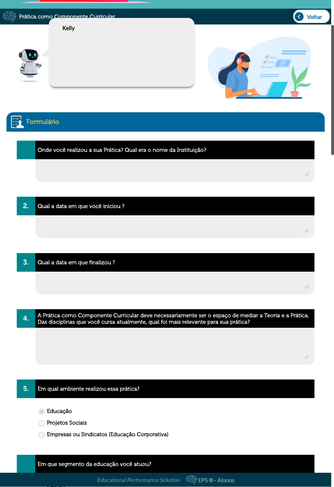 <p>14</p><p>Prática como Componente Curricular Voltar</p><p>Formulário</p><p>1. Onde você realizou a sua Prática? Qual era o nome da Instituição?</p><p>A prática foi realizada em um colégio particular na Zona Sul de São Paulo chamado Certus.</p><p>2. Qual a data em que você iniciou ?</p><p>08/04/2024</p><p>3. Qual a data em que finalizou ?</p><p>24/04/2024</p><p>4. A Prática como Componente Curricular deve necessariamente ser o espaço de mediar a Teoria e a Prática.</p><p>Das disciplinas que você cursa atualmente, qual foi mais relevante para sua prática?</p><p>Metodologias de Alfabetização e Letramento, foi da disciplina que mais me ajudou na realização da prática.</p><p>5. Em qual ambiente realizou essa prática?</p><p>Educação</p><p>Projetos Sociais</p><p>Empresas ou Sindicatos (Educação Corporativa)</p><p>5.1 Em que segmento da educação você atuou?</p><p>Gestão</p><p>Oi Kelly,</p><p>Parabéns! Você concluiu seu relatório e, se chegou até</p><p>aqui preenchendo com cuidado todos os itens, já deu</p><p>passos importantes para ser um pro�ssional valorizado</p><p>no futuro!</p><p>Suas horas serão computadas!</p><p>Educational Performance Solution EPS ® - Alunos</p><p>26/09/2024, 10:29 Estácio: Alunos</p><p>https://simulado.estacio.br/alunos/ 1/1</p><p>javascript:alert('EPS - Educational Performance Solution\n\nM%C3%B3dulo do Aluno\n\nAxiom Consultoria em Tecnologia da Informa%C3%A7%C3%A3o Ltda.\n\nVers%C3%A3o 24.9.32')</p><p>javascript:alert('EPS - Educational Performance Solution\n\nM%C3%B3dulo do Aluno\n\nAxiom Consultoria em Tecnologia da Informa%C3%A7%C3%A3o Ltda.\n\nVers%C3%A3o 24.9.32')</p><p>javascript:alert('EPS - Educational Performance Solution\n\nM%C3%B3dulo do Aluno\n\nAxiom Consultoria em Tecnologia da Informa%C3%A7%C3%A3o Ltda.\n\nVers%C3%A3o 24.9.32')</p><p>javascript:alert('EPS - Educational Performance Solution\n\nM%C3%B3dulo do Aluno\n\nAxiom Consultoria em Tecnologia da Informa%C3%A7%C3%A3o Ltda.\n\nVers%C3%A3o 24.9.32')</p><p>javascript:alert('EPS - Educational Performance Solution\n\nM%C3%B3dulo do Aluno\n\nAxiom Consultoria em Tecnologia da Informa%C3%A7%C3%A3o Ltda.\n\nVers%C3%A3o 24.9.32')</p><p>javascript:alert('EPS - Educational Performance Solution\n\nM%C3%B3dulo do Aluno\n\nAxiom Consultoria em Tecnologia da Informa%C3%A7%C3%A3o Ltda.\n\nVers%C3%A3o 24.9.32')</p>
