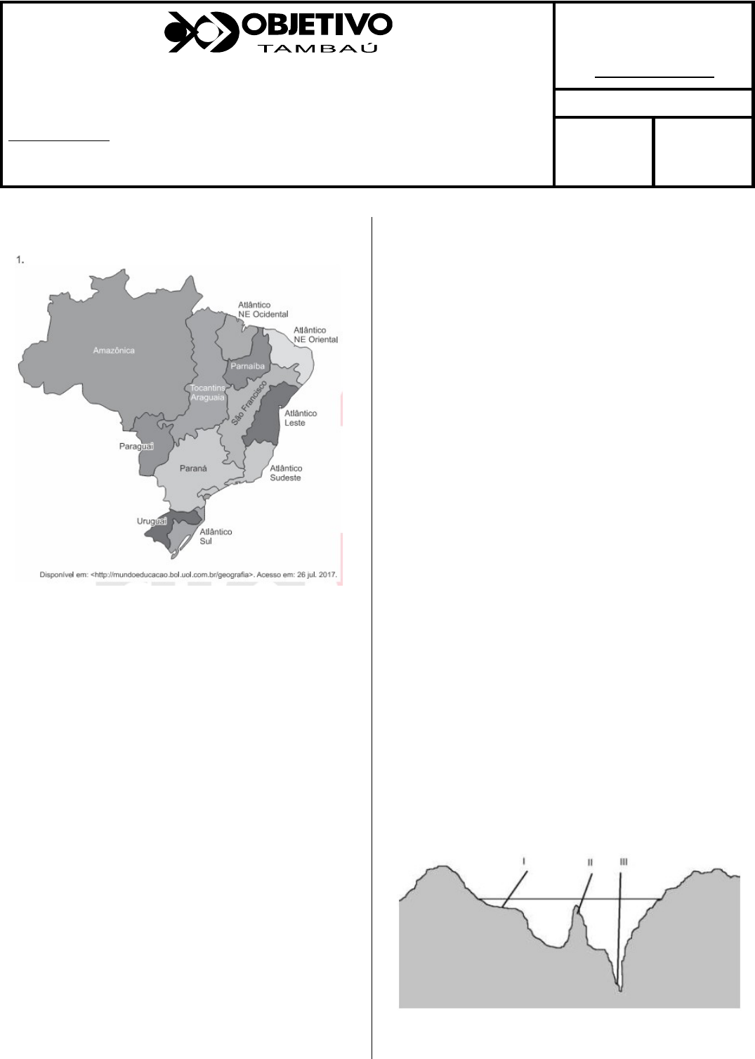<p>NOME: .......................................................................................... n.º _ _</p><p>1ª série EM Data: _ _ / _ _ / 2024 2º Bimestre</p><p>Disciplina:</p><p>Sub- PE 2</p><p>GEOGRAFIA</p><p>Valor da Prova: 10,0</p><p>Professor:</p><p>Jeferson</p><p>NOTA:</p><p>1.</p><p>2</p><p>2. De um título condizente para o mapa acima.</p><p>_________________________________________________________________________________________________________</p><p>3. Descreva em poucas palavras os rios da vertente oeste do continente americano.</p><p>_______________________________________________________________________________________________________________________________________________________________________________</p><p>4. Como são chamadas as bacias hidrográficas que deságuam diretamente para o mar?</p><p>___________________________________________________________________________________________________________________________________________________</p><p>5. A bacia Platina, localizada no centro-sul brasileiro, é uma das principais bacias hidrográficas do mundo. Ela é formada pelos rios</p><p>A) Amazonas, Madeira e Preto.</p><p>B) Tietê, Araguaia e Tocantins.</p><p>C) São Francisco e Parnaíba.</p><p>D) Paraná, Paraguai e Uruguai.</p><p>E) Tietê, Preto e Paraíba do Sul.</p><p>6. Os oceanos são grandes fontes de alimento pela riqueza de sua vida marinha, embora, nos últimos tempos, venham enfrentando problemas ambientais, provocados por ações humanas.</p><p>Considere as seguintes afirmações sobre os problemas ambientais dos oceanos.</p><p>I - As águas oceânicas recebem todos os produtos derivados de atividades industriais, mas suas grandes extensões reduzem a concentração dos poluentes, não oferecendo grandes riscos à fauna marinha.</p><p>II - A pesca predatória, em escala industrial, retira do mar milhares de toneladas de peixes sem nenhum controle quanto à seleção das espécies e à época de reprodução de cada uma, o que pode levar cardumes inteiros ao desaparecimento.</p><p>III - Os acidentes de manutenção nas plataformas de gás e petróleo são responsáveis pela maior parte das descargas de óleo nos oceanos.</p><p>Quais estão corretas?</p><p>A)</p><p>Apenas I.</p><p>B)</p><p>Apenas II.</p><p>C)</p><p>Apenas III.</p><p>D)</p><p>Apenas II e III.</p><p>E)</p><p>I, II e III.</p><p>7. Observe a imagem que representa esquematicamente o relevo submarino.</p><p>Classifique os itens I, II e III da imagem acima.</p><p>___________________________________________________________________________________________________________________________________________________</p><p>8. Qual relação entre os fenômenos El Niño e La niña com o Oceano Pacifico?</p><p>_________________________________________________________________________________________________________</p><p>9. Qual das alternativas abaixo apresenta o conceito correto de bacia hidrográfica?</p><p>a) Unidade espacial que comporta a rede de drenagem delimitada pelo relevo.</p><p>b) Território marcado apenas pela presença de córregos de regime intermitente.</p><p>c) Classificação geológica formada pelo conjunto de rios com a mesma nascente.</p><p>d) Categoria de análise que é fruto da diminuição da rede de drenagem regional.</p><p>e) Categorização hidráulica dos rios que possuem a mesma vazão na jusante.</p><p>10. As marés nos oceanos da Terra são causadas por uma combinação de fatores:</p><p>- a Lua atrai as massas de água dos oceanos de maneira desigual, sendo a atração mais forte no lado mais próximo da Lua. Esta diferença na força deforma a massa de água, de modo a criar uma maré alta no lado da Terra voltado para a Lua;</p><p>- o mesmo efeito acontece com relação à atração das águas pelo Sol, porém com uma intensidade menor;</p><p>- o movimento de rotação da Terra em relação ao centro de massa do sistema Terra-Lua faz surgir uma maré alta no lado da Terra oposto à Lua.</p><p>Sobre este fenômeno é correto afirmar que</p><p>a) a força que a Lua exerce em um quilograma de água no lado da Terra voltado para ela vale o dobro daquela exercida no lado oposto.</p><p>b) o efeito das marés não depende da massa da Lua nem do Sol, por isso a influência da Lua é maior que a do Sol, mesmo sua massa sendo muitíssimo menor do que a dele.</p><p>c) se o valor da constante gravitacional na Lei da Gravitação fosse diferente, o efeito da maré ainda teria a mesma intensidade.</p><p>d) a intensidade do efeito de maré depende da distância entre a Terra e a Lua, sendo maior quando a Lua está mais próxima.</p><p>11. Diferente dos oceanos, os mares são subdivididos, de acordo com sua dimensão e posição geográfica. Nas alternativas a seguir, indique a afirmação correta quanto ao tipo de mar e à localização.</p><p>Alternativas</p><p>A. São denominados mares fechados ou isolados, por serem lagos salgados no meio do continente, formados por restos de antigos mares que estão secando, também são chamados de residuais.</p><p>B. Mares são considerados uma grande massa de água salgada localizados em quase todo o Planeta.</p><p>C. O Mar Morto, situado no Oriente Médio recebe esse nome devido às mortes de refugiados que tentaram atravessá-lo.</p><p>D. Mares abertos são aqueles que ocorrem em alto-mar, onde a interferência do continente é quase nula.</p><p>image2.png</p><p>image3.png</p><p>image1.wmf</p>