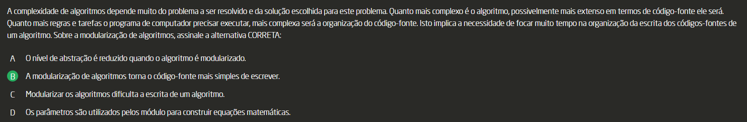 <p>A complexidade de algoritmos depende muito do problema a ser resolvido e da solução escolhida para este problema. Quanto mais complexo é algoritmo, possivelmente mais extenso em termos de código-fonte ele Quanto mais regras e tarefas programa de computador precisar executar, mais complexa será a organização do código-fonte. Isto implica a necessidade de focar muito tempo na organização da escrita dos códigos-fontes de um algoritmo. Sobre a modularização de algoritmos, assinale a alternativa CORRETA: A 0 nível de abstração é reduzido quando algoritmo é modularizado. B A modularização de algoritmos torna código-fonte mais simples de escrever. Modularizar os algoritmos dificulta a escrita de um algoritmo. D Os parâmetros são utilizados pelos módulo para construir equações matemáticas.</p>