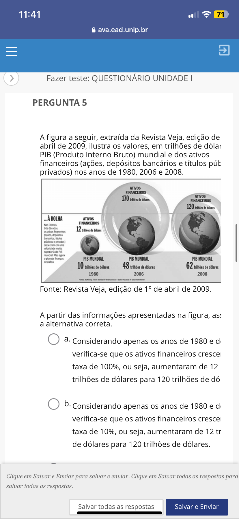 <p>11:41 71 ava.ead.unip.br Fazer teste: QUESTIONÁRIO UNIDADE PERGUNTA 5 A figura a seguir, extraída da Revista Veja, edição de abril de 2009, ilustra os valores, em trilhões de dólar PIB (Produto Interno Bruto) mundial e dos ativos financeiros (ações, depósitos bancários e títulos púb privados) nos anos de 1980, 2006 e 2008. ATIVOS FINANCEIROS 170 ATIVOS de FINANCEIROS 120 de BOLHA ATIVOS FINANCEIROS Nas últimas 12 os ativos financeiros de depósitos públicos privados) cresceram em uma velocidade muito superior PIB mundial Mas agora 0 planeta finanças PIB MUNDIAL PIB MUNDIAL PIB MUNDIAL desinflou 10 trilhões de dólares 48 trilhões de 62 trilhões de dólares 1980 2006 2008 Fonte: Revista Veja, edição de 1° de abril de 2009. A partir das informações apresentadas na figura, a alternativa correta. a. Considerando apenas os anos de 1980 e d verifica-se que os ativos financeiros crescer taxa de 100%, ou seja, aumentaram de 12 trilhões de dólares para 120 trilhões de dó b. Considerando apenas os anos de 1980 e d verifica-se que os ativos financeiros crescer taxa de 10%, ou seja, aumentaram de 12 tr de dólares para 120 trilhões de dólares. Clique em Salvar e Enviar para salvar e enviar. Clique em Salvar todas as para salvar todas as respostas. Salvar todas as respostas Salvar e Enviar</p>