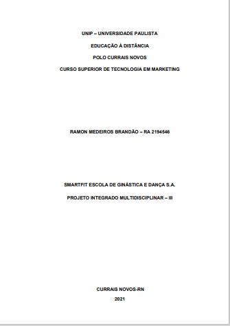 <p>UNIP - UNIVERSIDADE PAULISTA EDUCAÇÃO A DISTÂNCIA POLO CURRAIS NOVOS CURSO SUPERIOR DE TECNOLOGIA EM MARKETING RAMON MEDEIROS - RA 2194546 SMARTFIT ESCOLA DE E DANÇA S.A. PROJETO INTEGRADO CURRAIS NOVOS-RN 2021</p>