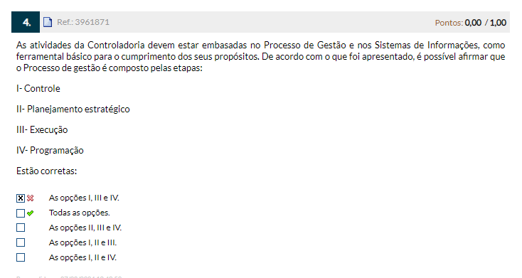 <p>4. 3961871 Pontos: As atividades da Controladoria devem estar embasadas no Processo de Gestão e nos Sistemas de como ferramental básico para cumprimento dos seus propósitos. De acordo com que foi apresentado, é possível afirmar que Processo de gestão é composto pelas etapas: Controle II- Planejamento estratégico III- Execução IV- Programação Estão corretas: As opções I. III e IV. Todas as opções. As opções III e IV. As opções I. II e III. As opções II e IV.</p>