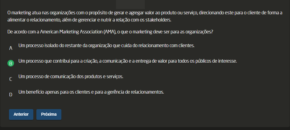 <p>marketing atua nas organizações com propósito de gerar e agregar valor ao produto ou serviço, direcionando este para cliente de forma a alimentar relacionamento, além de gerenciar e nutrir a relação com os stakeholders. De acordo com a American Marketing Association (AMA), que marketing deve ser para as organizações? A Um processo isolado do restante da organização que cuida do relacionamento com clientes. B Um processo que contribui para a criação, a comunicação e a entrega de valor para todos os públicos de interesse. C Um processo de comunicação dos produtos e serviços. D Um benefício apenas para clientes e para a gerência de relacionamentos. Anterior Próxima</p>