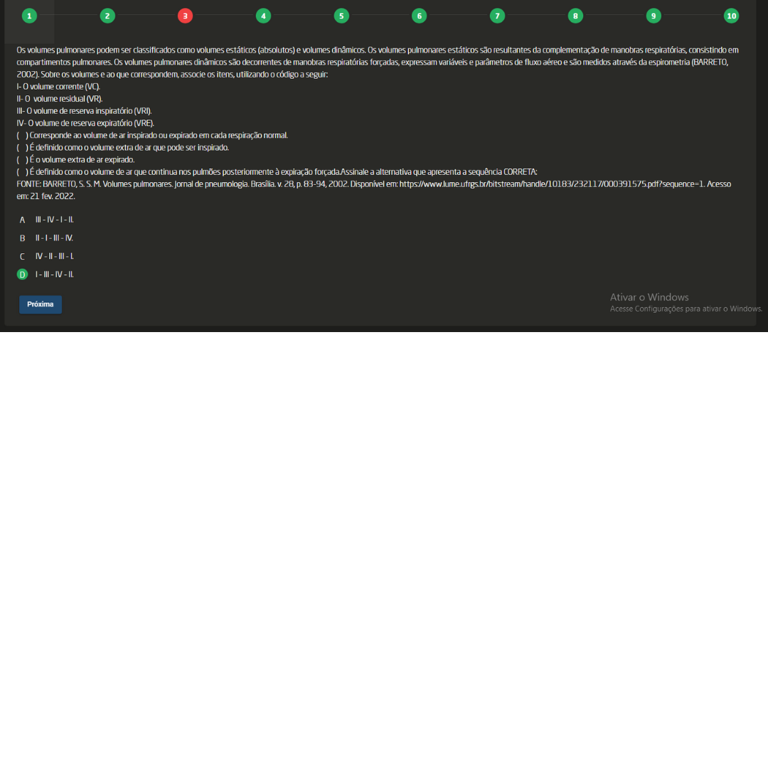 <p>1 2 4 5 7 9 10 Os volumes pulmonares podem ser classificados como volumes estáticos (absolutos) e volumes Os volumes pulmonares estáticos são resultantes da complementação de manobras respiratórias, consistindo em compartimentos Os volumes pulmonares dinâmicos são decorrentes de manobras respiratórias forçadas, expressam variáveis e parâmetros de fluxo aéreo e são medidos através da espirometria (BARRETO, 2002) Sobre volumes e ao que correspondem, associe os itens, utilizando código a volume corrente (VC) volume residual III- volume de reserva inspiratório (VRI) volume de reserva expiratório (VRE). ( )Corresponde ao volume de inspirado ou expirado em cada respiração normal definido como volume extra de ar que pode ser inspirado. ( )É volume extra de ar definido como volume de que continua nos pulmões posteriormente à expiração a alternativa que apresenta a sequência CORRETA: BARRETO, S M. Volumes Jornal de pneumologia Brasília 28, p 2002. Disponível Acesso 21 fev. 2022. A IV IV D IV Ativar O Windows Próxima Acesse Configurações para ativar O Windows</p>