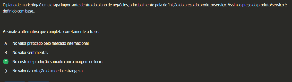 <p>0 plano de marketing é uma etapa importante dentro do plano de negócios, principalmente pela definição do preço do produto/serviço. Assim, preço do produto/serviço é definido com base... Assinale a alternativa que completa corretamente a frase: A No valor praticado pelo mercado internacional. B No valor sentimental. C No custo de produção somado com a margem de lucro. D No valor da cotação da moeda estrangeira.</p>