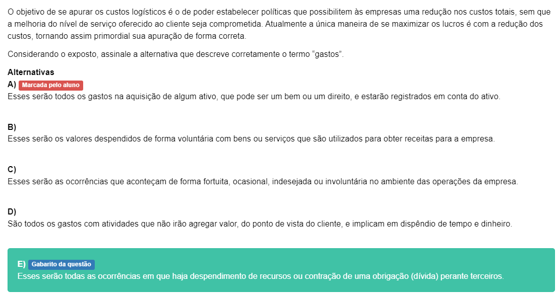 <p>objetivo de se apurar os custos logísticos é o de poder estabelecer políticas que possibilitem às empresas uma redução nos custos totais, sem que a melhoria do nível de serviço oferecido ao cliente seja comprometida. Atualmente a maneira de se maximizar os lucros é com a redução dos custos, tornando assim primordial sua apuração de forma correta. Considerando o exposto, assinale a alternativa que descreve corretamente termo "gastos". Alternativas A) Marcada pelo aluno Esses serão todos os gastos na aquisição de algum ativo, que pode ser um bem ou um direito, e estarão registrados em conta do ativo. B) Esses serão os valores despendidos de forma voluntária com bens ou serviços que são utilizados para obter receitas para a empresa. C) Esses serão as ocorrências que aconteçam de forma fortuita, ocasional, indesejada ou involuntária no ambiente das operações da empresa. D) São todos os gastos com atividades em dispêndio de tempo e dinheiro E) Gabarito da questão Esses serão todas as ocorrências em que haja despendimento de recursos ou contração de uma obrigação (dívida) perante terceiros.</p>