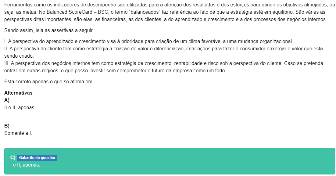 <p>Ferramentas como os indicadores de desempenho são utilizadas para a aferição dos resultados e dos esforços para atingir os objetivos almejados, ou seja, as metas. No Balanced ScoreCard - BSC, o termo "balanceados" faz referência ao fato de que a estratégia está em equilíbrio. São várias as perspectivas ditas importantes, são elas: as financeiras, as dos clientes, a do aprendizado e crescimento e a dos processos dos negócios internos. Sendo assim, leia as assertivas a seguir. I. A perspectiva do aprendizado e crescimento visa à prioridade para criação de um clima favorável a uma mudança organizacional. II. A perspectiva do cliente tem como estratégia a criação de valor e diferenciação, criar ações para fazer consumidor enxergar valor que está sendo A perspectiva dos negócios internos tem como estratégia de crescimento, rentabilidade e risco sob a perspectiva do cliente. Caso se pretenda entrar em outras regiões, que posso investir sem comprometer futuro da empresa como um todo Está correto apenas que se afirma em: Alternativas A) II e II, apenas. B) Somente a I. C) Gabarito da questão I e II,</p>