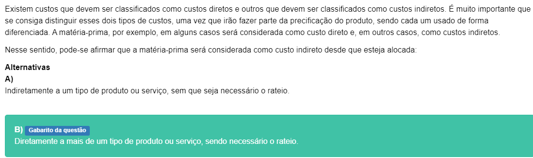 <p>Existem custos que devem ser classificados como custos diretos e outros que devem ser classificados como custos É muito importante que se consiga distinguir esses dois tipos de custos, uma vez que irão fazer parte da precificação do produto, sendo cada um usado de forma diferenciada. A matéria-prima, por exemplo, em alguns casos será considerada como custo direto e, em outros casos, como custos indiretos. Nesse sentido, pode-se afirmar que a matéria-prima será considerada como custo indireto desde que esteja alocada: Alternativas A) Indiretamente a um tipo de produto ou serviço, sem que seja necessário rateio. B) Gabarito da questão Diretamente a mais de um tipo de produto ou serviço, sendo necessário rateio.</p>