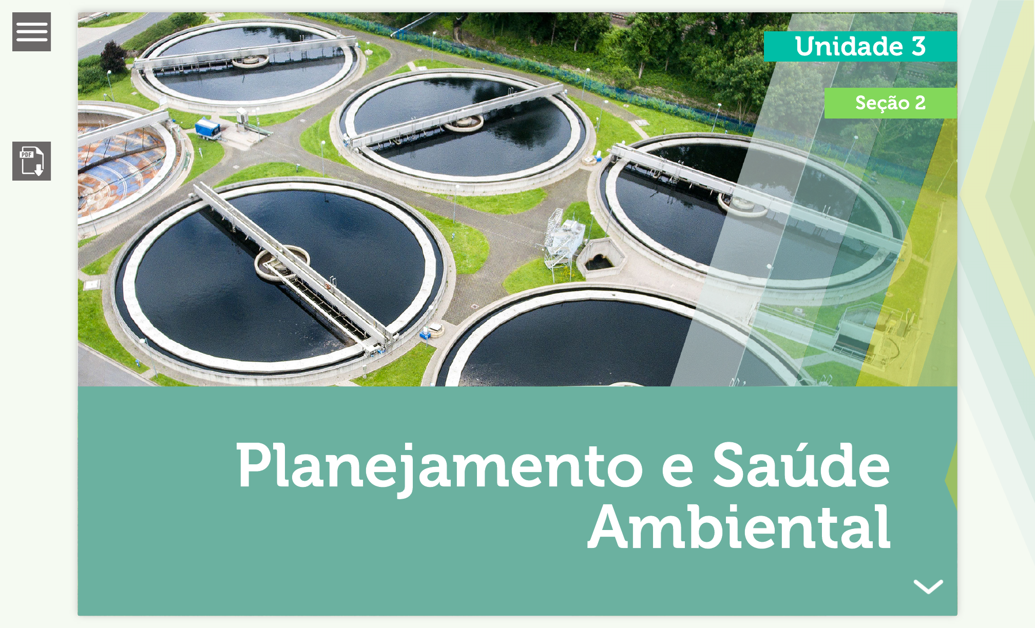 <p>0</p><p>Unidade 3</p><p>Seção 2</p><p>Planejamento e Saúde</p><p>Ambiental</p><p>http://wa01171-u3s2-planejamento-e-saude-ambie.webflow.io/pdf/webaula.pdf</p><p>1</p><p>Webaula 2</p><p>Abastecimento de Água</p><p>Experimente</p><p>http://wa01171-u3s2-planejamento-e-saude-ambie.webflow.io/pdf/webaula.pdf</p><p>Os objetivos desta seção são:</p><p>Conhecer o processo de abastecimento de água.</p><p>Compreender o sistema de esgoto.</p><p>Compreender os sólidos urbanos.</p><p>2</p><p>http://wa01171-u3s2-planejamento-e-saude-ambie.webflow.io/pdf/webaula.pdf</p><p>Paulo, morador do bairro São Benedito, está</p><p>estudando sobre saneamento básico na</p><p>escola e tem de apresentar um trabalho sobre</p><p>resíduos sólidos. Avaliando seu bairro,</p><p>constatou que não existe coleta de lixo, todo</p><p>tipo de resíduo produzido no bairro é jogado</p><p>nos terrenos baldios, ficando expostos a céu</p><p>aberto. Além disso, existem pessoas que</p><p>sobrevivem do lixo ali despejado.</p><p>Situação-Problema</p><p>Fonte: Istockphoto (2016)</p><p>Avaliando esta situação, o que Paulo poderia elencar como estratégias para o</p><p>gerenciamento dos resíduos sólidos do bairro?</p><p>3</p><p>http://wa01171-u3s2-planejamento-e-saude-ambie.webflow.io/pdf/webaula.pdf</p><p>No abastecimento de água, além de atender</p><p>uma grande demanda, os padrões de</p><p>potabilidade devem ser analisados por meio</p><p>de exames físicos, químicos e bacteriológicos,</p><p>que avaliarão as condições da água para o</p><p>consumo humano.</p><p>Abastecimento de Água</p><p>Fonte: Istockphoto (2016)4</p><p>http://wa01171-u3s2-planejamento-e-saude-ambie.webflow.io/pdf/webaula.pdf</p><p>O volume no consumo de água cresceu</p><p>muito e o desperdício também. Tarefas</p><p>cotidianas da vida social, como tomar um</p><p>banho demorado, lavar o carro</p><p>constantemente ou utilizar a água como</p><p>vassoura para limpeza de calçadas, são</p><p>realizadas sem a menor cerimônia e com</p><p>descaso pela maioria da população. Soma-se</p><p>a isso que a água é matéria-prima de grande</p><p>importância (como nos processos produtivos</p><p>de gêneros alimentícios, farmacêuticos, têxtil,</p><p>químicos e outros) e, se não fosse o</p><p>reaproveitamento desse recurso em muitas</p><p>linhas de produção, a situação seria</p><p>catastrófica.</p><p>Fonte: Istockphoto (2016)5</p><p>http://wa01171-u3s2-planejamento-e-saude-ambie.webflow.io/pdf/webaula.pdf</p><p>O esgoto sanitário é um despejo líquido</p><p>constituído de esgoto doméstico e industrial,</p><p>água de infiltração e contribuição parasitária,</p><p>que se não for corretamente coletada e</p><p>tratada, pode ocasionar a proliferação das</p><p>doenças já citadas e agregar ainda mais</p><p>custos para todo tratamento no sistema, com</p><p>os quais o próprio consumidor terá de arcar</p><p>em seus impostos.</p><p>Redes de Esgoto</p><p>Fonte: Istockphoto (2016)6</p><p>http://wa01171-u3s2-planejamento-e-saude-ambie.webflow.io/pdf/webaula.pdf</p><p>As áreas que causam mais preocupação são as regiões rurais e as mais carentes, sendo que</p><p>nesta última a questão é puramente social, pois as populações mais pobres ali se refugiam</p><p>para adquirir moradias não legalizadas, ficando, assim, sujeitos à inexistência de saneamento</p><p>básico, sem serviços de coleta de lixo e vivendo em condições insalubres, típicas das</p><p>ocupações descontroladas das periferias, das quais surgem favelas e bairros não planejados</p><p>nos planos diretores de urbanização dos municípios.</p><p>Fonte: Istockphoto (2016)7</p><p>http://wa01171-u3s2-planejamento-e-saude-ambie.webflow.io/pdf/webaula.pdf</p><p>Fossas sépticas são um tipo de tratamento</p><p>primário de esgoto doméstico, nas quais são</p><p>realizadas a separação e a transformação</p><p>físico-químico da matéria sólida contida no</p><p>esgoto. Porém, o tratamento não é completo</p><p>como em uma estação de tratamento de</p><p>esgoto.</p><p>Disponível em: <https://goo.gl/tIqwmG>. Acesso em: 21 fev. 2017.8</p><p>https://goo.gl/tIqwmG</p><p>http://wa01171-u3s2-planejamento-e-saude-ambie.webflow.io/pdf/webaula.pdf</p><p>9</p><p>Webaula 2</p><p>Teoria Organizacional</p><p>Explore</p><p>http://wa01171-u3s2-planejamento-e-saude-ambie.webflow.io/pdf/webaula.pdf</p><p>O resíduo sólido urbano, geralmente</p><p>chamado de lixo, consiste em resíduos sólidos</p><p>produzidos por residências e locais de</p><p>trabalho, exceto fábricas. Alguns exemplos de</p><p>tipo de resíduos: papel, papelão, restos de</p><p>alimentos, garrafas, lixo de jardim, móveis,</p><p>plásticos, metais, vidros, madeiras e resíduo</p><p>eletrônico.</p><p>Muito desse lixo é jogado e acaba indo parar</p><p>nos rios, lagos, oceanos e lixões a céu aberto.</p><p>Fonte: Istockphoto (2017)10</p><p>http://wa01171-u3s2-planejamento-e-saude-ambie.webflow.io/pdf/webaula.pdf</p><p>Clique nos itens a seguir para ver algumas sugestões de destino para o lixo:</p><p>Primeira</p><p>Prioridade</p><p>Segunda</p><p>Prioridade</p><p>Terceira</p><p>Prioridade</p><p>Poluição primária e prevenção de resíduos.</p><p>Mudar o processo industrial para eliminar o uso de substâncias químicas perigosas.</p><p>Usar menos produtos perigosos.</p><p>Reduzir embalagens e materiais de produtos.</p><p>Fabricar produtos que durem mais e sejam recicláveis, reutilizáveis ou fáceis de</p><p>consertar.</p><p>11</p><p>http://wa01171-u3s2-planejamento-e-saude-ambie.webflow.io/pdf/webaula.pdf</p><p>Para ampliar seus conhecimentos leia folder Manejo de resíduos</p><p>sólidos urbanos.</p><p>Disponível em: <https://goo.gl/zkAyVM>. Acesso em: 14 fev. 2017.</p><p>Link</p><p>12</p><p>https://goo.gl/zkAyVM</p><p>http://wa01171-u3s2-planejamento-e-saude-ambie.webflow.io/pdf/webaula.pdf</p><p>Android: https://goo.gl/yAL2Mv</p><p>iPhone e iPad - IOS: https://goo.gl/OFWqcq</p><p>Aqui você tem n