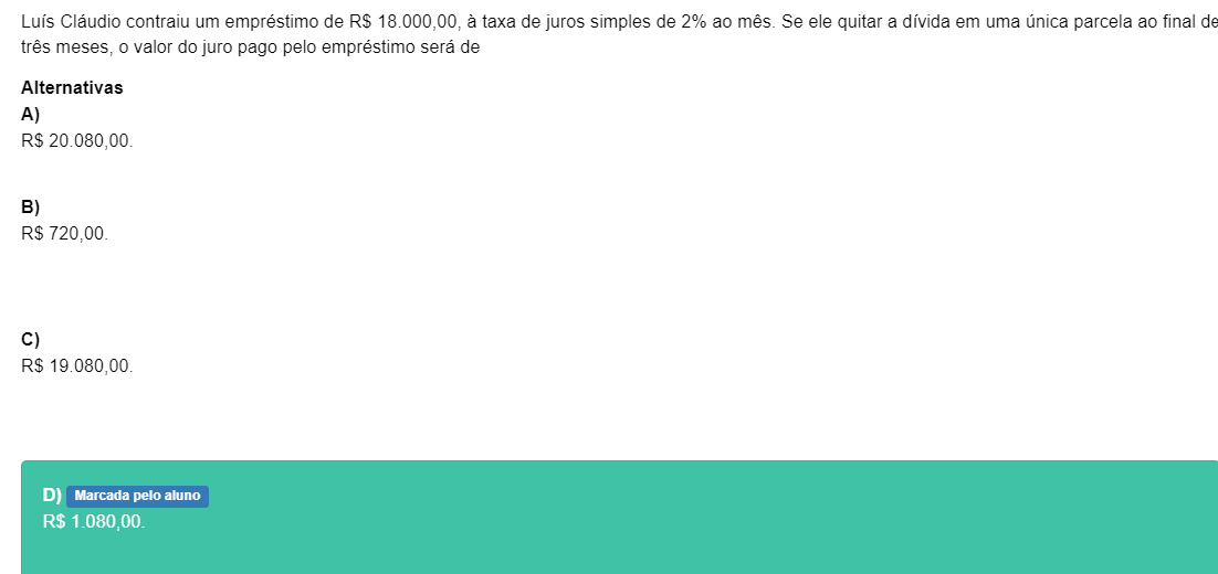 <p>Cláudio contraiu um empréstimo de R$ 18.000,00, à taxa de juros simples de 2% ao mês. Se ele quitar a dívida em uma única parcela ao final de três meses, o valor do juro pago pelo empréstimo será de Alternativas A) R$ B) C) D) Marcada pelo aluno R$</p>