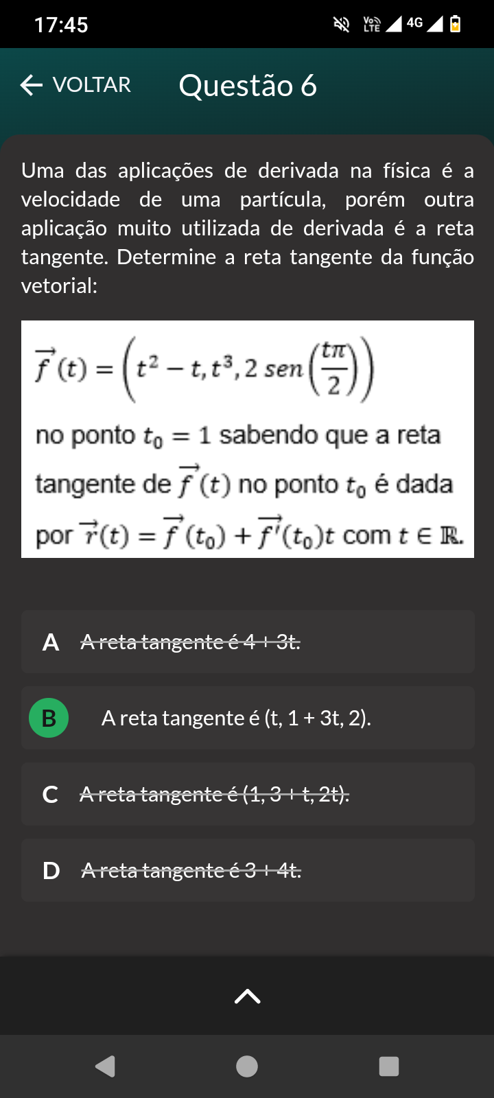 <p>17:45 4G LTE VOLTAR Questão 6 Uma das aplicações de derivada na física é a velocidade de uma partícula, porém outra aplicação muito utilizada de derivada é a reta tangente. Determine a reta tangente da função vetorial: = - t, , 2 sen 2 no ponto to = 1 sabendo que a reta tangente de f (t) no ponto to é dada por r(t) =f(to) + f'(to)t com t E R. A Aretatangente é 4+3t. A reta tangente é (t, Aretatangente é D Areta tangente é</p>