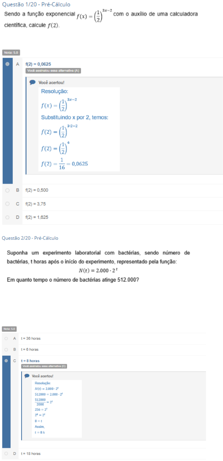 <p>Questão 1/20 - Pré-Cálculo 3x-2 Sendo a função exponencial com o auxílio de uma calculadora calcule f(2). Nota: 5.0 A f(2) = 0,0625 essa (A) Você acertou! Resolução: Substituindo por 2, temos: 3-2-2 4 = 1 16 B f(2)=0,500 C f(2)=3,75 D f(2) = 1.625 Questão 2/20 - Pré-Cálculo Suponha um experimento laboratorial com bactérias, sendo de bactérias, t horas após início do experimento, representado pela função: N(t) = 2.000 . Em quanto tempo número de bactérias atinge 512.000? Nota 5.0 A t= 36 horas B t=6 horas C t=8 horas assinalou essa Você acertou! Resolução N(t) 512000 512000 2000 256 & 8A D t= 18 horas</p><p>Questão 3/20 - Pré-Cálculo Calcule a função afim (polinomial de primeiro grau) que satisfaça a condição: f(-1) . 2 e f(2) . Nota: 5.0 A f(x)=x-4 B f(x)=x+4 C f(x)=2x-4 D f(x)= 2x + 4 (D) Você acertou! Sendo y Substituindo os temos o seguinte sistema: Multiplicando a linha por Somando as duas linhas do sistema, + =6 Substituindo o valor de na linha do sistema - b = 2 -2+b=2 b=2+2 4 Portanto, Substituindo os valores de a=2 e b=4 na forma genérica t(x) - = ax +b Temos a resposta f(x) = 2x + 4. Questão 4/20 - Pré-Cálculo Calcule o valor, em graus, do arco cujo sec(a) = -2 que está no 2° quadrante. Nota: 5.0 A 210° B 30° C essa alternativa (C) Você acertou! Resolução: sec 120° D</p><p>Questão 5/20 - Pré-Cálculo Sendo f(x) = e g(x) Com isso determine a função composta f(g(x)). 50 A essa (A) Você acertou! Resolução: f(g(x)) = 2[g(x)] + 1 f(g(x)) = 2(x+1)+ 1 f(g(x)) = 2x +2 +1 f(g(x)) = 2x + 3 B f(g(x))=2x f(g(x)) = 2x+2 D f(g(x)) = 2x + 4 Questão 6/20 - Pré-Cálculo Calcule o valor, em graus, do arco cujo = que está no quadrante. 2 Nota: 5.0 A (A) Você acertou! Resolução: 1 sen a = 2 1 a = arcsen 2 B 60° C D</p><p>Questão 7/20 - Pré-Cálculo Transforme rad em graus: 5 Nota: 5.0 A B 72° assinalou essa (B) Você acertou! Resolução: 180° = II rad 2n rad 5 XII = 5 C 130° D Questão 8/20 - Pré-Cálculo Sendo a função exponencial f(x) = com o auxilio de uma calculadora calcule f(3) Nota: 5.0 A C essa (C) Você acertou! Substituindo por D f(3)=6</p><p>Questão 9/20 Pré-Cálculo Uma empresa de planos de saúde tem duas opções que oferece para os seus As duas opções apresentam as mesmas coberturas carências diferem apenas nos preços plano tem uma mensalidade de cada consulta agendada cliente paga um adicional de plano B tem uma mensalidade de R$ 500.00 mais R$ 30.00 para cada consulta agendada No caso de cliente precisar fazer exames, cirurgias ou qualquer outro não há custo Sendo assim, determine em função do número de consultas mensais serem qual dos dois planos mais A Até 10 consultas Plano mais vantajoso, acima de 10 consultas o Plano B vantajoso, para 10 consultas ambos apresentam mesmo Você Resolução: Usando como valor de referência à quantidade de consultas, temos: Calculando a quantidade na qual os planos se equivalem 20x=200 200/20 10 Resposta Até 10 consultas o Plano A mais acima de 10 consultas Plano vantajoso, para 10 consultas ambos apresentam mesmo B Até 20 consultas Plano mais acima de 20 consultas o Plano B vantajoso, para 20 consultas ambos apresentam mesmo valor Até 30 consultas Plano mais acima de 30 consultas Plano B para 30 consultas ambos apresentam mesmo valor Até 15 consultas mais acima de 15 consultas Plano B para 15 consultas ambos apresentam mesmo valor Questão 10/20 - Pré-Cálculo Dada a função , calcule f(3). Nota: 5.0 A B C f(3) = Você acertou! Resolução: D f(3) = 3 Questão 11/20 - Pré-Cálculo Sendo f(x) = 3x - 1. Calcule f(1). Nota: 5.0 A f(1)=2 assinalou alternativa (A) Você acertou! Resolução: f(1)=3.1-1 f(1) 3 1 f(1) 2 B 3 C f(1)=1 D</p><p>Questão 12/20 - Pré-Cálculo Sabendo que f(x) = qual é o valor de f(2)? Nota: A f(2)=4 alternativa Você acertou! Resolução: f(2)=8 f(2)=9 Questão 13/20 - Pré-Cálculo Qual o ângulo agudo formado entre os ponteiros do relógio quando é marcada a hora 3h e 15 minutos? Nota: A 45° B 30° C 15° D (D) Você acertou! Resolução: ponteiro dos minutos está na marca de 15 minutos, essa é uma marcação fixa, portanto não precisamos verificar o Sabendo que o ponteiro das horas percorre 30° em 60 minutos, logo em 15 minutos ele percorrerá Sendo assim, o ângulo formado entre os ponteiros será de</p><p>Questão 14/20 - Pré-Cálculo Classifique, em relação aos o formado pelos lados de medidas 12cm, 9cm e 15cm. Nota: 5.0 A Triângulo agudo Triângulo retângulo alternativa (B) Você acertou! Resolução: Fazendo a=15 b=12 temos: = = 144 e Como ou seja, 225 = 225, o é Triângulo obtuso D As medidas não Questão 15/20 Dada a função Qual o domínio dessa função? Nota: A x > - para valores B > 0, para valores C x < para valores D > 2, para valores Reais. (D) Você acertou! Resolução: Por se tratar de uma raiz quadrada no denominador, temos que o domínio da função: para valores Reais.</p><p>Questão 16/20 - Pré-Cálculo Qual é o domínio da função Nota: A -3, para valores Reais. B 3, para valores Reals. assinalou alternativa (B) Você acertou! Resolução: para valores C - para valores D x 3, para valores Reais. Questão 17/20 - Pré-Cálculo Selecione a alternativa que corresponde ao da seguinte expressão Nota: 5.0 A , para valores Reals. x 5 alternativa (A) Você acertou! Resolução: para valores Reais. B # 5. para valores C x # -5, para valores Reals. D x # 25, para valores</p><p>Questão 18/20 - Pré-Cálculo Calcule as raízes da a função quadrática Nota: A C D assinalou essa (D) Você acertou! Seguindo modelo f(x) - + bx + - 0 que a=1, c=7. Usando a quadrática de Desta I forma: 2 Sendo assim, 14 Questão 20/20 - Pré-Cálculo Transforme 144° em radianos: Nota: Questão 19/20 Pré-Cálculo Qual a medida em graus do rad ? A rad essa (A) Nota: 5.0 Você acertou! A Resolução: 180° rad C 180x = 144 (C) 144 Você acertou! Resolução: 180° = rad rad B rad C = D D 60°</p>