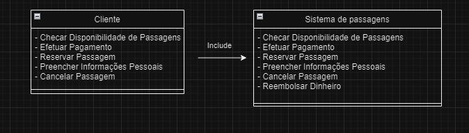 <p>Cliente Sistema de passagens - Checar Disponibilidade de Passagens - Checar Disponibilidade de Passagens Efetuar Pagamento Include - - Efetuar Pagamento - Reservar Passagem - Reservar Passagem - Preencher Informações Pessoais - Preencher Informações Pessoais - Cancelar Passagem - Cancelar Passagem - Reembolsar Dinheiro</p>