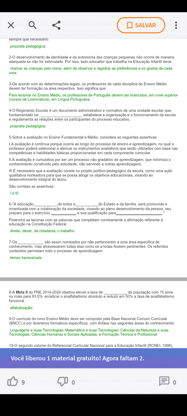 <p>X SALVAR sempre que proposta 2-O desenvolvimento da identidade e da autonomia das crianças pequenas não ocorre de maneira adequada se não for estimulado. Por todo educador que trabalha na Educação Infantil deve: chamar as crianças pelo nome, além de observar e registrar as preferências e os gostos de cada uma. 3-De acordo com as determinações legais, os professores de cada disciplina do Ensino Médio devem ter formação na área respectiva. Isso significa que: Para lecionar no Ensino Médio, os professores de Português devem ser licencidos, em nível superior (cursos de Licenciatura), em Língua Portuguesa. 4-O Regimento Escolar é um documento administrativo e normativo de uma unidade escolar que, fundamentado na estabelece a organização e funcionamento da escola e regulamenta as relações entre os participantes do processo educativo. proposta pedagógica. 5-Sobre a avaliação no Ensino Fundamental e Médio, considere as seguintes assertivas: I.A avaliação é contínua porque ocorre ao longo do processo de ensino e aprendizagem, no qual o professor poderá selecionar e elencar os instrumentos avaliativos que serão utilizados com base nas competências e habilidades básicas proporcionadas em cada componente ILA avaliação é cumulativa por ser um processo não gradativo de aprendizagem, que minimiza conhecimento construído pelo estudante, não servindo a outras aprendizagens. necessário que a avaliação conste no projeto político-pedagógico da escola. como uma ação qualitativa norteadora para que se possa atingir os objetivos visando ao desenvolvimento integral do aluno. São corretas as assertivas: III. 6-"A educação, de todos e do Estado e da família, será promovida e incentivada com a colaboração da visando ao pleno desenvolvimento da pessoa, seu preparo para exercício e sua qualificação para Preencha as lacunas com as palavras que completam corretamente a afirmação referente à educação na Constituição direito, dever, da cidadania, o trabalho. 7-Os são assim nomeados por não pertencerem a uma área específica de conhecimento, mas atravessarem todas elas como se a todas fossem pertinentes. Os referidos conteúdos permeiam todo o processo de aprendizagem. temas 8-A Meta 9 do PNE 2014-2024 objetiva elevar a taxa de da população com 15 anos ou mais para 93,5%, erradicar analfabetismo absoluto e reduzir em 50% a taxa de analfabetismo funcional alfabetização. 9-O currículo do novo Ensino Médio deve ser composto pela Base Nacional Comum Curricular (BNCC) e por itinerários formativos específicos, com ênfase nas seguintes áreas do conhecimento: Linguagens e suas e suas Ciências da Natureza e suas Ciências Humanas e Sociais Aplicadas; e Formação Técnica e 10-O segundo volume do Referencial Curricular Nacional para a Educação Infantil (RCNEI, 1998), Você liberou 1 material gratuito! Agora faltam 2. 9 0 0</p>
