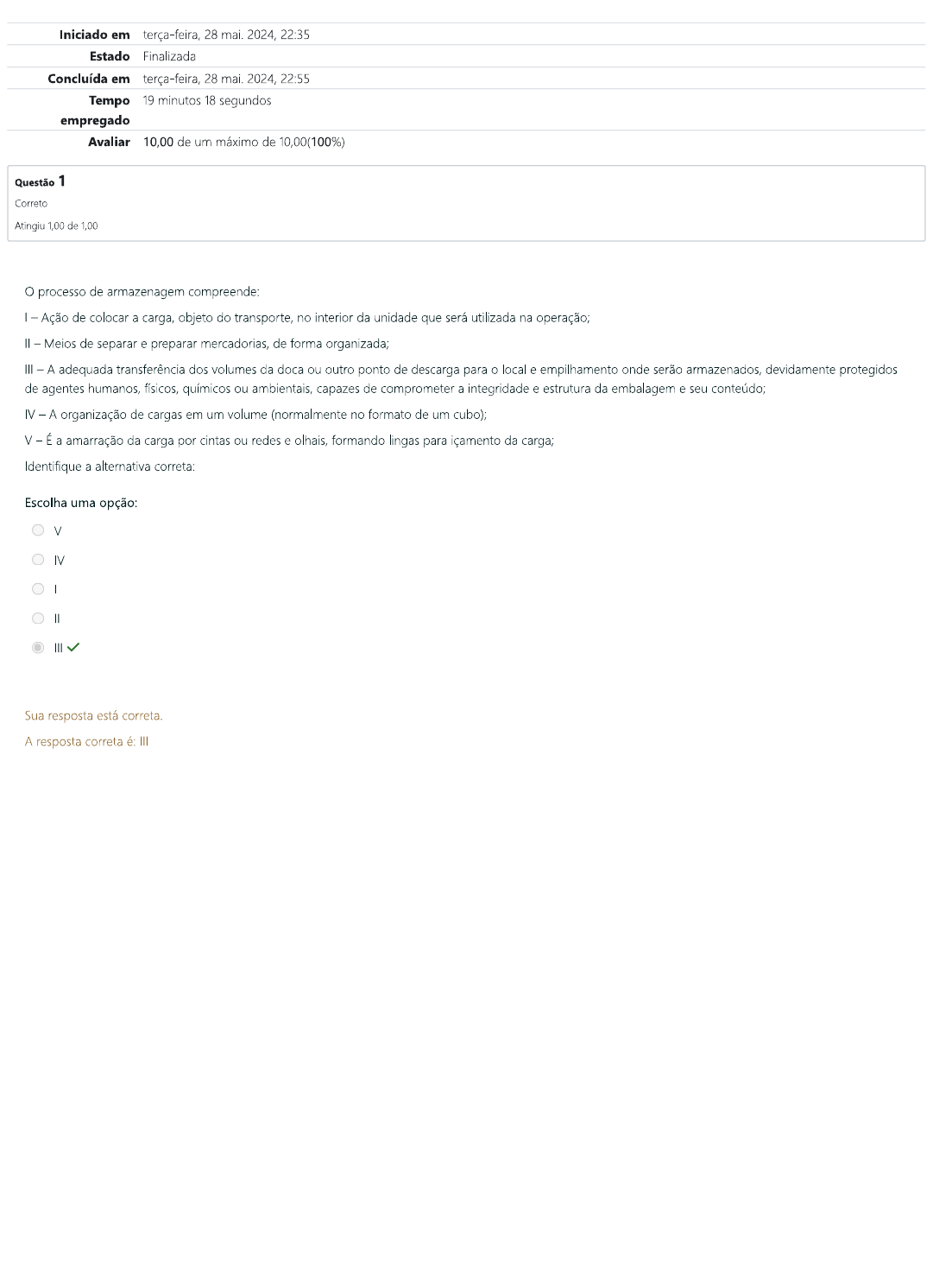 <p>Iniciado em terça-feira, 28 mai. 2024, 22:35 Estado Finalizada Concluída em terça-feira, 28 mai. 2024, 22:55 Tempo 19 minutos 18 segundos empregado Avaliar 10,00 de um máximo de 10,00(100%) Questão 1 Correto Atingiu 1,00 de 1,00 O processo de armazenagem compreende: I - Ação de colocar a carga, objeto do transporte, no interior da unidade que será utilizada na operação; II - Meios de separar e preparar mercadorias, de forma organizada; III - A adequada transferência dos volumes da doca ou outro ponto de descarga para o local e empilhamento onde serão armazenados, devidamente protegidos de agentes humanos, físicos, químicos ou ambientais, capazes de comprometer a integridade e estrutura da embalagem e seu conteúdo; IV - A organização de cargas em um volume (normalmente no formato de um cubo); V - É a amarração da carga por cintas ou redes e olhais, formando lingas para da carga; Identifique a alternativa correta: Escolha uma opção: V IV III Sua resposta está correta. A resposta correta é: III</p><p>Questão 2 Correto Atingiu 1,00 de 1,00 A logística de armazenagem, no âmbito da cadeia de suprimentos de uma empresa, abrange as atividades do armazém relativas a guardar, proteger e conservar corretamente as mercadorias durante período necessário. Da mesma forma, também trata da gestão, transporte, localização, manuseio e acondicionamento desses itens desde seu recebimento até sua expedição. O armazém é a peça-chave que permite regular fluxo de mercadorias entre a oferta e a Nele se concentra a gestão dos materiais que a empresa move, guarda e manuseia para atender às suas necessidades comerciais e produtivas. O armazém é, portanto, eixo central da logística de armazenagem A respeito da armazenagem, avalie as alternativas. - - Acredita-se que a armazenagem é segura se promover boas negociações; - Produtos oriundos das indústrias, costumam ser armazenadas em áreas cobertas; III - Contêineres, veículos, cargas de grande porte e maquinários geralmente são armazenados em pátios; IV - A armazenagem não é aconselhada para produtos derivados da indústria; V - processo de armazenagem não compreende a adequada transferência dos volumes da doca ou outro ponto de descarga para o local e empilhamento onde serão armazenados; É correto que se afirma em: Escolha uma opção: V IV III III le IV Sua resposta está correta. A resposta correta é: e III</p><p>Questão 3 Correto Atingiu 1,00 de 1,00 As primeiras embalagens da história foram inspiradas na própria natureza, observando-se as cascas das frutas que protegem esses recursos naturais das ações externas. Outro aspecto relevante é que provavelmente pouco depois de o homem descobrir fogo, este fenômeno também foi utilizado para endurecer barro e transformar em objetos para cultivar a terra e preservar mantimentos. Nesse sentido, analise as alternativas: - No passado, as embalagens serviam exclusivamente para proteger e preservar conteúdos; - No passado, as embalagens eram recursos escassos; III - Na Idade Média as embalagens eram confeccionadas em madeira e barro; IV - As embalagens na Grécia antiga eram confeccionadas em granito; V - As embalagens modernas foram pensadas após a Revolução Industrial; Identifique a alternativa correta: Escolha uma opção: III IV V Sua resposta está correta. A resposta correta é:</p><p>Questão 4 Correto Atingiu 1,00 de 1,00 Existe um número crescente de empresas que começaram a repensar sua forma de utilizar embalagens. Os modelos mais comuns atualmente, de plástico, demoram para se decompor, se acumulam nos oceanos e consomem petróleo em sua produção. Já existem diversos tipos de embalagens sustentáveis, feitas com papel reciclado ou plásticos biodegradáveis, e há também modelos inusitados, desenvolvidos com leite, cogumelos, batata e até eucalipto (Fonte: No contexto dessas informações, avalie as alternativas: I - As embalagens de plástico são as mais seguras para transporte internacional; - Algumas das inúmeras vantagens em utilizar papelão como principal matéria-prima para a fabricação de embalagens é que em razão das particularidades do produto, as embalagens podem ser confeccionadas facilmente em diversos tamanhos e formatos; III A criação de embalagens seguras depende do material que vai ser transportado; IV - Para que qualquer embalagem seja considerada uma excelente opção nas operações de comércio exterior, só é preciso projetá-la com base nas operações comerciais externas; V - A oferta de boas embalagens no mercado consumidor depende dos interesses internacionais envolvidos no processo de negociação; É correto que se afirma em: Escolha uma opção: II V IV III Sua resposta está correta. A resposta correta é:</p><p>Questão 5 Correto Atingiu de 1,00 Nos últimos anos, a logística reversa foi um dos assuntos que mais recebeu destaque no cenário internacional, principalmente em função de sua representatividade para meio ambiente e suas A logística reversa se apresenta no dia a dia operacional através de ações sustentáveis desenvolvidas por empresas, que na busca por um diferencial no cenário comercial, adotam medidas sustentáveis para a promoção de suas atividades. Avalie as afirmações a seguir: I A logística reversa se destaca como uma alternativa para a progressão do fluxo de materiais, da origem, até destino; O fluxo logístico reverso é uma atividade que busca encontrar os meios de retornar produtos ou parte destes, do ponto de consumo para local de origem; III - A logística reversa promove ganho competitivo na economia, na sociedade e nas operações comerciais; IV A logística reversa planeja, implementa e controla fluxo de matérias primas, estoques e informações no consumo; V - fluxo logístico desempenha função essencial e desenvolve atividade de produção, montagem, criação, construção, transformação, importação, exportação, distribuição ou comercializ
