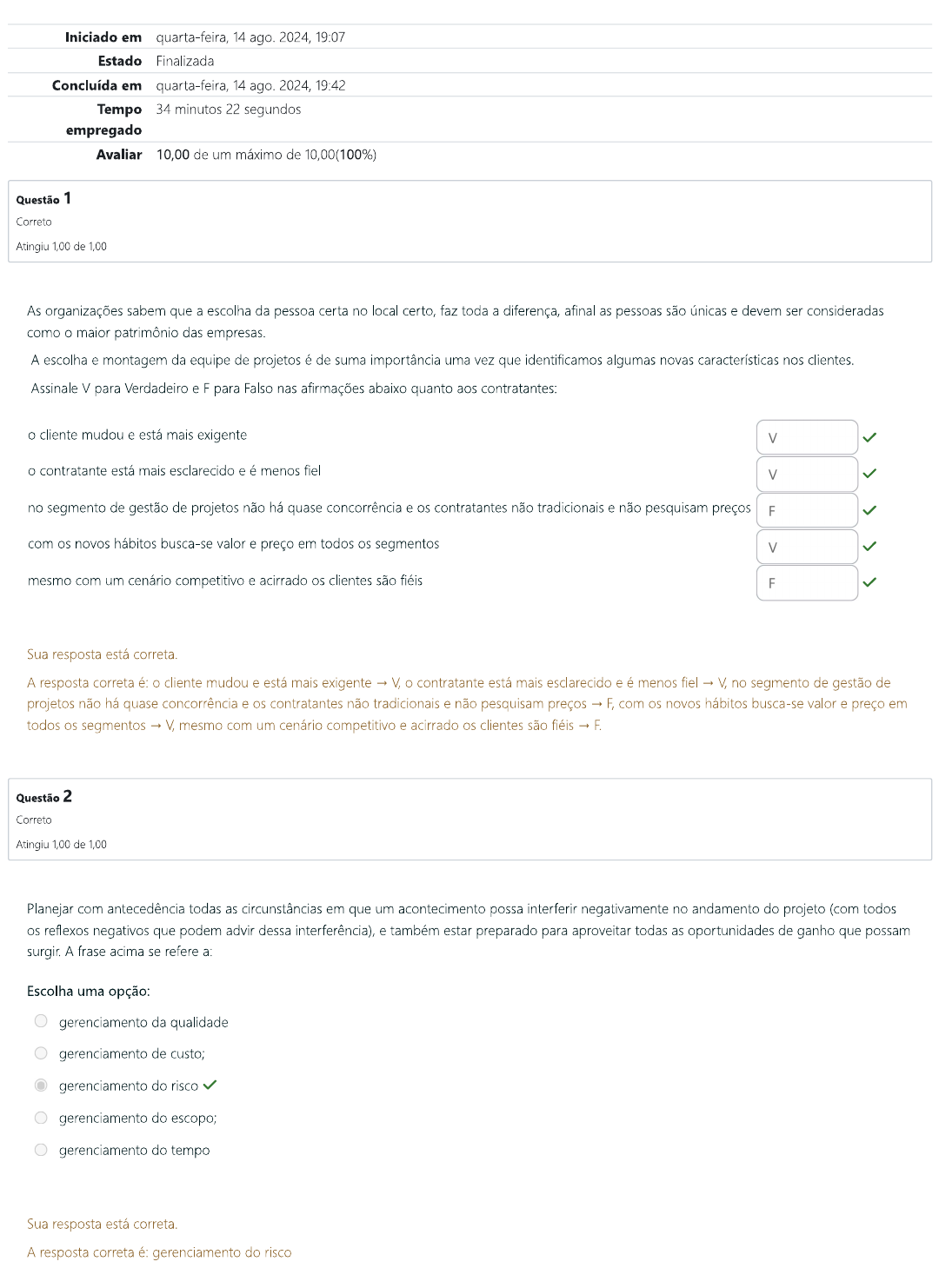<p>Iniciado em quarta-feira, 14 ago. 2024, 19:07 Estado Finalizada Concluída em quarta-feira, 14 ago. 2024, 19:42 Tempo 34 minutos 22 segundos empregado Avaliar 10,00 de um máximo de 10,00(100%) Questão 1 Correto Atingiu de As organizações sabem que a escolha da pessoa certa no local certo, faz toda a diferença, afinal as pessoas são únicas e devem ser consideradas como maior patrimônio das empresas. A escolha e montagem da equipe de projetos é de suma importância uma vez que identificamos algumas novas características nos clientes. Assinale V para Verdadeiro e F para Falso nas afirmações abaixo quanto aos contratantes: cliente mudou e está mais exigente V contratante está mais esclarecido e é menos fiel V no segmento de gestão de projetos não há quase concorrência e os contratantes não tradicionais e não pesquisam preços F com os novos hábitos busca-se valor e preço em todos os segmentos V mesmo com um cenário competitivo e acirrado os clientes são fiéis F Sua resposta está correta. A resposta correta é: cliente mudou e está mais exigente -> V, O contratante está mais esclarecido e é menos fiel - V, no segmento de gestão de projetos não há quase concorrência e os contratantes não tradicionais e não pesquisam preços - F, com os novos hábitos busca-se valor e preço em todos os segmentos -> V, mesmo com um cenário competitivo e acirrado os clientes são fiéis - F. Questão 2 Correto Atingiu 1,00 de 1,00 Planejar com antecedência todas as circunstâncias em que um acontecimento possa interferir negativamente no andamento do projeto (com todos os reflexos negativos que podem advir dessa e também estar preparado para aproveitar todas as oportunidades de ganho que possam surgir. A frase acima se refere a: Escolha uma opção: gerenciamento da qualidade gerenciamento de custo; gerenciamento do risco gerenciamento do escopo; gerenciamento do tempo Sua resposta está correta. A resposta correta é: gerenciamento do risco</p><p>Questão 3 Correto Atingiu 1,00 de 1,00 O que é Project Model Canvas? Onde se aplica? Resposta: O Project Model Canvas é uma metodologia robusta de gerenciamento de projetos, sem preenchimento de inúmeros documentos e sem burocracia. Considere esta afirmativa Falsa ou Verdadeira: Escolha uma opção: Verdadeiro Falso A resposta correta é Questão 4 Correto Atingiu 1,00 de 1,00 O que são softwares de Gestão de Projetos? Quais os mais utilizados? Escolha uma opção: São as ferramentas: MS Project; PRINCE2; Primavera P6; Scrum Half; Constru Manager; Project Builder; SOLE; ARTIA; etc. São ferramentas tecnológicas, as quais não auxiliam no gerenciamento e controle das atividades de um projeto, mostrando as dependências entre as tarefas, os recursos necessários e os custos do projeto. Os mais utilizados são: MS Project; PRINCE2; Primavera P6; Scrum Half; Constru Manager; Project Builder; SOLE; ARTIA; etc. São ferramentas tecnológicas para auxiliar no gerenciamento e controle das atividades de um projeto, mostrando as dependências entre as tarefas, os recursos necessários e os custos do projeto. Os mais utilizados são: MS Project; PRINCE2; Primavera P6; Scrum Half; Constru Manager; Project Builder; SOLE; ARTIA; etc. Nenhuma das alternativas Sua resposta está correta. A resposta correta é: São ferramentas tecnológicas para auxiliar no gerenciamento e controle das atividades de um projeto mostrando as dependências entre as tarefas, os recursos necessários e os custos do projeto. Os mais utilizados são: MS Project; PRINCE2; Primavera P6; Scrum Half; Constru Manager; Project Builder; SOLE ARTIA; etc.</p><p>Questão 5 Correto Atingiu de 1,00 A fase de encerramento do projeto pode ser iniciada quando processo de monitorar e controlar indicar que escopo do projeto foi entregue ou quando, porventura, houver cancelamento do projeto por alguma razão. II) Durante a fase de encerramento do projeto é realizado uma série de procedimentos no sentido de haver uma formalização das entregas totais de produtos e serviços aos devidos clientes, patrocinadores do projeto. III) A formalização do encerramento dos contratos pode ser realizada levando em consideração fato de que todos os produtos e serviços foram entregues, pagos e aceitos como previsto nos contatos iniciais entre as partes. Podemos AFIRMAR que: Escolha uma opção: As assertivas II) e III) são corretas e se complementam A assertiva é correta e complementa e justifica a assertiva que também é correta, sendo a III) incorreta As três assertivas são incorretas e fora da contextualização de encerramento de um projeto A assertiva é correta e a e III) são incorretas As assertivas II) e III) são corretas e a I) incorreta Sua resposta está correta. A resposta correta é: A assertiva II) é correta e complementa e justifica a assertiva que também é correta, sendo a III) incorreta Questão 6 Correto Atingiu 1,00 de 1,00 Cite 03 (três) funções do Patrocinador do Projeto. cabe ao Patrocinador do Projeto estimular envolvimento do gestor do projeto e dos gerentes funcionais; II) a ação de arbitrar os conflitos que não forem possíveis de serem resolvidos pelos demais gerentes e, III) assegurar que as decisões acordadas sejam colocadas em prática, ou seja, aquilo que foi combinado e planejado deve ocorrer. Escolha uma opção: I, e III estão corretas Apenas a III está correta e II estão corretas e III estão corretas Sua resposta está correta. A resposta correta é: e III estão corretas</p><p>Questão 7 Correto Atingiu 1,00 de 1,00 Ainda refente ao Project Model Canvas: onde se aplica? Resposta: É ideal para ambientes que querem aprimorar sua capacidade de planejamento mas que se caracterizam por inovação, alta dinâmica dos negócios, muitos projetos em paralelo e nos quais soluções rígidas e engessadas não se aplicam. O Project Model Canvas concentra-se no essencial, a alma do projeto e permite com que os stakeholders participem da conc