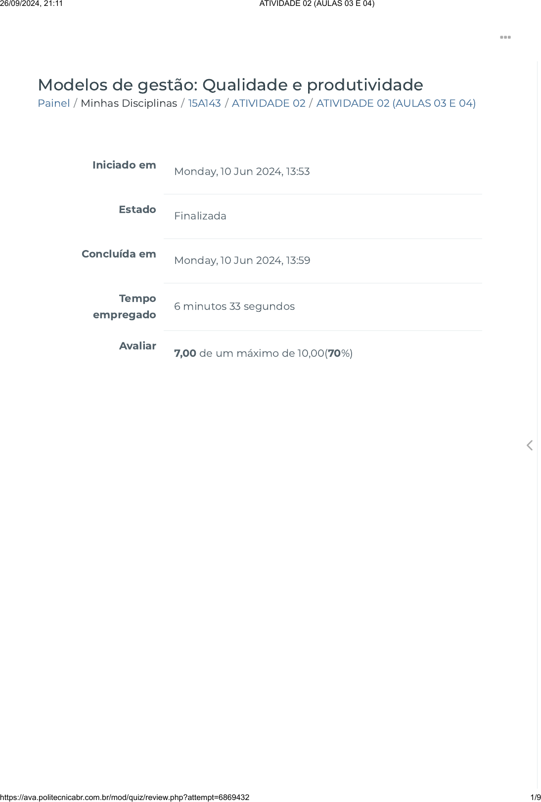 <p>Painel / Minhas Disciplinas / 15A143 / ATIVIDADE 02 / ATIVIDADE 02 (AULAS 03 E 04)</p><p>Modelos de gestão: Qualidade e produtividade</p><p>Iniciado em</p><p>Monday, 10 Jun 2024, 13:53</p><p>Estado</p><p>Finalizada</p><p>Concluída em</p><p>Monday, 10 Jun 2024, 13:59</p><p>Tempo</p><p>empregado</p><p>6 minutos 33 segundos</p><p>Avaliar</p><p>7,00 de um máximo de 10,00(70%)</p><p></p><p></p><p>26/09/2024, 21:11 ATIVIDADE 02 (AULAS 03 E 04)</p><p>https://ava.politecnicabr.com.br/mod/quiz/review.php?attempt=6869432 1/9</p><p>https://ava.politecnicabr.com.br/my/</p><p>https://ava.politecnicabr.com.br/my/</p><p>https://ava.politecnicabr.com.br/course/view.php?id=902</p><p>https://ava.politecnicabr.com.br/course/view.php?id=902#section-7</p><p>https://ava.politecnicabr.com.br/mod/quiz/view.php?id=35302</p><p>https://ava.politecnicabr.com.br/</p><p>Questão 1</p><p>Correto</p><p>Atingiu 1,50 de 1,50</p><p>É comumente conhecido no Brasil como tempestade de ideias, é</p><p>uma ferramenta destinada à geração de ideias/sugestões criativas</p><p>para os problemas organizacionais. É um processo de grupo em</p><p>que os indivíduos emitem ideias de forma livre, em grande</p><p>quantidade, sem críticas e no menor espaço de tempo possível.</p><p>Escolha uma opção:</p><p>a. 5W 1H</p><p>b. Brainstorming </p><p>c. Benchmarking</p><p>d. Diagrama de Ishikawa</p><p></p><p></p><p>26/09/2024, 21:11 ATIVIDADE 02 (AULAS 03 E 04)</p><p>https://ava.politecnicabr.com.br/mod/quiz/review.php?attempt=6869432 2/9</p><p>https://ava.politecnicabr.com.br/</p><p>Questão 2</p><p>Incorreto</p><p>Atingiu 0,00 de 1,50</p><p>Em função de tudo que já foi aqui exposto, é fácil intuir que o</p><p>ambiente de serviços tem características bastante distintas do ambiente</p><p>de manufatura. Marque a única opção que não representa uma</p><p>característica da gestão da qualidade em ambientes industriais.</p><p>Escolha uma opção:</p><p>a. Expectativas menos sujeitas à mudanças abruptas</p><p>b. Cliente atua ao �nal do processo produtivo</p><p>c. Produção e consumo simultâneos</p><p>d. Baixa interação </p><p>e. Cliente tende a não in�uenciar o processo produtivo</p><p></p><p></p><p>26/09/2024, 21:11 ATIVIDADE 02 (AULAS 03 E 04)</p><p>https://ava.politecnicabr.com.br/mod/quiz/review.php?attempt=6869432 3/9</p><p>https://ava.politecnicabr.com.br/</p><p>Questão 3</p><p>Correto</p><p>Atingiu 1,00 de 1,00</p><p>É uma ferramenta estatística e grá�ca que permite a identi�cação e</p><p>organização dos dados segundo algum aspecto mais interessante</p><p>para análise, por exemplo, a hierarquização decrescente da frequência, ou</p><p>seja, dos acontecimentos mais frequentes aos menos frequentes.</p><p>Escolha uma opção:</p><p>a. Histograma</p><p>b. Benchmarking</p><p>c. 5W1H</p><p>d. Grá�co de Pareto </p><p></p><p></p><p>26/09/2024, 21:11 ATIVIDADE 02 (AULAS 03 E 04)</p><p>https://ava.politecnicabr.com.br/mod/quiz/review.php?attempt=6869432 4/9</p><p>https://ava.politecnicabr.com.br/</p><p>Questão 4</p><p>Correto</p><p>Atingiu 1,00 de 1,00</p><p>Também conhecido como diagrama de espinha de peixe ou</p><p>diagrama de causa e efeito, é uma representação grá�ca que permite a</p><p>organização de informações por semelhança a partir de seis eixos principais</p><p>que são chamados de 6 M’s (método, material, máquinas, meio ambiente,</p><p>mão de obra e medição), possibilitando a identi�cação das possíveis causas</p><p>de um determinado problema ou efeito, de forma especí�ca e direcionada.</p><p>Escolha uma opção:</p><p>a. Benchmarking</p><p>b. Controle Estatístico do Processo</p><p>c. Diagrama de Ishikawa </p><p>d. 5W 1H</p><p></p><p></p><p>26/09/2024, 21:11 ATIVIDADE 02 (AULAS 03 E 04)</p><p>https://ava.politecnicabr.com.br/mod/quiz/review.php?attempt=6869432 5/9</p><p>https://ava.politecnicabr.com.br/</p><p>Questão 5</p><p>Correto</p><p>Atingiu 1,50 de 1,50</p><p>Relacione as a�rmações a seguir através de suas características de</p><p>serviço logístico, apresenta-se, e a breve explanação sobre as</p><p>dimensões da qualidade nesse tipo de atividade.</p><p>competência para realizar o serviço da forma como foi</p><p>prometido, ou seja, atendendo o prazo, a quantidade e</p><p>preservando a integridade física do que foi transportado.</p><p>a logística transporta bens, porém suas atividades em si</p><p>são intangíveis.</p><p>ter a habilidade e o conhecimento requerido para executar</p><p>determinada atividade logística.</p><p>tradição em função de um histórico de bons serviços</p><p>no passado.</p><p>con�ab</p><p></p><p>tangib</p><p></p><p>compe</p><p></p><p>credib</p><p></p><p></p><p></p><p>26/09/2024, 21:11 ATIVIDADE 02 (AULAS 03 E 04)</p><p>https://ava.politecnicabr.com.br/mod/quiz/review.php?attempt=6869432 6/9</p><p>https://ava.politecnicabr.com.br/</p><p>Questão 6</p><p>Correto</p><p>Atingiu 1,00 de 1,00</p><p>Podemos a�rmar que os serviços podem ser classi�cados de</p><p>diversas formas, porém, uma classi�cação (tipologia) bastante útil e</p><p>comum os diferencia pelo seu volume e variedade em: serviços pro�ssionais,</p><p>loja de serviços e serviços de massa.</p><p>Escolha uma opção:</p><p>Questão 7</p><p>Correto</p><p>Atingiu 1,00 de 1,00</p><p>É um processo contínuo e sistemático para avaliar produtos,</p><p>serviços e processos de trabalho de organizações que são reconhecidas</p><p>como representantes das melhores práticas, com a �nalidade de servir de</p><p>referência para organizações menos avançadas.</p><p>Escolha uma opção:</p><p>Verdadeiro </p><p>Falso</p><p>a. Brainstorming</p><p>b. Histograma de Pareto</p><p>c. Benchmarking </p><p>d. 5W 1H</p><p></p><p></p><p>26/09/2024, 21:11 ATIVIDADE 02 (AULAS 03 E 04)</p><p>https://ava.politecnicabr.com.br/mod/quiz/review.php?attempt=6869432 7/9</p><p>https://ava.politecnicabr.com.br/</p><p>Questão 8</p><p>Incorreto</p><p>Atingiu 0,00 de 1,50