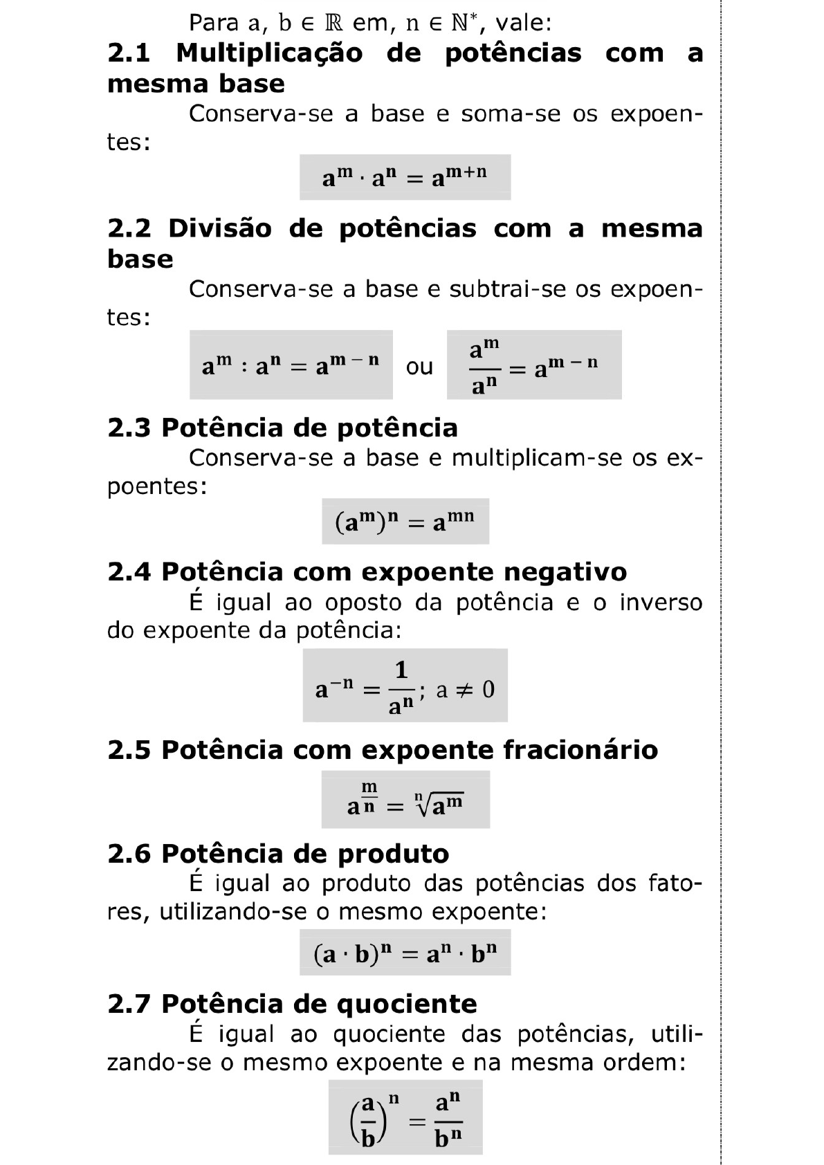 <p>Para a, b E R em, n E N*, vale: 2.1 Multiplicação de potências com a mesma base Conserva-se a base e soma-se os expoen- tes: 2.2 Divisão de potências com a mesma base Conserva-se a base e subtrai-se os expoen- tes: ou 2.3 Potência de potência Conserva-se a base e multiplicam-se os ex- poentes: 2.4 Potência com expoente negativo É igual ao oposto da potência e o inverso do expoente da potência: 1 2.5 Potência com expoente fracionário m an = Vam 2.6 Potência de produto É igual ao produto das potências dos fato- res, utilizando-se o mesmo expoente: 2.7 Potência de quociente É igual ao quociente das potências, utili- zando-se o mesmo expoente e na mesma ordem: n bn</p>