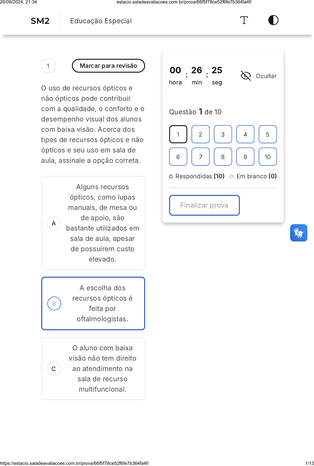 <p>A</p><p>B</p><p>C</p><p>1 Marcar para revisão</p><p>O uso de recursos ópticos e</p><p>não ópticos pode contribuir</p><p>com a qualidade, o conforto e o</p><p>desempenho visual dos alunos</p><p>com baixa visão. Acerca dos</p><p>tipos de recursos ópticos e não</p><p>ópticos e seu uso em sala de</p><p>aula, assinale a opção correta.</p><p>Alguns recursos</p><p>ópticos, como lupas</p><p>manuais, de mesa ou</p><p>de apoio, são</p><p>bastante utilizados em</p><p>sala de aula, apesar</p><p>de possuírem custo</p><p>elevado.</p><p>A escolha dos</p><p>recursos ópticos é</p><p>feita por</p><p>oftalmologistas.</p><p>O aluno com baixa</p><p>visão não tem direito</p><p>ao atendimento na</p><p>sala de recurso</p><p>multifuncional.</p><p>00</p><p>hora</p><p>: 26</p><p>min</p><p>: 25</p><p>seg</p><p>Ocultar</p><p>Questão 1 de 10</p><p>Respondidas �10� Em branco �0�</p><p>Finalizar prova</p><p>1 2 3 4 5</p><p>6 7 8 9 10</p><p>SM2 Educação Especial</p><p>26/09/2024, 21:34 estacio.saladeavaliacoes.com.br/prova/66f5f78ce52f6fe7b364fa4f/</p><p>https://estacio.saladeavaliacoes.com.br/prova/66f5f78ce52f6fe7b364fa4f/ 1/13</p><p>D</p><p>E</p><p>Os alunos com baixa</p><p>visão não devem ser</p><p>orientados a se sentar</p><p>próximo ao quadro</p><p>negro.</p><p>O tamanho da fonte</p><p>do material destinado</p><p>ao aluno com baixa</p><p>visão deve ser a</p><p>mesma dos outros</p><p>estudantes, mudando</p><p>apenas o contraste.</p><p>2 Marcar para revisão</p><p>"Quando o filho completou 4</p><p>anos, Elaine Kiss, como a</p><p>maioria dos pais, começou a</p><p>procurar escola. Para a sua</p><p>surpresa, todos os colégios</p><p>diziam não ter mais vaga. As</p><p>escolas não estavam lotadas,</p><p>mas não tinham lugar para</p><p>crianças como Gustavo, que é</p><p>autista. A lei proíbe negar</p><p>matrícula a alunos com</p><p>deficiência ou transtornos</p><p>globais do desenvolvimento,</p><p>como o autismo, mas</p><p>instituições particulares</p><p>afirmam ter número máximo de</p><p>vagas para estudantes com</p><p>deficiência. A justificativa dos</p><p>colégios é a dificuldade de</p><p>receber várias crianças ou</p><p>adolescentes com esse perfil,</p><p>que demanda outros tipos de</p><p>atenção."</p><p>26/09/2024, 21:34 estacio.saladeavaliacoes.com.br/prova/66f5f78ce52f6fe7b364fa4f/</p><p>https://estacio.saladeavaliacoes.com.br/prova/66f5f78ce52f6fe7b364fa4f/ 2/13</p><p>A</p><p>B</p><p>C</p><p>�PALHARES, I. Quantidade de</p><p>alunos com deficiência por</p><p>turma desafia escolas</p><p>particulares. O Estado de São</p><p>Paulo, 12 jun. 2018. Consultado</p><p>na internet em: set. 2021. )</p><p>Com base na reportagem</p><p>acima transcrita, e sobre os</p><p>princípios da tecnologia</p><p>assistiva na perspectiva da</p><p>educação inclusiva, assinale a</p><p>alternativa correta.</p><p>O estigma sobre a</p><p>pessoa com</p><p>deficiência é</p><p>agravado com ações</p><p>de inclusão social,</p><p>pois todos devem ser</p><p>tratados de modo</p><p>igual.</p><p>As crianças com</p><p>deficiência devem ser</p><p>segregadas das</p><p>demais crianças, para</p><p>que possam ser</p><p>devidamente</p><p>atendidas conforme</p><p>as suas necessidades.</p><p>Pôr em convivência</p><p>pessoas com</p><p>necessidades</p><p>educacionais diversas</p><p>é uma forma de expô-</p><p>las ao preconceito</p><p>social, o ideal é que</p><p>se forme uma classe</p><p>especial.</p><p>26/09/2024, 21:34 estacio.saladeavaliacoes.com.br/prova/66f5f78ce52f6fe7b364fa4f/</p><p>https://estacio.saladeavaliacoes.com.br/prova/66f5f78ce52f6fe7b364fa4f/ 3/13</p><p>D</p><p>E</p><p>A presença de</p><p>crianças com</p><p>deficiência, que têm</p><p>necessidades</p><p>especiais, obsta o</p><p>desenvolvimento das</p><p>demais, que não</p><p>precisam desses</p><p>recursos.</p><p>Promover a</p><p>diversidade humana é</p><p>uma forma de superar</p><p>o estigma da</p><p>deficiência, por isso,</p><p>o ideal é que crianças</p><p>com e sem</p><p>deficiência dividam</p><p>os mesmos</p><p>ambientes.</p><p>3 Marcar para revisão</p><p>Desde a década de 1970, o</p><p>psiquiatra brasileiro Christian</p><p>Gauderer já alertava que as</p><p>definições sobre o autismo não</p><p>podiam ser deterministas, pois</p><p>evoluem de acordo com os</p><p>novos estudos e pesquisas que</p><p>aprofundam o conhecimento</p><p>sobre o tema. O autismo não</p><p>estava relacionado com qual</p><p>causa?</p><p>26/09/2024, 21:34 estacio.saladeavaliacoes.com.br/prova/66f5f78ce52f6fe7b364fa4f/</p><p>https://estacio.saladeavaliacoes.com.br/prova/66f5f78ce52f6fe7b364fa4f/ 4/13</p><p>A</p><p>B</p><p>C</p><p>D</p><p>E</p><p>A</p><p>B</p><p>C</p><p>Pessoas de qualquer</p><p>origem racial.</p><p>Pessoas de qualquer</p><p>origem étnica.</p><p>Pessoas de qualquer</p><p>origem social.</p><p>Pessoas com quadros</p><p>de psicose.</p><p>Pessoas de qualquer</p><p>origem econômica.</p><p>4 Marcar para revisão</p><p>Em relação à função executiva</p><p>�FE�, indique a opção que NÃO</p><p>está relacionada com as</p><p>habilidades esperadas.</p><p>Inibição de respostas</p><p>inadequadas</p><p>Capacidade de</p><p>controlar impulsos</p><p>Planificar ações</p><p>26/09/2024, 21:34 estacio.saladeavaliacoes.com.br/prova/66f5f78ce52f6fe7b364fa4f/</p><p>https://estacio.saladeavaliacoes.com.br/prova/66f5f78ce52f6fe7b364fa4f/ 5/13</p><p>D</p><p>E</p><p>A</p><p>B</p><p>C</p><p>D</p><p>E</p><p>Incapacidade de</p><p>solucionar problemas</p><p>Capacidade de</p><p>antecipação</p><p>5 Marcar para revisão</p><p>Segundo o DSM�5 �APA, 2014,</p><p>p. 470�, existem categorias nas</p><p>quais estão inseridos os</p><p>sintomas referentes ao</p><p>transtorno de conduta. Qual</p><p>categoria NÃO se refere ao TC?</p><p>Violação grave de</p><p>regras</p><p>Estagnação do</p><p>desenvolvimento com</p><p>regressão motora</p><p>Destruição de</p><p>propriedade</p><p>Falsidade ou furto</p><p>Agressão a pessoas e</p><p>animais</p