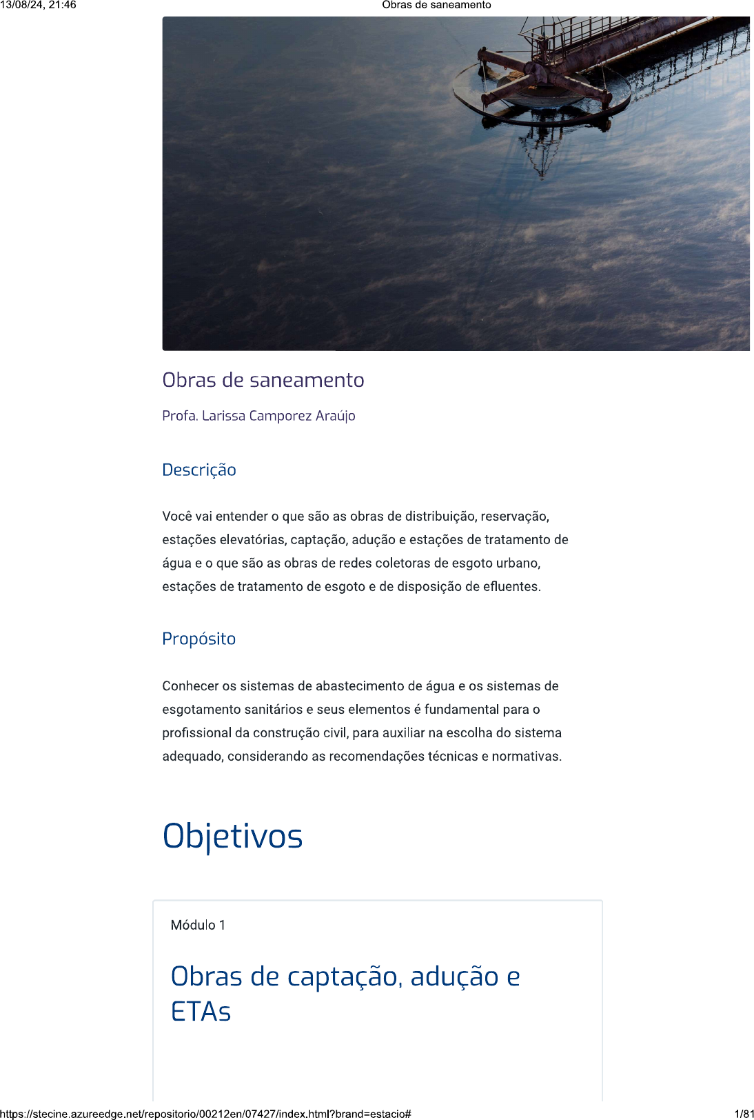 <p>13/08/24, 21:46 Obras de saneamento Obras de saneamento Profa. Larissa Camporez Araújo Descrição Você vai entender o que são as obras de distribuição, reservação, estações elevatórias, captação, adução e estações de tratamento de água e o que são as obras de redes coletoras de esgoto urbano, estações de tratamento de esgoto e de disposição de efluentes. Propósito Conhecer os sistemas de abastecimento de água e os sistemas de esgotamento sanitários e seus elementos é fundamental para o profissional da construção civil, para auxiliar na escolha do sistema adequado, considerando as recomendações técnicas e normativas. Objetivos Módulo 1 Obras de captação, adução e ETAs 1/81</p><p>13/08/24, 21:46 Obras de saneamento Reconhecer as características das obras de captação, adução e estações de tratamento de água. Módulo 2 Obras de distribuição, reservação e estações elevatórias Identificar as obras de distribuição, reservação e estações elevatórias. Módulo 3 Obras de redes coletoras de esgoto urbano Reconhecer os sistemas de esgotamento sanitário e os tipos de redes. Módulo 4 Obras de e de disposição de efluentes Identificar as obras de estações de tratamento de esgoto e de disposição dos efluentes. Introdução 2/81</p><p>13/08/24, 21:46 Obras de saneamento Olá! Antes de começarmos, assista ao vídeo a seguir e compreenda os conceitos de obras de saneamento. Confira! Para assistir a um vídeo sobre o assunto, acesse a versão online deste conteúdo. -0- 1 - Obras de captação, adução e ETAs Ao final deste módulo, você será capaz de reconhecer as características das obras de captação, adução e estações de tratamento de água. Tratamento de esgoto e disposição de efluentes No vídeo a seguir, falaremos sobre o tratamento de esgoto, as ETEs, processos de tratamento de esgoto e disposição dos efluentes. Confira! 3/81</p><p>13/08/24, 21:46 Obras de saneamento Para assistir a um vídeo sobre o assunto, acesse a versão online deste conteúdo. Captação de águas No vídeo a seguir, explicaremos como é realizada a escolha do local de captação, quais são as partes constituintes e a captação em águas subterrâneas. Confira! Para assistir a um vídeo sobre o assunto, acesse a versão online deste conteúdo. -0- Considerações preliminares As obras de captação são estruturas e dispositivos que podem ser construídos ou montados junto a um manancial para a retirada da água que será levada para um sistema de abastecimento. Tais obras precisam ser projetadas para: funcionarem ininterruptamente em qualquer época do ano, permitirem a captação para o sistema de abastecimento em quantidade suficiente e com melhor qualidade possível, facilitarem o acesso de operação e manutenção da obra. Veja a seguir: Manancial Estação de Rede de tratamento distribuição de água Reservatório Captação Adutora de Adutora água bruta de água Estação tratada elevatória de água bruta Sistema de abastecimento de água. As estações elevatórias são necessárias quando o manancial se situa em conta inferior à da cidade de abastecimento. Nesses casos, as obras da estação elevatória são associadas às obras de captação. 4/81</p><p>13/08/24, 21:46 Obras de saneamento A captação pode ocorrer em cursos de água ou em lagos e represas, sendo o chamado manancial a fonte para o suprimento da água e, quando superficial, é formado por córregos, rios, lagos e represas. Comentário Além de precisar atender à quantidade de abastecimento, o manancial precisa apresentar qualidade nos aspectos físico, químico, biológico e bacteriano. Escolha do local de captação A análise para a escolha do local para a implantação da obra de captação deve considerar todos os elementos disponíveis sobre a área, além de serem realizadas inspeções de campo que verifiquem os aspectos relacionados às características hidráulicas do manancial, à geologia da região, às áreas inundáveis e aos focos de poluição existentes e potenciais. Também deve ser estudada a maneira de levar energia elétrica. Manancial Cantareira em São Paulo. As obras de captação devem ser posicionadas em trecho reto, ou, quando em curva, ao lado da curva externa, pois deste lado a velocidade da água é maior e não ocorre a formação de bancos de areia que podem obstruir a captação. Veja na imagem a Barragem de nível Captação Captação a) Trecho reto a) Trecho curto 5/81</p><p>13/08/24, 21:46 Obras de saneamento Captação de água: trecho reto (a); trecho curto (b). Essas obras precisam ser protegidas de ações de erosão da água e de efeitos de remanso e variação do nível de água. É preciso garantir acesso à obra de captação de água em dias de fortes temporais e inundações. Por essa razão, não é indicada a construção de obras de captação em terrenos baixos próximos a rios. Vale lembrar que as estradas de acesso à obra também devem ter acesso livre independentemente da situação do tempo ou da época do ano. Veja a representação na imagem a seguir. Partes constituintes de uma captação No local de implantação da obra de captação, devem ser estudadas as condições da seção do curso de água no que diz respeito à sua estabilização, especialmente em situações de baixa declividade (áreas sujeitas a um regime muito variável de descarga). As obras de captação são muito diversas e dependem do curso d'água, da variação do nível d'água, da topografia, entre outros fatores. Veja a seguir a composição das obras de captação, em sua maioria. Barragem, vertedor ou enrocamento São obras no curso d'água que ocupam toda a sua largura com a finalidade de elevar o nível d'água para uma cota predeterminada e assim garantir o bom funcionamento da captação e das bombas. São dispensados em situações de curso de água profundo com grande lâmina no ponto da captação e vazão mínima superi
