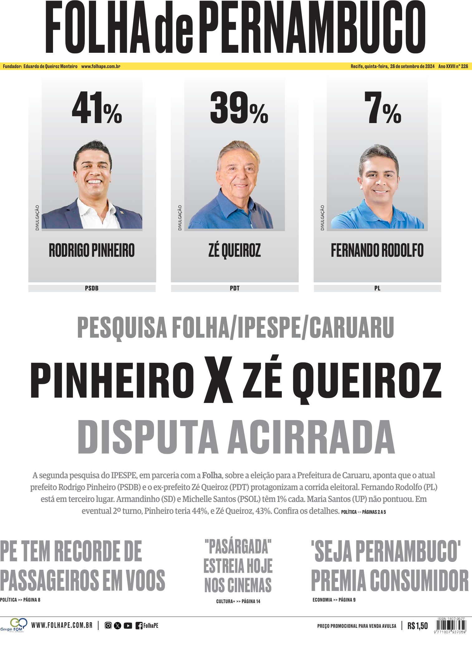 <p>FOLHA de PERNAMBUCO</p><p>Fundador: Eduardo de Queiroz Monteiro www.folhape.com.br Recife, quinta-feira, 26 de setembro de 2024 Ano XXVII n° 226</p><p>PREÇO PROMOCIONAL PARA VENDA AVULSA R$ 1,50W W W. F O L H A P E . C O M . B R FolhaPE</p><p>"PASÁRGADA"</p><p>ESTREIA HOJE</p><p>NOS CINEMAS</p><p>CULTURA+ >> PÁGINA 14</p><p>A segunda pesquisa do IPESPE, em parceria com a Folha, sobre a eleição para a Prefeitura de Caruaru, aponta que o atual</p><p>prefeito Rodrigo Pinheiro (PSDB) e o ex-prefeito Zé Queiroz (PDT) protagonizam a corrida eleitoral. Fernando Rodolfo (PL)</p><p>está em terceiro lugar. Armandinho (SD) e Michelle Santos (PSOL) têm 1% cada. Maria Santos (UP) não pontuou. Em</p><p>eventual 2º turno, Pinheiro teria 44%, e Zé Queiroz, 43%. Confira os detalhes. POLÍTICA >> PÁGINAS 2 A 5</p><p>PESQUISA FOLHA/IPESPE/CARUARU</p><p>41% 39%</p><p>RODRIGO PINHEIRO ZÉ QUEIROZ</p><p>PSDB PDT</p><p>7%</p><p>FERNANDO RODOLFO</p><p>PL</p><p>'SEJA PERNAMBUCO'</p><p>PREMIA CONSUMIDOR</p><p>ECONOMIA >> PÁGINA 9</p><p>PE TEM RECORDE DE</p><p>PASSAGEIROS EM VOOS</p><p>POLÍTICA >> PÁGINA 8</p><p>D</p><p>IV</p><p>U</p><p>LG</p><p>A</p><p>Ç</p><p>Ã</p><p>O</p><p>D</p><p>IV</p><p>U</p><p>LG</p><p>A</p><p>Ç</p><p>Ã</p><p>O</p><p>D</p><p>IV</p><p>U</p><p>LG</p><p>A</p><p>Ç</p><p>Ã</p><p>O</p><p>PINHEIRO X ZÉ QUEIROZ</p><p>DISPUTA ACIRRADA</p><p>D4Sign 6d42ef54-46d2-42c6-a5d4-f46c0828b580 - Para confirmar as assinaturas acesse https://secure.d4sign.com.br/verificar</p><p>Documento assinado eletronicamente, conforme MP 2.200-2/01, Art. 10º, §2.</p><p>CARLOS ANDRÉ CARVALHO</p><p>A segunda rodada de pes-</p><p>quisas sobre as eleições</p><p>em Caruaru, no Agreste,</p><p>realizada pelo Instituto de Pesquisas</p><p>Sociais, Políticas e Econômicas</p><p>(IPESPE) em parceria com a Folha de</p><p>Pernambuco e divulgada hoje, as-</p><p>sim como a primeira, realizada de 16</p><p>a 18 de agosto, mostra equilíbrio en-</p><p>tre o prefeito e candidato à reeleição,</p><p>Rodrigo Pinheiro (PSDB), e Zé Quei-</p><p>roz (PDT), que foi prefeito do mu-</p><p>nicípio por quatro mandatos.</p><p>A diferença é que os percentuais</p><p>de ambos cresceram em relação ao</p><p>primeiro levantamento, mas repe-</p><p>tindo o empate técnico e quase nu-</p><p>mérico da rodada anterior da pes-</p><p>quisa estimulada – em que são apre-</p><p>sentadas as opções de candidatos ao</p><p>entrevistado. No levantamento, Pi-</p><p>nheiro fica com 41% das intenções</p><p>de voto ante 35% da pesquisa ante-</p><p>rior. Zé Queiroz tem 39% contra</p><p>34% do levantamento realizado em</p><p>agosto.</p><p>Fernando Rodolfo (PL) tem 7%,</p><p>repetindo o mesmo percentual da</p><p>primeira pesquisa. Já Armadinho</p><p>(Solidariedade) caiu de 3% em agos-</p><p>to para 1% nesta segunda rodada.</p><p>Michelle Santos (PSOL) repete ago-</p><p>ra o mesmo 1% da primeira rodada,</p><p>enquanto Maria Santos (UP) caiu de</p><p>1% para zero agora, porque não</p><p>atingiu 0,5% das intenções de voto.</p><p>O total de pesquisados que vota-</p><p>ria branco, nulo ou em nenhum</p><p>dos candidatos foi de 7% desta vez,</p><p>que corresponde à metade do per-</p><p>centual da primeira pesquisa. Já os</p><p>que não sabem ou não responderam</p><p>somam 4% (na anterior foram 5%).</p><p>A margem de erro máximo estima-</p><p>da para o total da amostra é de 4,5</p><p>pontos percentuais para mais ou</p><p>para menos, com a utilização de um</p><p>intervalo de confiança de 95,45%.</p><p>Estratificação</p><p>Na estratificação da pesquisa es-</p><p>timulada, Rodrigo tem a maioria</p><p>dos seus eleitores homens (43%),</p><p>com idade de 16 anos a 24 anos e de</p><p>25 anos a 44 anos (ambos com 43%),</p><p>com formação de ensino médio</p><p>(43%) e que ganham até dois salários</p><p>mínimos, com 43%, também.</p><p>Já Zé Queiroz tem maioria do seu</p><p>eleitorado formado pelo público fe-</p><p>minino (43%), com mais de 60 anos</p><p>(45%), instrução até o fundamental</p><p>(42%) e que ganham de dois a cin-</p><p>co salários mínimos (40%).</p><p>Espontânea</p><p>Na pesquisa espontânea – na qual</p><p>não são apresentados os nomes dos</p><p>candidatos –, Pinheiro fica com 36%</p><p>ante 26% da primeira rodada. Zé</p><p>Queiroz tem 34% contra 18% da ro-</p><p>dada anterior. Rodolfo passou de 4%</p><p>em agosto para 5% este mês. Já Ar-</p><p>mandinho e Michelle repetiram 1%</p><p>nas duas pesquisas, enquanto Ma-</p><p>ria caiu de 1% na primeira para zero</p><p>nesta. O percentual de nin-</p><p>guém/branco/nulo é de 4% (antes</p><p>era 9%); e o de não sabe ou não res-</p><p>pondeu, 20% (41% antes).</p><p>Rejeição</p><p>Sobre a probabilidade de voto, Pi-</p><p>nheiro e Queiroz são os candidatos</p><p>menos rejeitados desta segunda ro-</p><p>dada, ambos com 36%. Na primei-</p><p>ra pesquisa, eles também empata-</p><p>ram em 41%. Os mais rejeitados</p><p>são Rodolfo e Armandinho, empa-</p><p>tados com 52% (antes eram 50% e</p><p>49%, respectivamente), seguidos</p><p>por Maria, com 51% (eram 34%); e</p><p>Michelle, com 49% (34% antes). Já</p><p>os que dizem que “com certeza vo-</p><p>tariam” em Rodrigo somam 37%</p><p>(antes eram 30%); enquanto os que</p><p>dizem o mesmo de Queiroz so-</p><p>mam 36% (29% antes). No mesmo</p><p>quesito, Rodolfo alcança 7% (5% an-</p><p>tes) e Armandinho, 1% (eram 3%).</p><p>A pesquisa, realizada dos dias 21</p><p>a 23 deste mês, teve uma amostra de</p><p>500 entrevistados, representativa do</p><p>eleitorado do município de Carua-</p><p>ru, e está registrada no Tribunal</p><p>Superior Eleitoral (TSE) sob o pro-</p><p>tocolo PE-01739/2024.</p><p>CONTINUA NA PÁGINA 3</p><p>2</p><p>POLÍTICA FOLHA de PERNAMBUCO</p><p>Recife, quinta-feira, 26 de setembro de 2024</p><p>A segunda rodada</p><p>da pesquisa</p><p>Folha/IPESPE sobre</p><p>as eleições de</p><p>Caruaru mostra</p><p>equilíbrio entre</p><p>atual prefeito e ex-</p><p>gestor pedetista</p><p>Ro
