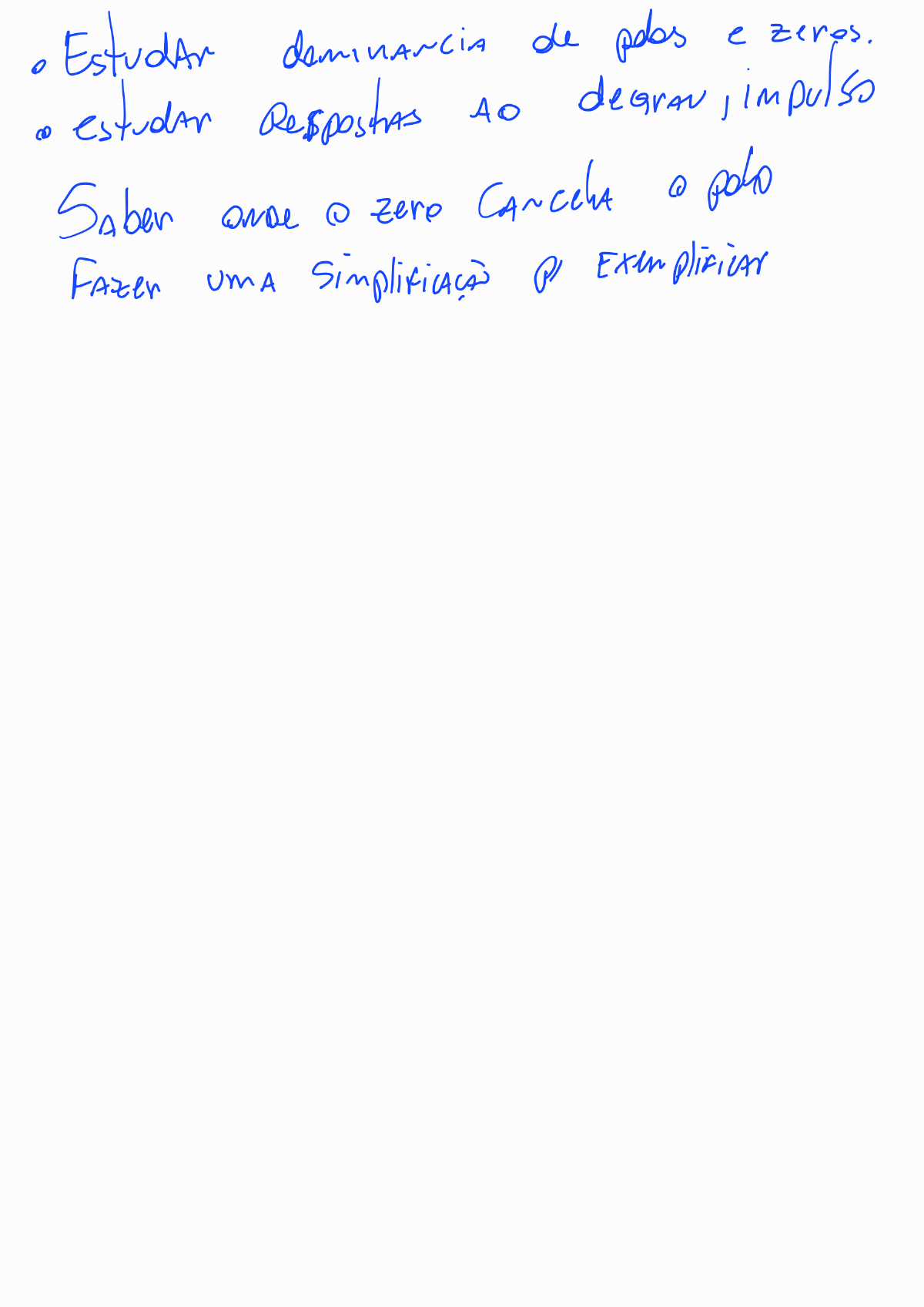 <p>EstudAn de ezeres. impulso @ @ zere Fazer UMA</p><p>Problemas B.5.1 Um termômetro requer 1 minuto para indicar 98% da resposta a uma entrada em degrau. Supondo que o termômetro seja um sistema de primeira ordem, determine a constante de tempo. Se o termômetro for imerso em um banho, cuja temperatura muda linearmente a uma taxa de 10%/min, qual será o erro apresentado pelo termômetro? Ts+1 R s = 10 = Erro CASO A 0,25°C B.5.2 Considere a resposta ao degrau unitário do sistema de controle com realimentação unitária cuja função de transferência de malha aberta seja: = Wn2 Obtenha o tempo de subida, o tempo de pico, o máximo sobressinal e o tempo de acomodação. Tr= = Wd Wd T Wd= = 0,87 0/5 B= 1,049 Wd=0,87 Tr = TT - 1,049 = 0,87 = = II = 3,61s Wd - = e = 0,163 Ts= = 4 = = 8s 5% 0,5. 0,5 3 11 6s</p><p>B.5.3 Considere o sistema de malha fechada dado por: C(s) Determine os valores de de de modo que o sistema responda a uma entrada em degrau com aproximadamente 5% de sobressinal e com um tempo de acomodação de 2 segundos. (Utilize o critério de 2%.) Ts =4T = 4 = = V = = = 0,62 Wn=3,23</p><p>B.5.4 Considere o sistema mostrado na Figura 5.72. O sistema está inicialmente em repouso. Suponha que o carro seja posto em movimento por uma força impulsiva de valor unitário. O sistema pode ser parado por outra força impulsiva? 5.72 a ico. Força k impulsiva m S(t)</p><p>B.5.5 Obtenha a resposta ao impulso unitário e a resposta ao degrau unitário de um sistema com rea- limentação unitária cuja função de transferência de malha aberta seja: 1 s2</p><p>B.5.6 Sabe-se que a função de transferência de um sistema oscilatório tem a seguinte forma: Suponha que haja um registro da oscilação com amortecimento, como mostra a Figura 5.73. Determine o coeficiente de amortecimento do sistema a partir do gráfico. 5.73 ão ente. T In - = = = 2 - 2)= Z 2 2</p><p>B.5.7 Considere o sistema mostrado na Figura 5.74(a). o coeficiente de amortecimento do sistema é 0,158 e a frequência natural não amortecida é 3,16 rad/s. Para melhorar a estabilidade relativa, utilizamos a realimentação tacométrica. A Figura 5.74(b) mostra esse sistema com o a) 10 no ramo de realimentação. Determine o valor de de modo que o coeficiente de amortecimento seja 0,5. Desenhe as curvas de resposta ao degrau unitário do sistema original e do sistema com realimentação tacométrica. Desenhe também as curvas de erro versus tempo para a resposta à rampa unitária de ambos os sistemas. 10 5.74 ma R(s) 10 C(s) trole; s(s+1) ma de s(s+1) e com trica. (a) 10 R(s) C(s) 10 1 s+1 Kh (b) Ga = = 10 10 = 10Kh stn Gb= 10 10 = 10 st = = = Wn = Kh= 3,16-1 10 Kh= 0,216 Erro</p><p>B.5.8 Considerando o sistema apresentado na Figura 5.75, determine os valores de Kek, de modo que o sistema tenha um coeficiente de amortecimento igual a 0,7 e uma frequência natural não amortecida Wn de 4 rad/s. 5.75 de malha R(s) C(s) K S k = 1 + K = + K Wn= 4 Wn 2 = = 23Wn = (2+kk) = 2+kk = 5,6-2 16 (</p><p>B.5.9 Considere o sistema mostrado na Figura 5.76. Determine o valor de k de modo que o coeficiente de amortecimento seja 0,5. Então, obtenha o tempo de subida tr, o tempo de pico o máximo sobressinal Mp e o tempo de acomodação ts na resposta ao degrau unitário. R(s) 16 1 C(s) S 16 k 16 16 = 16 = = + MP=e B= = T T=EWn =2 Mp= 0,163 = 4 = 2 2.05.4 = 0,8+16 K = = 3,46 = = - 1,107 tr=0,58 = wd 3,46 tp= II = II wd 3,46 ts 2% = 4 zwn ts=2,31</p><p>B.5.10 Utilizando o MATLAB, obtenha a resposta ao degrau unitário, à rampa unitária e ao impulso unitário do seguinte sistema: C(s) 10 = R(s) 10 10 R C= 10 ) 3 - is 3 I 3 is e - -t 3</p><p>B.5.11 Utilizando o MATLAB, obtenha a resposta ao degrau unitário, à rampa unitária e ao impulso unitário do seguinte sistema: onde u é a entrada e y, a saída. - [1 o] 1 X+1 -0,5 5s</p><p>B.5.12 Obtenha o tempo de subida, o tempo de pico, o máximo sobressinal e o tempo de acomodação, na resposta ao degrau unitário, do sistema de malha fechada dado a seguir, tanto analítica como computacionalmente: C(s) 36 36 = = R Wd = Wn = 6 B= tan wd = 5,92 = zwn tr= II 5,92 2%:4T 16 6 Mp=0,58 Mp= e</p><p>B.5.13 A Figura 5.77 mostra três sistemas. O sistema I é um servossistema posicionador. sistema II é um servossistema posicionador com ação de controle PD. sistema III é um servossistema posicionador com realimentação de velocidade. Compare as respostas ao degrau unitário, ao impulso unitário e à rampa unitária dos três sistemas. Qual dos sistemas é melhor com respeito à velocidade de resposta e ao máximo sobressinal na resposta ao degrau? R(s) C(s) 5 1 5 s(5s+1) = = 5sts + 5 Sistema I R(s) 5(1+0,8s) : 5 s(5s+1) R = Sistema II R(s) 5 1 5s+1 S C = 1 1 R = 0,8 Sistema III 5 1 =</p><p>B.5.14 Considere o sistema de controle de posição mostrado na Figura 5.78. Escreva um programa em MATLAB para obter a resposta do sistema ao degrau unitário, bem como a resposta à rampa unitária. Desenhe as curvas x (t) versus t, x2(t) versus t, x3(t) versus t e e(t) versus t [onde e(t) = r(t) - tanto para a resposta ao degrau unitário como para a resposta à rampa unitária. A 5.78 de 4 1 2 x2 le 5 1 sição. 10 10 100 10 100 = = = It 10 100.4 400 = s 400 B = s As B + 100(s+4) As (100 + + + = + 400A</p><p>B.5.15 Utilizando o MATLAB, obtenha a curva de resposta ao degrau unitário do sistema de controle com realimentação unitária cuja função de transferência de malha aberta seja 10 10 Utilizando o MATLAB, obtenha também o tempo de subida, o tempo de pico, o máximo sobres- sinal e o tempo de acomodação na curva de resposta ao degrau unitário. 10 s s+4 = 10 2C 4 4 8A = 10 4 A= 1,25 = = C = 1,25 1,25 f2 1,25 2,5 + 1,25 s -4t -2t +</p><p>10 = +8) r = 6 = 8 Wn = = 2,B3 = 6 5,66 Sistema</p><p>B.5.16 Considere o sistema de malha fechada definido por: C(s) onde 0,6; 0,8 e 1,0. Utilizando o MATLAB, desenhe um gráfico bidimensional das curvas de resposta ao impulso unitário. Desenhe também um gráfico tr