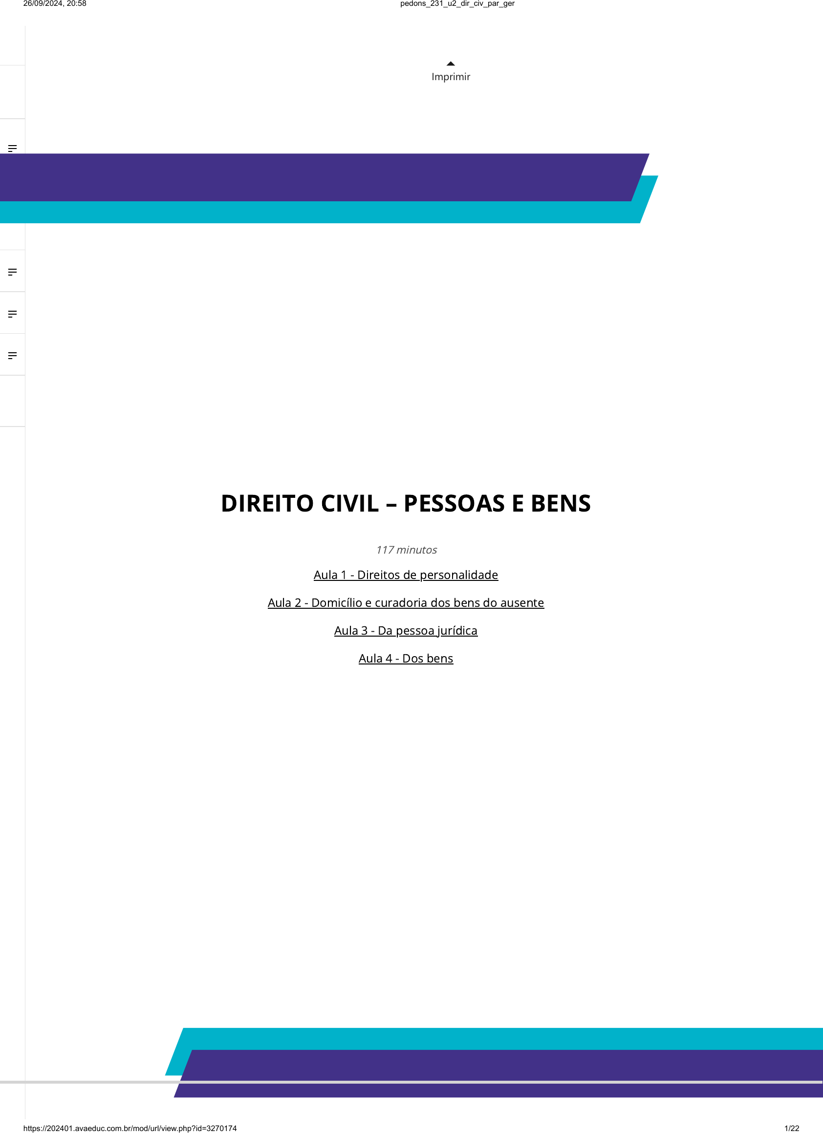 <p>Imprimir</p><p></p><p>DIREITO CIVIL – PESSOAS E BENS</p><p>117 minutos</p><p>Aula 1 - Direitos de personalidade</p><p>Aula 2 - Domicílio e curadoria dos bens do ausente</p><p>Aula 3 - Da pessoa jurídica</p><p>Aula 4 - Dos bens</p><p>Referências</p><p>26/09/2024, 20:58 pedons_231_u2_dir_civ_par_ger</p><p>https://202401.avaeduc.com.br/mod/url/view.php?id=3270174 1/22</p><p>INTRODUÇÃO</p><p>Olá, prezados estudantes!</p><p>Na aula de hoje estudaremos mais profundamente as temáticas atinentes aos Direitos de Personalidade. Em</p><p>suma, os diretos da personalidade estão relacionados com características físicas, psíquicas e morais de uma</p><p>pessoa, como explicam Gagliano e Pamplona Filho (2020). Eles são direitos inerentes as pessoas naturais</p><p>desde o nascituro até a morte e também as pessoas jurídicas. O Código Civil disciplina como direitos da</p><p>personalidade o direito à vida, à imagem, ao nome e à privacidade.</p><p>Sendo assim, ao �nal, esperamos que o aluno possa compreender a importância dos direitos da</p><p>personalidade e a aplicabilidade prática nas relações privadas.</p><p>CONCEITOS ACERCA DOS DIREITOS DA PERSONALIDADE</p><p>Para completar os estudos sobre as pessoas (mas que não se restringe somente a esse tema), é fundamental</p><p>que estudemos os direitos da personalidade. Sua importância está no fato de que são direitos subjetivos não</p><p>patrimoniais e diretamente relacionados à dignidade da pessoa humana.</p><p>Nos tempos remotos, em Roma, os escravos não possuíam direitos de personalidade, pois eles eram tratados</p><p>como objetos. No Brasil, conforme Pereira (2017, p. 182) “a ideia da concessão de personalidade a todo ser</p><p>humano vigorou mesmo ao tempo da escravidão negra, muito embora o regime jurídico do escravo não o</p><p>equiparasse ao homem livre.”</p><p>Esses direitos dizem respeito a: a) Integridade física (proteção do corpo humano vivo ou morto): como o</p><p>direito à vida, por exemplo etc; b) Integridade psíquica e intelectual (protegem as liberdades, a criatividade e</p><p>sua interação social): a liberdade de pensamento, de expressão, de religião, de invenção entre outras; c)</p><p>Integridade moral (proteção de valores intrínsecos à pessoa): o direito ao nome, à imagem, à honra etc.</p><p>Como não há hierarquia entre estes pontos (nenhum deve se sobrepor ao outro), em caso de colisão,</p><p>devemos considerar qual prevalecerá no caso concreto (Enunciado 274 da IV JDC do CJF/STJ e artigo 489, §2º,</p><p>Código de Processo Civil). O seu desrespeito pode gerar responsabilização civil e penal (artigo 935, CC), e sua</p><p>Aula 1</p><p>DIREITOS DE PERSONALIDADE</p><p>Na aula de hoje estudaremos mais profundamente as temáticas atinentes aos Direitos de Personalidade.</p><p>29 minutos</p><p></p><p>26/09/2024, 20:58 pedons_231_u2_dir_civ_par_ger</p><p>https://202401.avaeduc.com.br/mod/url/view.php?id=3270174 2/22</p><p>proteção deve ampla: preventiva (artigo 12, CC) e repressiva (arts. 186, 927, CC, e artigo 497, parágrafo único,</p><p>CPC).</p><p>Em alguns casos, é possível buscar uma indenização (reparação de danos materiais e morais) ou obrigações</p><p>de fazer ou não fazer, como a retirada de um conteúdo ou material de circulação, dentre outras medidas, de</p><p>acordo com cada caso.</p><p>Esses direitos são identi�cados a partir de algumas características (artigo 11, CC) que podem ser limitadas</p><p>voluntariamente em certas situações. As características são:</p><p>a) absolutos: devem ser respeitados por todos, mas certas qualidades podem sofrer limitação voluntária pelo</p><p>titular, sob certo período (Enunciado 4 da I JDC do SJF/STJ);</p><p>b) gerais: todas as pessoas os possuem;</p><p>c) extrapatrimoniais: eles não têm, em regra, caráter patrimonial direto, apesar de certos efeitos econômicos</p><p>que possam gerar;</p><p>d) indisponíveis: não podem, geralmente, ser afastados, negociados ou transmitidos. Mas a disponibilização</p><p>pode ocorrer, como no exemplo da exploração de imagem;</p><p>e) imprescritíveis: podem ser exercitados a qualquer tempo, independentemente de prazo;</p><p>f) impenhoráveis: não podem ser penhorados e vitalícios: porque são próprios da pessoa durante a sua vida.</p><p>Mas também podem projetar seus efeitos após a morte.</p><p>O Código Civil enumera os seguintes direitos da personalidade: o direito à vida, à imagem, ao nome e à</p><p>privacidade. Além disso, são essenciais o direito à dignidade e integridade, protegendo tudo o que lhe é</p><p>próprio, honra, vida, liberdade, privacidade, intimidade, entre outros.</p><p>DAS ESPÉCIES DE DIREITOS DA PERSONALIDADE E A EFETIVAÇÃO DO REGISTRO CIVIL</p><p>Conforme já citado anteriormente, os direitos de personalidade estão divididos em quatro modalidades. Tais</p><p>direitos, são inerentes a pessoa, do momento do nascimento e em regra, até a morte (PEREIRA, 2017).</p><p>Inicialmente, temos o direito ao nome, disposto no artigo 16 do Código Civil, que indica que cada um tem</p><p>direito ao nome, sendo ele composto pelo prenome e pelo sobrenome. O nome é o que identi�ca uma pessoa</p><p>e a individualiza, mesmo após a sua morte, além de indicar os seus laços familiares (GAGLIANO; PAMPLONA</p><p>FILHO, 2022). O nome de um indivíduo é composto pelo prenome simples (ex.: Carlos) ou composto (ex.:</p><p>Carlos Augusto) e pelo sobrenome simples (ex.: Santos) ou composto (ex.: Santos Silva). O pseudônimo,</p><p>conforme artigo 19 do Código Civil é protegido, desde que utilizado para atividades lícitas. Vejamos: “Art. 19. O</p><p>pseudônimo adotado para atividades lícitas goza da proteção que se dá ao nome.”</p><p>Importante ressaltar também que os direitos da personalidade acompanham a evolução da sociedade, desse</p><p>modo é plenamente possível a alteração do nome conforme o artigo 57 da Lei de Registros Públ