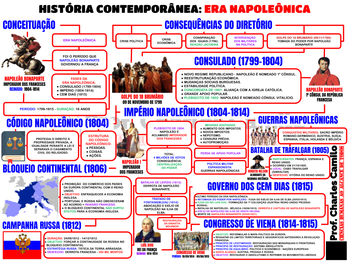 <p>HISTÓRIA ERA NAPOLEÔNICA CONCEITUAÇÃO CONSEQUÊNCIAS DO DIRETÓRIO CONSPIRAÇÃO INTERVENÇÃO ERA NAPOLEÔNICA CRISE GOLPE DO 18 BRUMÁRIO CRISE POLÍTICA ECONÔMICA DOS IGUAIS (1796) DOS MILITARES TOMADA DO PODER POR NAPOLEÃO JACOBINA NA POLÍTICA BONAPARTE o PERÍODO QUE NAPOLEÃO BONAPARTE GOVERNOU A FRANÇA CONSULADO (1799-1804) NOVO REGIME REPUBLICANO NAPOLEÃO É NOMEADO NAPOLEÃO BONAPARTE FASES DA REESTRUTURAÇÃO IMPERADOR DOS FRANCESES ERA SOCIAIS CONSULADO (1799-1804) ESTABILIDADE REINADO: 1804-1814 IMPÉRIO (1804-1814) CONCORDATA DE 1801: ALIANCA COM A IGREJA CATÓLICA NAPOLEÃO BONAPARTE CEM DIAS (1815) GRANDE APOIO POPULAR GOLPE DO 18 BRUMÁRIO CONSUL DA REPUBLICA PLEBISCITO DE 1802: NAPOLEÃO É NOMEADO FRANCESA 09 DE NOVEMBRO DE 1799 1799-1815 16 ANOS IMPÉRIO NAPOLEÔNICO (1804-1814) CÓDIGO NAPOLEÔNICO (1804) GUERRAS NAPOLEÔNICAS MEDIDAS PLEBISCITO DE 1804: AUMENTO DOS NAPOLEÃO NOVOS IMPOSTOS CONQUISTAS MILITARES SACRO ESTRUTURA ACLAMADO IMPERADOR PROTEGIA DIREITO A DO CÓDIGO DOS FRANCESES CENSURA ESPANHA HOLANDA E PROPRIEDADE A IGUALDADE PERANTE A LEI E SEPARAVA CASAMENTO CIVIL DO RELIGIOSO BATALHA DE TRAFALGAR (1805) PERDA DE APOIO POPULAR 4 MILHÕES DE VOTOS FRANCA ESPANHA E NAPOLEÃO CONSEQUENCIA REINO POLÍTICA MILITAR BLOQUEIO CONTINENTAL (1806) CENTRALIZAÇÃO IMPERADOR OCORREU FM 21/10/1805 DO PODER EXPANSIONISTA: CABO TRAFALGAR DOS FRANCESES GUERRAS NELSON (GIBRALTAR) DO REINO MARINHA BRITÂNICA DO DOS PAÍSES BATALHA DE LEIPZIG (1813) DERROTA DE NAPOLEÃO DA EUROPA CONTINENTAL COM o REINO BONAPARTE GOVERNO DOS CEM DIAS (1815) OBJETIVO: ENFRAQUECER A ECONOMIA ULTIMO DA ERA TRATADO DE RETOMADA DO PODER POR NAPOLEÃO FUGA DO DA DE ELBA (20/03/1815) PORTUGAL E NÃO OBEDECERAM FONTAINEBLEAU (1814) FUGA DO LUIS XVII FORMAÇÃO DA COLIGAÇÃO REINO PRUSSIA AO ACORDO FRANCESA ABDICAÇÃO E DE BLOQUEIO CONTINENTAL NÃO SURTIU NAPOLEÃO NA ILHA DE BATALHA DE WATERLOO BÉLGICA DERROTA CAPTURA DE NAPOLEÃO BONAPARTE EFEITOS PARA A ECONOMIA INGLESA EXILIO DE NAPOLEÃO NA ILHA DE SANTA HELENA ELBA MORTE DE NAPOLEÃO BONAPARTE RESTAURAÇÃO CAMPANHA RUSSA (1812) DA DINASTIA BOURBON CONGRESSO DE VIENA (1814-1815) REFORMULAR o MAPA POLÍTICO DA 24/06/1812 14/12/1812 RESGATAR os LIMITES TERRITORIAIS E GEOGRÁFICOS ANTERIORES A REVOLUÇÃO FRANCESA OBJETIVO: FORCAR A CONTINUIDADE DA RÚSSIA NO PRINCÍPIO DE LEGITIMIDADE: RESTAURAÇÃO DAS MONARQUIAS BLOQUEIO CONTINENTAL XVIII DE SISTEMA ABSOLUTISTA ESTRATÉGIA RUSSA: DA TERRA ARRASADA DA FRANCA PRINCÍPIO DE POLÍTICO F NAÇÕES EUROPEIAS DERROTA FRANCESA 300 MIL MORTOS 1814-1824 CONGRESSO DE SANTA ALIANCA AUSTRIA PRUSSIA E RUSSIA 18/09/1814 09/06/1815 OBJETIVO: RESTAURAR ABSOLUTISMO F REPRIMIR os MOVIMENTOS</p>