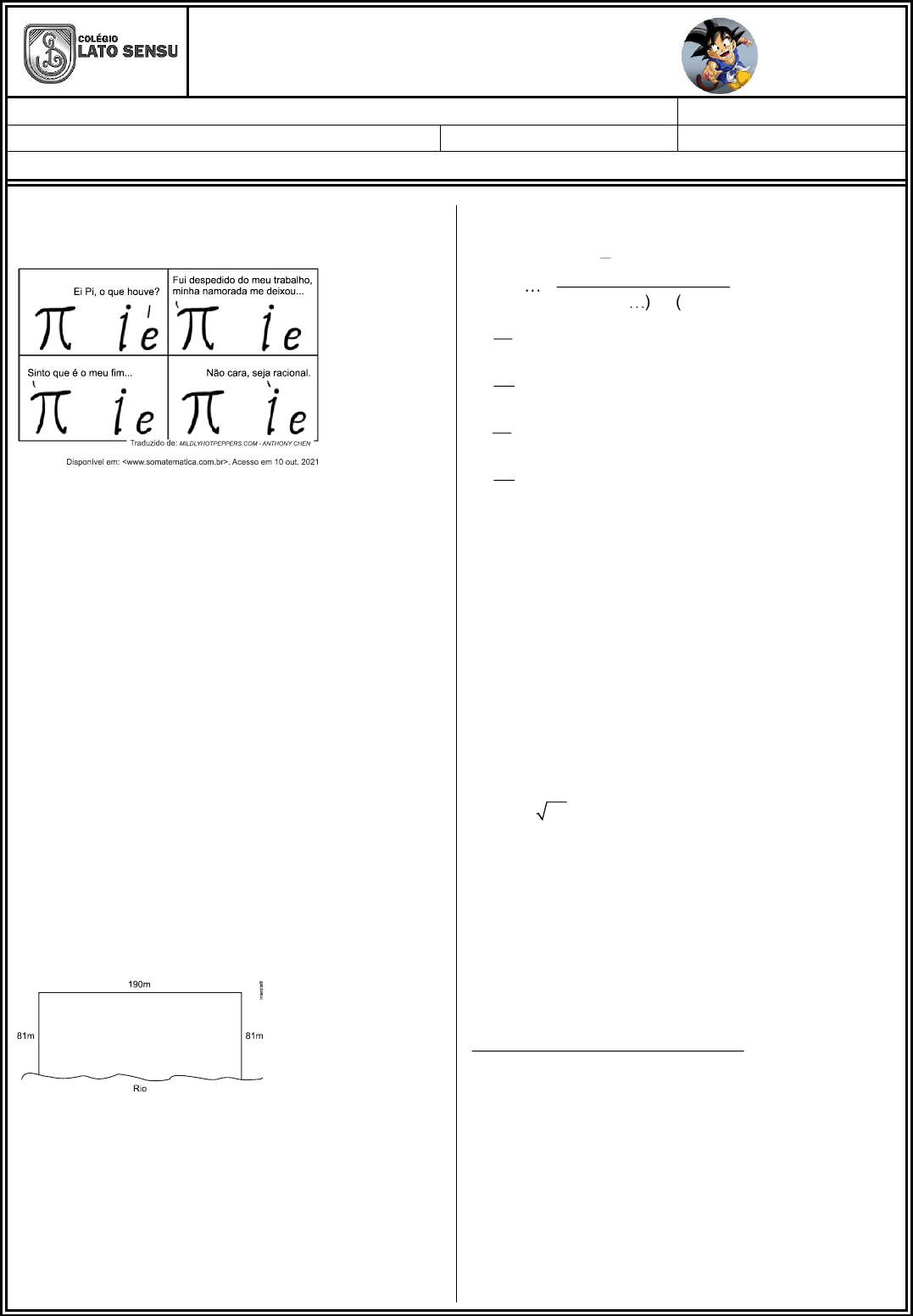 <p>1 REVISÃO EXTRA - MATEMÁTICA</p><p>3ª Etapa PROVA</p><p>Aluno (a): Turma:</p><p>Série: 8°ano Turno: Matutino Data: / / 2022</p><p>Professor(a): Antônio, Athyeli, Edgar, Jefferson, Marcelo, Rayfran</p><p>1. (Unifor - Medicina 2022)</p><p>A temática da tirinha são os números racionais e os</p><p>números irracionais, sobre os quais podemos</p><p>afirmar que</p><p>a) existem números que são racionais e irracionais</p><p>ao mesmo tempo, chamados números perfeitos.</p><p>b) tanto dízimas periódicas quanto dízimas não</p><p>periódicas podem ser representadas na forma de</p><p>fração.</p><p>c) somente os números racionais podem ser escritos</p><p>na forma de fração ou de dízimas periódicas.</p><p>d) a soma de dois números irracionais é sempre um</p><p>número irracional.</p><p>e) os números irracionais não fazem parte do</p><p>conjunto dos números reais.</p><p>2. (Enem 2013) Para o reflorestamento de uma</p><p>área, deve-se cercar totalmente, com tela, os lados</p><p>de um terreno, exceto o lado margeado pelo rio,</p><p>conforme a figura. Cada rolo de tela que será</p><p>comprado para confecção da cerca contém 48</p><p>metros de comprimento.</p><p>A quantidade mínima de rolos que deve ser</p><p>comprada para cercar esse terreno é</p><p>a) 6.</p><p>b) 7.</p><p>c) 8.</p><p>d) 11.</p><p>e) 12.</p><p>3. (G1 - epcar (Cpcar) 2022) A expressão numérica</p><p>3</p><p>1 2 3</p><p>2</p><p>1</p><p>5 3 ( 2)</p><p>3</p><p>0,2666</p><p>(0,333 ) ( 5)</p><p>−</p><p>−</p><p>−</p><p> </p><p>+ − </p><p> </p><p>+</p><p> −</p><p>é igual a</p><p>a)</p><p>1</p><p>15</p><p>b)</p><p>2</p><p>45</p><p>c)</p><p>7</p><p>15</p><p>d)</p><p>8</p><p>45</p><p>4. (G1 - ifal 2018) Determine o valor do produto</p><p>2(2x y) ,− sabendo que 2 24x y 8+ = e xy 2.=</p><p>a) 0.</p><p>b) 1.</p><p>c) 2.</p><p>d) 4.</p><p>e) 8.</p><p>5. (G1 - ifsul 2017) Considere as expressões</p><p>numéricas abaixo.</p><p>5</p><p>A 10 6 4</p><p>B 2 64</p><p>= − + </p><p>= −</p><p>É correto afirmar que o valor de A B+ é</p><p>a) 8</p><p>b) 16</p><p>c) 26</p><p>d) 38</p><p>6. (Ufsc 2016) Guardadas as condições de</p><p>existência, determine o valor numérico da expressão</p><p>3 2</p><p>2</p><p>(x 14x 49x) (ax bx 7a 7b)</p><p>(x 49) (2a 2b) (7x 49)</p><p>− + − + −</p><p>− − −</p><p>para x 966.=</p><p>7. (Unicamp indígenas 2022) A expressão</p><p>2 2A (m n) (m n)= + − − é equivalente a</p><p>a) A = 2 mn.</p><p>b) A = 4 mn.</p><p>c) A = 0.</p><p>LATO SENSU DISCIPLINA: Matemática Série: 8º Ens. Fundamental II Pág.: 02</p><p>d) A = 2m2</p><p>8. (G1 - ifpe 2019) Jeison Orlando Rodríguez</p><p>Hernández, um venezuelano de 20 anos, foi</p><p>reconhecido pela organização Guinness de recordes</p><p>mundiais como a pessoa viva com o maior pé do</p><p>mundo.</p><p>O pé direito dele mede 41,8 centímetros. O</p><p>esquerdo tem 36,8 centímetros.</p><p>Rodríguez se deu conta de que o tamanho de seus</p><p>pés "destoava" quando ainda era muito jovem, ao</p><p>compará-lo com os de seus amigos.</p><p>Disponível</p><p>em:<https://www.bbc.com/portuguese/noticias/2015</p><p>/09/150918_maior_pe_do_mundo_rm>. Acesso</p><p>em: 05 maio 2019 (adaptado).</p><p>Se o sistema de numeração dos calçados no Brasil</p><p>tem uma relação com o comprimento dos pés de</p><p>acordo com a fórmula</p><p>5p 28</p><p>N ,</p><p>4</p><p>+</p><p>= com N</p><p>representando o número do calçado e p</p><p>representando o comprimento do pé, em</p><p>centímetros, qual é a numeração do pé esquerdo de</p><p>Jeison Orlando, no Brasil, segundo o texto?</p><p>a) 59</p><p>b) 53</p><p>c) 52</p><p>d) 57</p><p>e) 50</p><p>9. (Espm 2018) O valor numérico da expressão</p><p>3 3</p><p>3 2 2</p><p>x y</p><p>x x y xy</p><p>−</p><p>+ +</p><p>para x 0,8= e y 0,3= é igual a:</p><p>a) 0,325</p><p>b) 0,125</p><p>c) 0,415</p><p>d) 0,625</p><p>e) 0,275</p><p>10. (G1 - ifsul 2017) O valor numérico da expressão</p><p>2</p><p>3</p><p>xy xy</p><p>E ,</p><p>x x</p><p>−</p><p>=</p><p>−</p><p>para x 4= e y 3,= − é</p><p>a)</p><p>1</p><p>5</p><p>−</p><p>b)</p><p>2</p><p>5</p><p>c)</p><p>3</p><p>5</p><p>−</p><p>d)</p><p>4</p><p>5</p><p>11. (G1 1996) Simplifique as seguintes frações</p><p>algébricas:</p><p>a) 5a + 10 / 5a</p><p>b) 3x - 3y / 6x - 6y</p><p>c) a2 - 4 / a - 2</p><p>d) a2 - 9 / 5(a + 3)</p><p>12. (Eear 2020) Se 2Q(x) ax bx c= + + é o quociente</p><p>da divisão de 3 2G(x) 6x 5x 7x 4= − + − por H(x) x 1,= −</p><p>então o valor de b c+ é</p><p>a) 6</p><p>b) 7</p><p>c) 8</p><p>d) 9</p><p>13. (Cesgranrio 1990) O resto da divisão de 4x9 +</p><p>7x8 + 4x3 + 3 por x + 1 vale:</p><p>a) 0.</p><p>b) 1.</p><p>c) 2.</p><p>d) 3.</p><p>e) 4.</p><p>14. (Uepg-pss 3 2021) Sabendo que um capital de</p><p>R$ 2.000,00 foi aplicado à taxa de 5% ao mês,</p><p>durante um semestre, assinale o que for correto.</p><p>01) No regime de capitalização simples, o montante</p><p>é de R$ 2.600,00.</p><p>02) No regime de capitalização simples, o montante</p><p>é de R$ 2.100,00.</p><p>04) No regime de capitalização composta, o</p><p>montante é de R$ 2.600,00.</p><p>08) No regime de capitalização composta, o</p><p>montante é 6M 2000(1,05) .=</p><p>15. (Encceja 2020) Uma pessoa necessita de um</p><p>empréstimo de R$ 10.000,00. Uma instituição</p><p>financeira oferece empréstimos a uma taxa de juros</p><p>simples de 2% ao mês, sendo que a dívida gerada</p><p>pelo empréstimo deve ser liquidada em uma única</p><p>parcela, paga ao final do último mês do contrato.</p><p>Essa pessoa pretende pagar, no máximo, R$</p><p>11.000,00 na liquidação dessa dívida.</p><p>O prazo máximo, em quantidade de meses, que</p><p>deverá durar esse contrato é</p><p>a) 5.</p><p>b) 50.</p><p>c) 500.</p><p>d) 550.</p><p>16. (Ufms 2022) A despesa mensal de uma família</p><p>foi de R$ 6.240,00 durante os primeiros 3 meses, R$</p><p>6.780,00 durante os próximos 4 meses e R$</p><p>7.236,00 durante os últimos 5 meses