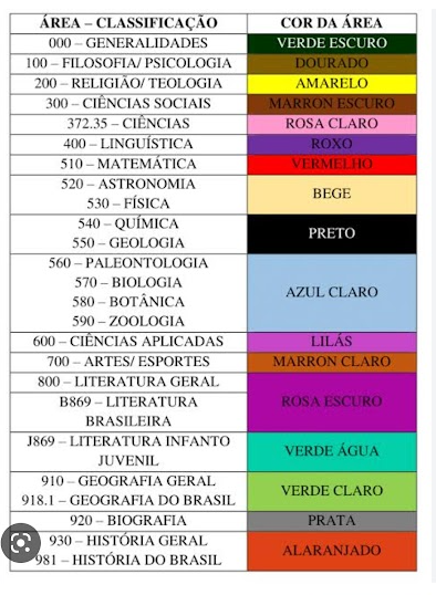 <p>- CLASSIFICAÇÃO COR DA ÁREA 000 - GENERALIDADES VERDE ESCURO 100 - FILOSOFIA/ PSICOLOGIA DOURADO 200 - RELIGIÃO/ TEOLOGIA AMARELO 300 - CIÊNCIAS SOCIAIS MARRON ESCURO 372.35 - CIÊNCIAS ROSA CLARO 400 - LINGUÍSTICA ROXO 510 - MATEMÁTICA VERMEL HO 520 - ASTRONOMIA BEGE 530 - FÍSICA 540 - QUÍMICA PRETO 550 - GEOLOGIA 560 - PALEONTOLOGIA BIOLOGIA AZUL CLARO 580 - BOTÂNICA 590 - ZOOLOGIA 600 - CIÊNCIAS APLICADAS LILÁS 700 - ARTES/ ESPORTES MARRON CLARO 800 - LITERATURA GERAL B869 - LITERATURA ROSA ESCURO BRASILEIRA J869 - LITERATURA INFANTO VERDE ÁGUA JUVENIL 910 - GEOGRAFIA GERAL VERDE CLARO 918.1 - GEOGRAFIA DO BRASIL 920 - BIOGRAFIA PRATA 930 - HISTÓRIA GERAL ALARANJADO 981 - HISTÓRIA DO BRASIL</p>
