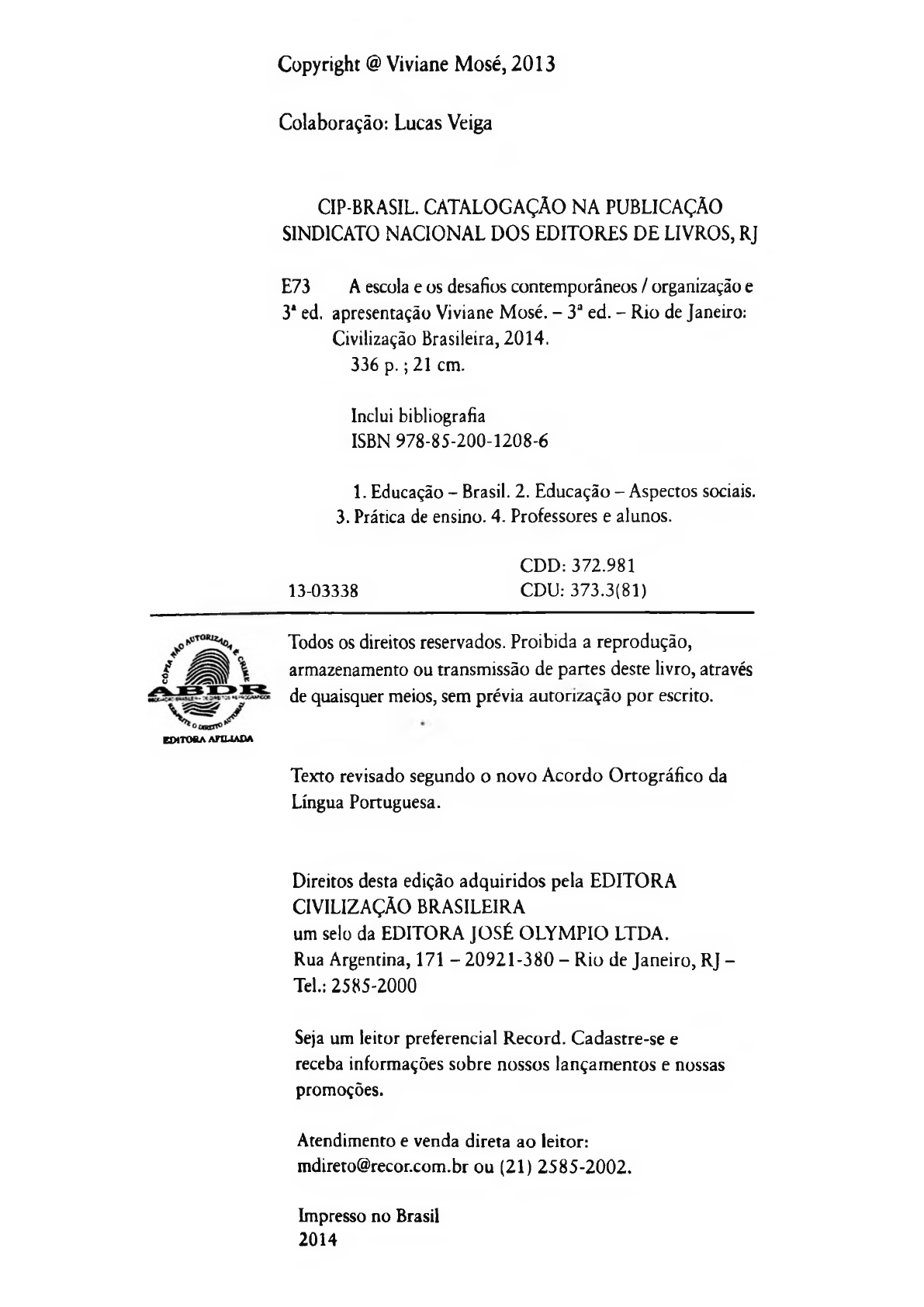 <p>Copyright @ Viviane Mosé, 2013</p><p>Colaboração: Lucas Veiga</p><p>CIP-BRASIL. CATALOGAÇÃO NA PUBLICAÇÃO</p><p>SINDICATO NACIONAL DOS EDITORES DE LIVROS, RJ</p><p>E73 A escola e os desafios contemporâneos / organização e</p><p>3* ed. apresentação Viviane Mosé. - 3a ed. - Rio de Janeiro:</p><p>Civilização Brasileira, 2014.</p><p>336 p . ; 21 cm.</p><p>Inclui bibliografia</p><p>ISBN 978-85-200-1208-6</p><p>1. Educação - Brasil. 2. Educação - Aspectos sociais.</p><p>3. Prática de ensino. 4. Professores e alunos.</p><p>CDD: 372.981</p><p>13-03338 CDU: 373.3(81)</p><p>EDITORA AFIUAOA</p><p>Todos os direitos reservados. Proibida a reprodução,</p><p>armazenamento ou transmissão de partes deste livro, através</p><p>de quaisquer meios, sem prévia autorização por escrito.</p><p>Texto revisado segundo o novo Acordo Ortográfico da</p><p>Língua Portuguesa.</p><p>Direitos desta edição adquiridos pela EDITORA</p><p>CIVILIZAÇÃO BRASILEIRA</p><p>um selo da EDITORA JO SÉ OLYMPIO LTDA.</p><p>Rua Argentina, 171 - 20921-380 - Rio de Janeiro, RJ -</p><p>Tel.: 2585-2000</p><p>Seja um leitor preferencial Record. Cadastre-se e</p><p>receba informações sobre nossos lançamentos e nossas</p><p>promoções.</p><p>Atendimento e venda direta ao leitor:</p><p>mdireto@recor.com.br ou (21) 2585-2002.</p><p>Impresso no Brasil</p><p>2014</p><p>mailto:mdireto@recor.com.br</p><p>3. A escola e a fragmentação da vida</p><p>Por que a escola prepara para a vida, em vez de ser a vida</p><p>exercida no presente? E por que o presente das crianças na</p><p>escola não é tam bém um exercício de cidadania, de respei</p><p>to a si m esm as, à vida e ao outro? Por que a escola não é</p><p>um espaço dem ocrático, de produção de conhecimentos,</p><p>de debates, de criação? Em vez disso, tem sido um presí</p><p>dio de alunos, um depósito de conteúdos impostos sem</p><p>muito sentido, um desrespeito aos saberes que os alunos já</p><p>trazem, um lugar onde as crianças não têm direito a voz.</p><p>N a prim eira metade do século X X , no Brasil, assim</p><p>como em todo o mundo, predominou a escola das cer</p><p>tezas, dedicada às elites, com professores muito bem-</p><p>íorm ados e que ofereciam uma educação clássica, voltada</p><p>para os grandes tem as da humanidade. Estudavam o que</p><p>havia de m ais erudito: latim, francês, história da arte,</p><p>literatura, filosofia, estética etc., em espaços amplos, com</p><p>grandes teatros e jardins. A educação era pública, mas</p><p>pouco acessível, poucos com pletavam o ginásio (hoje</p><p>segundo segmento do Ensino Fundamental), mas quem</p><p>conseguia com pletar possuía uma form ação básica muito</p><p>consistente.</p><p>47</p><p>A ESCOLA E OS D E S AF I OS C O N T E M P O R Â N E O S</p><p>Depois da Segunda Guerra, com a corrida desen-</p><p>volvimentista, nasce a escola das prom essas, a escola</p><p>para todos, que se afirmava como o meio de ascender</p><p>socialmente. Seguindo essa ideia, a segunda metade do</p><p>século XX foi marcada pela certeza de que a escola era o</p><p>melhor lugar para as crianças. Essa certeza se sustentava</p><p>na ideia iluminista de progresso, que prometia um mundo</p><p>melhor, dado pelas conquistas das ciências. Era por meio</p><p>do desenvolvimento científico que todas as mazelas seriam</p><p>curadas: no domínio do corpo, o fim da dor e da morte;</p><p>na sociedade, o fim da exploração e da violência; na na</p><p>tureza, o fim dos desastres ambientais etc. E o acesso ao</p><p>conjunto de bens viria através da educação. Esse modelo</p><p>técnico de escola se aliou à necessidade de uma educação</p><p>sem reflexão crítica, em função do medo da consciência</p><p>política e dos seus reflexos. Resultou que as promessas da</p><p>modernidade não se cumpriram. Instabilidade climática,</p><p>escassez de recursos naturais, superpopulação, crise eco</p><p>nômica, desemprego, violência.</p><p>Como o ensino básico dirigido às massas praticamente</p><p>não existia antes do século X IX , e surgiu para atender às</p><p>necessidades de mão de obra para a sociedade industrial,</p><p>a educação das massas no mundo se confundiu com uma</p><p>educação fragmentada, dividida, sem contexto. Se essa</p><p>escola na Europa chegou ainda no século X IX , foi somente</p><p>no século XX que chegou ao Brasil. Inspirada na linha</p><p>de montagem, que fragmentou o trabalho humano tendo</p><p>em vista o aumento da produtividade, essa escola, sem</p><p>a formação humanista presente na escola das elites, se</p><p>caracterizou pela fragmentação, pela segmentação como</p><p>48</p><p>I N T R O D U Ç Ã O</p><p>modo de ação, como método. Por ser uma escola feita</p><p>para as massas, nasceu não para se dedicar aos grandes</p><p>temas da humanidade, mas para oferecer uma formação</p><p>instrumental, voltada para o mercado; portanto, trata-se</p><p>de uma escola que não está voltada para o desenvolvimen</p><p>to humano, mas para o desenvolvimento da indústria. O</p><p>mais irônico é que mesmo as escolas privadas que formam</p><p>as elites terminaram adotando esse mesmo modelo.</p><p>A vida escolar, ainda hoje, organiza-se em séries, e</p><p>os saberes se dividem em diversos conteúdos isolados,</p><p>sem conexão uns com os outros, em aulas de cinquenta</p><p>minutos, que ainda se anunciam por um sinal sonoro que</p><p>lembra o apito das fábricas. Gramática, literatura, álgebra,</p><p>geometria, genética, citologia, ótica, mecânica, saberes</p><p>que são ministrados isoladamente, cada um retratando</p><p>um fragmento do saber que nunca se relaciona com os</p><p>outros e com a vida, que, em si mesma, é extremamente</p><p>articulada e complexa. Os conteúdos ficam tão fragmenta</p><p>dos que levam os alunos a acreditar que estudam para os</p><p>professores, para os pais, e não para si mesmos, para suas</p><p>vidas. Sem os grandes pátios e os teatros q
