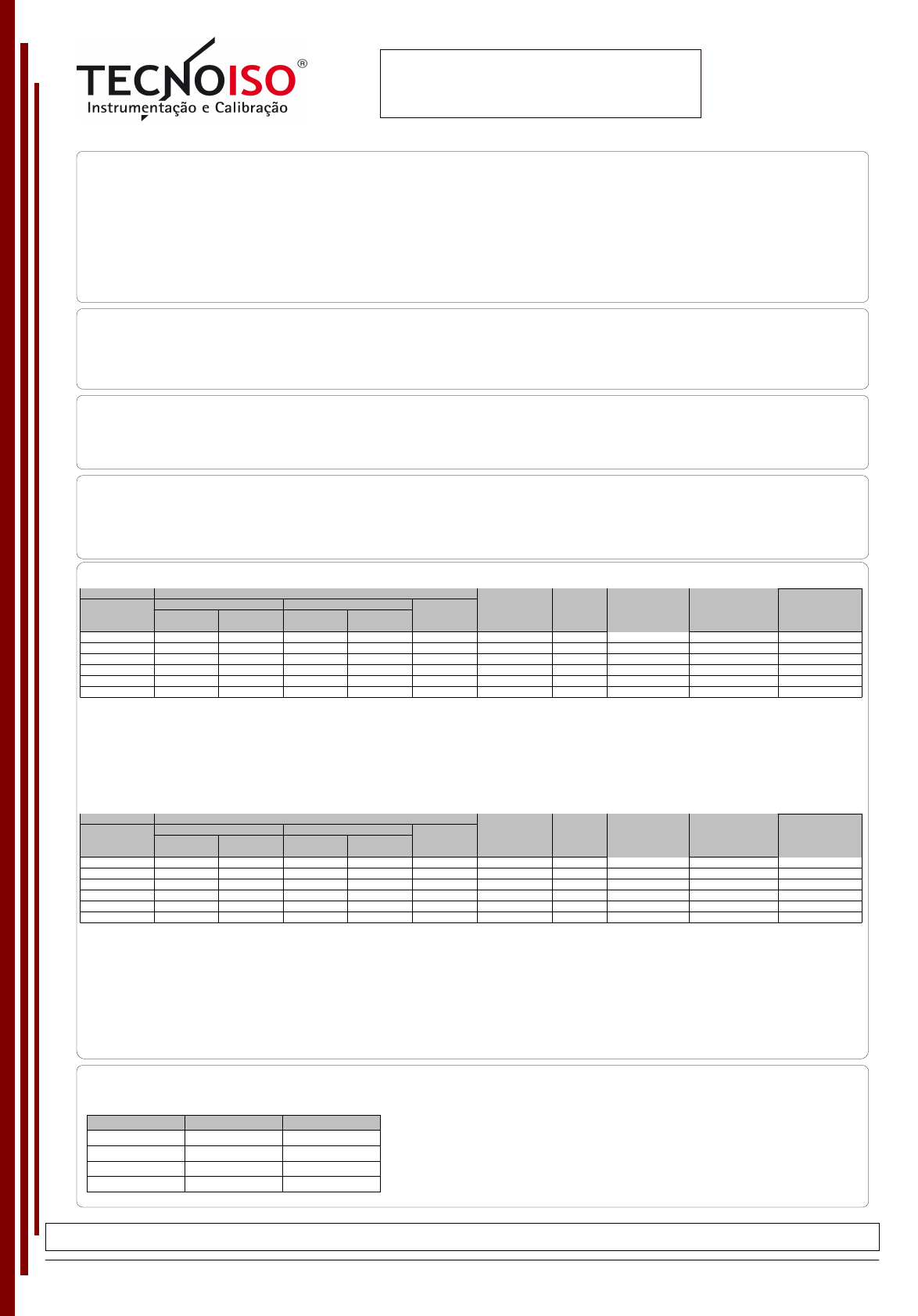 Medições Após Ajuste ( ) Medições Sem Ajuste ou Antes do Ajuste ( ) Temperatura (Mín. | Máx.): ( °C | °C ) Umidade (Mín. | Máx.): ( %UR | %UR ) RVL Título94Título94 Rua: Dona Emma, 1541 - Joinville / SC CEP: 89.211-435 Fone: (47) 3438-3175 Site: www.tecnoiso.com E-mail: tecnoiso@tecnoiso.com TECNOISO TECNOLOGIA E SOLUÇÕES INDUSTRIAIS LTDA - ME A reprodução deste certificado só poderá ser total e depende da aprovação, por escrito do laboratório emitente. 13 32 32 27 22 54 42 55 02 24 55 22 27 00 66 6 04 41 66 02 24 44 20 06 22 44 43 22 57 71 22 41 1 64 42 22 46 63 10 04 51 01 42 36 76 27 63 76 6 45 14 53 10 43 22 45 14 53 10 53 26 76 35 40 45 1 45 30 13 81 /2 4 Aplicável Não Aplicável 60 58 25,5 23,5 ETC Garuva - Mod. Aquec. A Local de Utilização: Erro Máximo Graus de Liberdade Erro Pressão Indicada (V.S.P.) Pressão Indicada (|E.S.|+U) Fator de Abrangência Efetivos Incerteza de Sistemático (E.S.) Média (V.S.P) 2º Ciclo 1º Ciclo (V.I.C.) [bar] k Ýeff Medição (U) [bar] [bar] Decrescente Crescente Decrescente Crescente [bar] [bar] [bar] [bar] [bar] [bar] 0,041 2,00 0,0 0,041 2,00 0,5 0,041 2,00 1,0 0,041 2,00 2,0 0,041 2,00 3,0 0,041 2,00 4,0 0,000 bar 0.132 bar Descrições 0,00% 0,00% 0,00% Após Ajuste Parâmetro Antes do Ajuste Repetitividade: 0,90% 2,03% Histerese: Erro Fiducial: -1,48% Amplitude da Faixa de Medição: É a diferença entre os limites superior e inferior da faixa indicativa do medidor. Repetitividade: É a relação entre a diferença máxima das indicações do medidor num mesmo ponto de pressão ou vácuo, expressa em percentagem da amplitude da faixa de medição do instrumento. Histerese: É a relação entre a diferença máxima das indicações do medidor em um dos ciclos, expressa em percentagem da amplitude da faixa de medição do instrumento. Erro Fiducial: É o erro sistemático dividido pela amplitude da faixa de medição do instrumento, expresso em percentagem. Erro Sistemático = V.I.C. - Média Erro Máximo = |Erro Sistemático| + Incerteza de Medição V.I.C. = Valor Indicado no Instrumento de Medição em Calibração. V.S.P. = Valor Indicado no Sistema de Medição Padrão. Legenda: LABORATÓRIO DE METROLOGIA Certificado de Calibração Nº 11102240323 Calibração Rastreável à RBC - Rede Brasileira de Calibração Próxima Calibração: 03/2025 O instrumento foi calibrado em sua posição de trabalho, permanecendo sobre pressão ou vácuo máximos até que se perceba a estanqueidade do sistema antes de iniciar a calibração. Características Metrológicas Faixa de Indicação: 0 a 4 bar Nº de Série: Não consta Modelo: Analógico Pág. 1 de 2 Descrição do Método de Calibração A calibração foi realizada efetuando dois ciclos de medições no sentido crescente e dois no sentido decrescente por comparação direta com um manômetro padrão conforme procedimento de calibração IT-001. Erro Máximo Graus de Liberdade Erro Pressão Indicada (V.S.P.) Pressão Indicada (|E.S.|+U) Fator de Abrangência Efetivos Incerteza de Sistemático (E.S.) Média (V.S.P) 2º Ciclo 1º Ciclo (V.I.C.) [bar] k Ýeff Medição (U) [bar] [bar] Decrescente Crescente Decrescente Crescente [bar] [bar] [bar] [bar] [bar] [bar] 0,056 2,000 ¤ 0,056 0,000 0,000 0,000 0,000 0,000 0,000 0,0 0,113 2,057 44,820 0,067 -0,046 0,546 0,513 0,562 0,526 0,585 0,5 0,117 2,085 30,740 0,070 -0,047 1,047 1,010 1,068 1,021 1,089 1,0 0,132 2,107 24,590 0,073 -0,059 2,060 2,018 2,085 2,032 2,103 2,0 0,132 2,124 21,400 0,075 -0,057 3,056 3,015 3,074 3,028 3,109 3,0 0,117 2,012 202,620 0,060 -0,057 4,057 4,039 4,039 4,075 4,075 4,0 Endereço: Rua: 2840, 417 - Itapoá / SC Local da Calibração: Instalações do Cliente CONSÓRCIO GÁS SUL Solicitante: Ambiente de Calibração Data da Calibração: 23/03/2024 Rastreabilidade Código: IP 97 #Psi B - Descrição: Multicalibrador Padrão (C4) - Certificado: R6531.11.23 - Emitente: Presys-Pryme Lab - Validade: 11/2024 Proprietário: CONSÓRCIO GÁS SUL Descrição: Manômetro Analógico Valor de Uma Divisão: 0,1 bar Fabricante: Gascat Código: PI-97 Maior Erro Máximo: Umidade (Mín. | Máx.): ( %UR | %UR ) Temperatura (Mín. | Máx.): ( °C | °C ) RVL Título94Título94 Rua: Dona Emma, 1541 - Joinville / SC CEP: 89.211-435 Fone: (47) 3438-3175 Site: www.tecnoiso.com E-mail: tecnoiso@tecnoiso.com TECNOISO TECNOLOGIA E SOLUÇÕES INDUSTRIAIS LTDA - ME A reprodução deste certificado só poderá ser total e depende da aprovação, por escrito do laboratório emitente. 13 32 32 27 22 54 42 55 02 24 55 22 27 00 66 6 04 41 66 02 24 44 20 06 22 44 43 22 57 71 22 41 1 64 42 22 46 63 10 04 51 01 42 36 76 27 63 76 6 45 14 53 10 43 22 45 14 53 10 53 26 76 35 40 45 1 45 30 13 81 /2 4 Data da Calibração: 23/03/2024 Ambiente de Calibração Local da Calibração: Instalações do Cliente Próxima Calibração: 03/2025 23,5 25,5 58 60 Não Glicerina Não Selo Mecânico Não Ponteiro de Arraste Não Contato Elétrico - Outros: Acessórios Ðh < 0: O instrumento em calibração está abaixo do ponto de medição. Ðh > 0: O instrumento em calibração está acima do ponto de medição. Descrição Desnível entre o Padrão e o Instrumento em Calibração Situação na Calibração Ðh>0 * Para conversão no Sistema Internacional de Unidades (SI), utilizar 1 bar = 0.1 MPa, megapascal é a unidade de pressão do SI. LABORATÓRIO DE METROLOGIA Certificado de Calibração Nº 11102240323 Calibração Rastreável à RBC - Rede Brasileira de Calibração * A incerteza expandida de medição é declarada como incerteza padrão combinada, multiplicada pelo fator de abrangência "k", correspondente a uma probabilidade de 95%. A incerteza padrão de medição foi determinada de acordo com a publicação EA-4/02; * Próxima data de calibração conforme solicitação definida pelo cliente. * O preenchimento do Status de Validação do certificado de calibração é de responsabilidade do cliente. * Os resultados apresentados ref