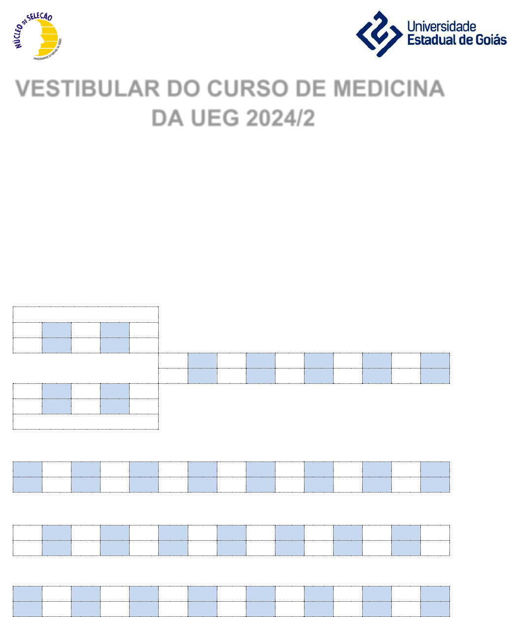 <p>UNIVERSIDADE ESTADUAL DE GOIÁS</p><p>NÚCLEO DE SELEÇÃO</p><p>VESTIBULAR DO CURSO DE MEDICINA</p><p>DA UEG 2024/2</p><p>Gabarito Oficial Preliminar</p><p>Prova Objetiva</p><p>PROVA TIPO 2</p><p>Segunda-feira, 29 de abril de 2024.</p><p>Gerência do Núcleo de Seleção – UEG</p><p>ESPANHOL</p><p>1 2 3 4 5</p><p>C E D A C</p><p>6 7 8 9 10 11 12 13 14 15</p><p>A D B A C E C C E B</p><p>1 2 3 4 5</p><p>B E A C E</p><p>INGLÊS</p><p>16 17 18 19 20 21 22 23 24 25 26 27 28 29 30</p><p>D A C B E C D A A D B C A E B</p><p>31 32 33 34 35 36 37 38 39 40 41 42 43 44 45</p><p>C A D D B C E B B D A E C D A</p><p>46 47 48 49 50 51 52 53 54 55 56 57 58 59 60</p><p>C B D A E B C A D E C E B D B</p>