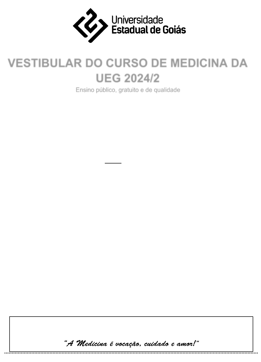 <p>VESTIBULAR DO CURSO DE MEDICINA DA</p><p>UEG 2024/2</p><p>Ensino público, gratuito e de qualidade</p><p>Domingo, 28 de abril de 2024.</p><p>Caderno de Provas</p><p>Objetiva, Discursiva Específica e Redação</p><p>1 . Este caderno de provas é composto de 60 questões objetivas, 4 questões discursivas específicas e 2 propostas</p><p>de construção textual.</p><p>2 . Neste caderno de provas constam as duas opções de Língua Estrangeira Moderna (Espanhol e</p><p>Inglês). O candidato deverá resolver apenas as questões da Língua Estrangeira Moderna de sua opção</p><p>no ato da inscrição.</p><p>3 . O candidato deverá transcrever a frase que está nesta capa de prova para o cartão de respostas.</p><p>4 . Confira todas as páginas e solicite a sua substituição caso apresente falha de impressão ou esteja</p><p>incompleto. Se houver algum erro, comunique ao fiscal de sala.</p><p>5 . Durante a prova, o candidato não poderá levantar-se sem autorização prévia ou comunicar-se com outros</p><p>candidatos.</p><p>6 . As respostas da prova objetiva deverão ser transcritas com caneta esferográfica de corpo transparente e de</p><p>tinta preta ou azul no cartão de respostas. O candidato que descumprir este item arcará com eventual</p><p>prejuízo da ausência de leitura óptica de suas marcações.</p><p>7 . As respostas da prova de redação e da prova discursiva específica deverão ser transcritas nas respectivas</p><p>folhas de respostas, que deverão ser entregue ao fiscal de sala.</p><p>8 . A resposta da prova de Redação deverá ser manuscrita com letra legível, texto composto em cerca de 30</p><p>(trinta) linhas, utilizando caneta esferográfica de corpo transparente e de tinta preta ou azul.</p><p>9 . A folha de resposta da Redação e a folha de resposta da prova discursiva específica são os únicos</p><p>documentos válidos para correção, portanto NÃO deverão ser assinadas, rubricadas ou conterem</p><p>quaisquer palavras ou marcas, desenhos, números, recados, mensagens, rabiscos, nomes ou suas</p><p>abreviações, apelidos, pseudônimo, rubrica que possibilitem a identificação do candidato, sob pena</p><p>de anulação destas provas e da atribuição de nota zero.</p><p>10 . Aguarde autorização do fiscal de sala para iniciar a prova.</p><p>OBSERVAÇÃO: Este caderno contém, para sua consulta, a tabela periódica, os valores de constantes e grandezas físicas, tabela</p><p>trigonométrica e diagrama do espectro eletromagnético.</p><p></p><p>Identificação do candidato</p><p>A T E N Ç Ã O</p><p>O candidato deverá conferir o seu CARTÃO DE RESPOSTAS e, assim que autorizado pelo fiscal de sala, copiar no</p><p>local indicado, com sua caligrafia usual, a seguinte frase:</p><p>2</p><p>Vestibular do Curso de Medicina da UEG 2024/2 Caderno de Provas: Objetiva, Discursiva Específica e Redação</p><p>Rascunho do Gabarito</p><p>Questão Alternativas</p><p>1 a b c d e</p><p>2 a b c d e</p><p>3 a b c d e</p><p>4 a b c d e</p><p>5 a b c d e</p><p>6 a b c d e</p><p>7 a b c d e</p><p>8 a b c d e</p><p>9 a b c d e</p><p>10 a b c d e</p><p>11 a b c d e</p><p>12 a b c d e</p><p>13 a b c d e</p><p>14 a b c d e</p><p>15 a b c d e</p><p>16 a b c d e</p><p>17 a b c d e</p><p>18 a b c d e</p><p>19 a b c d e</p><p>20 a b c d e</p><p>21 a b c d e</p><p>22 a b c d e</p><p>23 a b c d e</p><p>24 a b c d e</p><p>25 a b c d e</p><p>26 a b c d e</p><p>27 a b c d e</p><p>28 a b c d e</p><p>29 a b c d e</p><p>30 a b c d e</p><p>Questão Alternativas</p><p>31 a b c d e</p><p>32 a b c d e</p><p>33 a b c d e</p><p>34 a b c d e</p><p>35 a b c d e</p><p>36 a b c d e</p><p>37 a b c d e</p><p>38 a b c d e</p><p>39 a b c d e</p><p>40 a b c d e</p><p>41 a b c d e</p><p>42 a b c d e</p><p>43 a b c d e</p><p>44 a b c d e</p><p>45 a b c d e</p><p>46 a b c d e</p><p>47 a b c d e</p><p>48 a b c d e</p><p>49 a b c d e</p><p>50 a b c d e</p><p>51 a b c d e</p><p>52 a b c d e</p><p>53 a b c d e</p><p>54 a b c d e</p><p>55 a b c d e</p><p>56 a b c d e</p><p>57 a b c d e</p><p>58 a b c d e</p><p>59 a b c d e</p><p>60 a b c d e</p><p>3</p><p>Vestibular do Curso de Medicina da UEG 2024/2 Caderno de Provas: Objetiva, Discursiva Específica e Redação</p><p>Prova Objetiva</p><p>QUESTÕES DE 1 A 5 (OPÇÃO ESPANHOL)</p><p>Leia o texto a seguir para responder às questões 1 e 2.</p><p>DE POLÍTICA Y COSAS PEORES</p><p>La palabra “dígamelo” no es una bella palabra. No hay en ella ese hálito de poesía que llevan en sí otras palabras como</p><p>“nube”, “flor”, “mujer”. Y sin embargo, Armando, en mí la nube pasó ya, la flor ya no recuerda su perfume y la mujer se fue</p><p>hace mucho tiempo, pero esa palabra, "dígamelo", va en mí como un nudo atado al alma para que no la olvide. Para que no</p><p>olvide la palabra y para que no la olvide a ella. Dije que la mujer se fue, pero la verdad es que jamás estuvo. ¿Tuve yo la</p><p>culpa de eso? Muchas noches me lo he preguntado, y ahora que traigo unas copas encima la pregunta viene otra vez a mí.</p><p>CAMORRA Armando. De política y cosas peores. Disponível em: https://www.elsiglodetorreon.com.mx/noticia/2019/de-politica-y-cosas-</p><p>peores.1648445.html. Acesso em: 20 fev. 2024. [Adaptado].</p><p>Questão 1</p><p>Por la gramática de la lengua española, la palabra “dígamelo” se trata de</p><p>a) un verbo que posee un complemento directo en su estructura.</p><p>b) un verbo que denota una orden o petición, siendo así un subjuntivo.</p><p>c) una palabra clasificada como sobreesdrújula por su acento gráfico.</p><p>d) una palabra esdrújula que consta de dos pronombres complemento.</p><p>e) un complemento directo e indirecto juntos al verbo en subjuntivo.</p><p>Questão 2</p><p>La expresión idiomática “traigo unas copas encima” se caracteriza por</p><p>a) tener falta de comprensión ante casos complejos.</p><p>b) señalar que la memoria nos atormenta a veces.</p><p>c) indicar que el estado de salud está debilitado.</p
