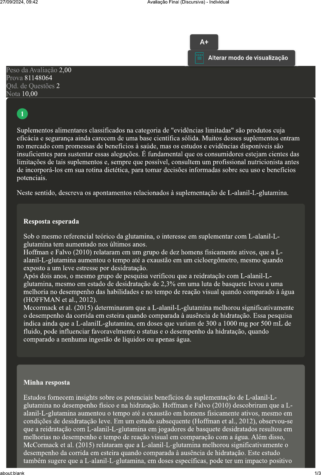 <p>27/09/2024 09:42 Avaliação Final (Discursiva) Individual A+ Alterar modo de visualização Peso da Avaliação 2,00 Prova 81148064 Qtd. de Questões 2 Nota 10,00 1 Suplementos alimentares classificados na categoria de "evidências limitadas" são produtos cuja eficácia e segurança ainda carecem de uma base científica sólida. Muitos desses suplementos entram no mercado com promessas de benefícios à saúde, mas os estudos e evidências disponíveis são insuficientes para sustentar essas alegações. É fundamental que os consumidores estejam cientes das limitações de tais suplementos e, sempre que possível, consultem um profissional nutricionista antes de incorporá-los em sua rotina dietética, para tomar decisões informadas sobre seu uso e benefícios potenciais. Neste sentido, descreva os apontamentos relacionados à suplementação de L-alanil-L-glutamina. Resposta esperada Sob mesmo referencial teórico da glutamina, interesse em suplementar com L-alanil-L- glutamina tem aumentado nos últimos anos. Hoffman e Falvo (2010) relataram em um grupo de dez homens fisicamente ativos, que a L- alanil-L-glutamina aumentou tempo até a exaustão em um mesmo quando exposto a um leve estresse por desidratação. Após dois anos, mesmo grupo de pesquisa verificou que a reidratação com L-alanil-L- glutamina, mesmo em estado de desidratação de 2,3% em uma luta de basquete levou a uma melhoria no desempenho das habilidades e no tempo de reação visual quando comparado à água (HOFFMAN et al., 2012). Mccormack et al. (2015) determinaram que a L-alanil-L-glutamina melhorou significativamente desempenho da corrida em esteira quando comparada à ausência de hidratação. Essa pesquisa indica ainda que a L-alanilL-glutamina, em doses que variam de 300 a 1000 mg por 500 mL de fluido, pode influenciar favoravelmente status e desempenho da hidratação, quando comparado a nenhuma ingestão de líquidos ou apenas água. Minha resposta Estudos fornecem insights sobre os potenciais benefícios da suplementação de L-alanil-L- glutamina no desempenho físico e na hidratação. Hoffman e Falvo (2010) descobriram que a L- alanil-L-glutamina aumentou tempo até a exaustão em homens fisicamente ativos, mesmo em condições de desidratação leve. Em um estudo subsequente (Hoffman et al., 2012), observou-se que a reidratação com L-alanil-L-glutamina em jogadores de basquete desidratados resultou em melhorias no desempenho e tempo de reação visual em comparação com a água. Além disso, McCormack et al. (2015) relataram que a L-alanil-L-glutamina melhorou significativamente o desempenho da corrida em esteira quando comparada à ausência de hidratação. Este estudo também sugere que a L-alanil-L-glutamina, em doses específicas, pode ter um impacto positivo about:blank 1/3</p><p>27/09/2024, 09:42 Avaliação Final (Discursiva) Individual no status e desempenho da hidratação, superando a ingestão apenas de água. Embora esses resultados sugiram vantagens da suplementação de L-alanil-L-glutamina, é importante ressaltar que tais descobertas ainda estão em uma fase inicial de pesquisa. Portanto, enquanto há indicações promissoras, a eficácia e segurança dessa suplementação requerem mais estudos para validação em diferentes grupos populacionais e contextos. Assim, a L-alanil-L-glutamina atualmente se enquadra na categoria de "evidências limitadas", destacando a importância de uma avaliação cuidadosa e orientação de um profissional nutricionista antes de sua incorporação na rotina dietética. Retorno da correção Parabéns, acadêmico, sua resposta atingiu os objetivos da questão e você contemplou esperado, demonstrando a competência da análise e síntese do assunto abordado, apresentando excelentes argumentos próprios, com base nos materiais disponibilizados. 2 O nutricionista esportivo precisa se preparar para algumas competências técnicas inerentes a sua atuação, que vão além do conhecimento básico de bioquímica e fisiologia geral e do exercício. Disserte sobre as demais competências técnicas necessárias nessa área. Resposta esperada São necessárias também competências voltadas à avaliação nutricional: com conhecimentos em antropometria, composição corporal e biótipo ou somatotipia (somatotipo), ideal para diferentes tipos de esportes; análise dietética, avaliação bioquímica e sinais clínicos importantes à conduta alimentar; educação alimentar e nutricional: conhecer os mitos da alimentação, as necessidades nutricionais do esportista, as demandas necessárias em função da carga da prática físico- esportiva; nutrição clínica: detectar possíveis riscos de transtornos alimentares, consequências das interações entre fármacos e nutrientes e entre nutrientes, conhecer as condutas para distúrbios alimentares, amenorreia, anemia, osteoporose e gravidez. Ainda, conhecer suplementos alimentares e compostos ergogênicos, bem como políticas de regularização dos suplementos e critérios específicos. Assim como, estratégias de hidratação e de melhor recuperação após exercício. Minha resposta As disciplinas que devem ser aprofundadas pelo profissional nutricionista esportivo são: Conhecimento das Modalidades Esportivas, Educação Alimentar e Nutricional, Avaliação Nutricional e Nutrição Clínica. 1- Conhecimento das Modalidades Esportivas: Compreender as características específicas de cada modalidade esportiva, incluindo frequência de treinamento, intensidade, periodização e estratégias de hidratação. 2- Educação Alimentar e Nutricional: Dominar os mitos relacionados à alimentação, entender as necessidades nutricionais específicas dos atletas e adaptar a dieta de acordo com as demandas impostas pelo treinamento esportivo. 3- Avaliação Nutricional: Compreender aspectos como antropometria, composição corporal e somatotipia adequada para diferentes modalidades esportivas. 4. Nutrição Clínica: 