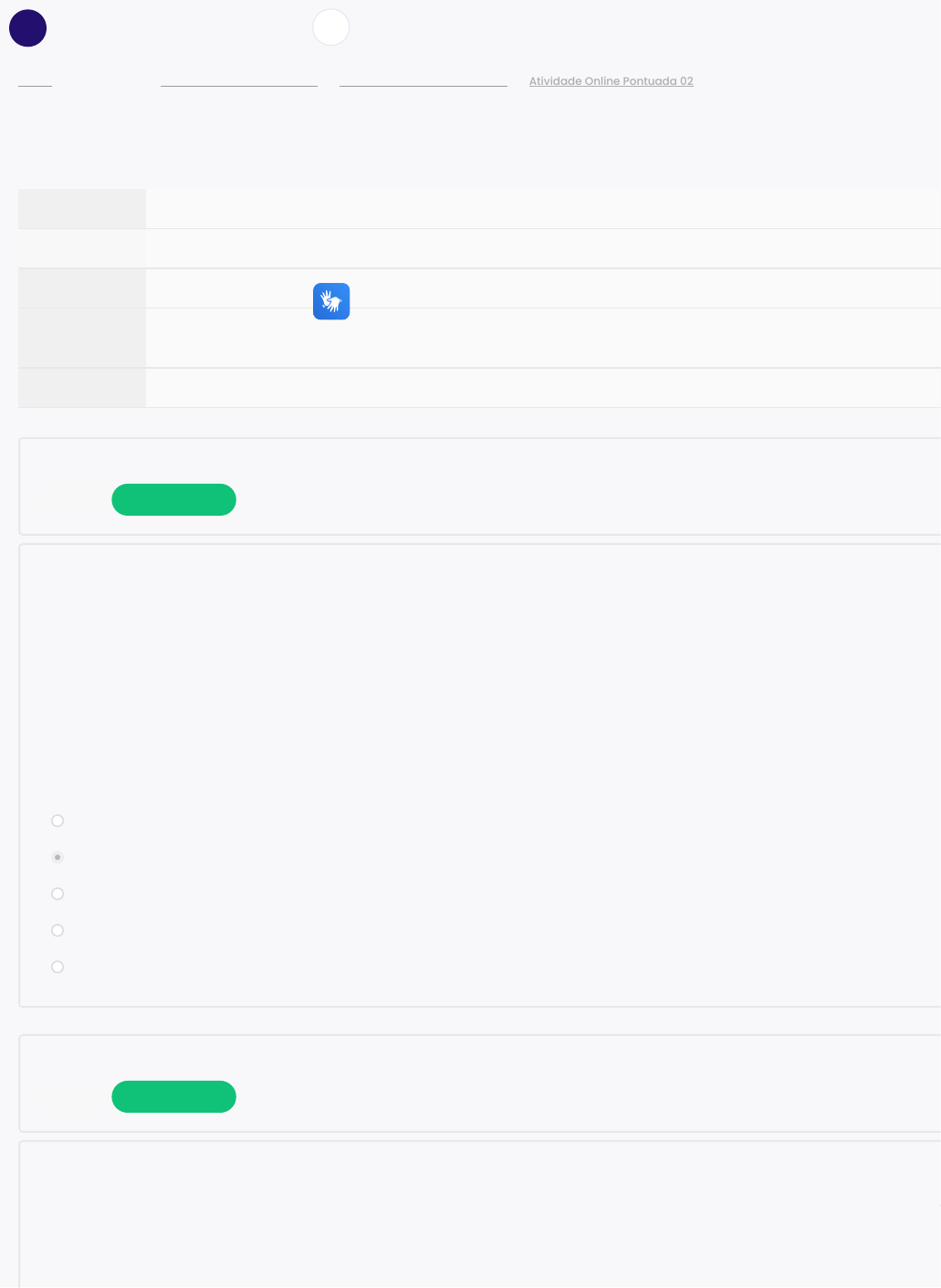 <p>- Meus cursos - - - Painel Genética Básica e Molecular Atividades Pontuadas & Notas Atividade Online Pontuada 02</p><p>Iniciado em quinta, 26 set 2024, 15:35</p><p>Estado Finalizada</p><p>Concluída em quinta, 26 set 2024, 15:57</p><p>Tempo</p><p>empregado 22 minutos 7 segundos</p><p>Avaliar 1,00 de um máximo de 1,00(100%)</p><p>Questão 1</p><p>Completo Atingiu 0,10 de 0,10</p><p>Os telômeros são estruturas especializadas, nas pontas dos cromossomos, que contêm repetições em uma</p><p>curta sequência de DNA que é adicionada à extremidade do carbono 3’ pela enzima telomerase. Os telômeros</p><p>estabilizam os cromossomos, evitando a perda de informação genômica após cada rodada de replicação do</p><p>DNA e associando-se a proteínas para formar um revestimento que ”esconde“ as pontas dos cromossomos</p><p>da maquinaria de reparo de DNA da célula.</p><p>A respeito da enzima TELOMERASE assinale a alternativa correta:</p><p>Escolha uma opção:</p><p>a. A telomerase é encontrada em abundância nos tecidos muscular e nervoso.</p><p>b. A telomerase atua na replicação da porção final da síntese da fita descontínua.</p><p>c. A telomerase possui moléculas de DNA no seu interior que auxiliam na replicação dos telômeros.</p><p>d. A telomerase atua ativamente durante todo o ciclo de vida do organismo.</p><p>e. A telomerase é responsável pela ativação do sistema de apoptose das células.</p><p>Questão 2</p><p>Completo Atingiu 0,10 de 0,10</p><p>Células, procariotas e eucariotas, possuem a capacidade de se dividir e produzir cópias de si mesmas em um</p><p>processo do qual dependem todos os seres vivos. Sobre esse processo de divisão celular, observe as</p><p>assertivas.</p><p>I- Nos seres humanos, nem todas as células são capazes de realizar mitose. Neurônios e células musculares</p><p>são dois tipos celulares altamente especializados em que esse tipo de divisão ocorre apenas na fase</p><p> </p><p>https://ceadsaladeaula.uvv.br/mod/quiz/review.php?attempt=315588&cmid=51878 26/09/2024, 15:58</p><p>Página 1 de 6</p><p>são dois tipos celulares altamente especializados em que esse tipo de divisão ocorre apenas na fase</p><p>embrionária.</p><p>II- A divisão de uma célula em duas células geneticamente idênticas e com o mesmo número cromossômico</p><p>que existia na célula-mãe é denominada meiose.</p><p>III- No processo de divisão das células de reprodução humana (óvulos e espermatozoides), ocorrem todas as</p><p>fases da mitose.</p><p>IV- Metáfase I é a etapa da divisão celular em que ocorre o pareamento dos cromossomos homólogos e pode</p><p>acontecer um fenômeno conhecido como crossing-over, também chamado de permuta.</p><p>Marque a alternativa que melhor reflete as assertivas.</p><p>Escolha uma opção:</p><p>a. Apenas as assertivas I e IV são corretas.</p><p>b. Apenas as assertivas I e III são corretas.</p><p>c. Apenas a assertiva I é correta.</p><p>d. Apenas as assertivas I, II e III são corretas.</p><p>e. Apenas a assertiva IV é correta.</p><p>Questão 3</p><p>Completo Atingiu 0,10 de 0,10</p><p>A palavra “meiose” é derivada do grego “meioum” que significa “redução”. A meiose é um processo de divisão</p><p>celular pelo qual uma célula (produtora de gameta e/ou esporos) diploide origina quatro células haploides</p><p>(possui um único conjunto completo de cromossomos). Nos organismos que se reproduzem sexuadamente, a</p><p>fusão dos gametas (masculino e feminino – herança biparental) origina a célula zigoto (diploide), que se</p><p>desenvolve constituído um novo organismo. A meiose surgiu para manter constante o número de</p><p>cromossomo de uma espécie; através de duas divisões consecutivas (meiose I e II), o número de</p><p>cromossomos de cada gameta é reduzido pela metade (haploide), permitindo, assim, a recuperação do</p><p>número diploide após a fecundação. A meiose também permite a recombinação gênica (crossing over). Esse</p><p>evento é de importância evolutiva, pois, no sucesso da perpetuação das espécies, seria vantajosa a</p><p>variabilidade genética, permitindo uma maior probabilidade de adaptação dos indivíduos às variáveis do</p><p>meio ambiente.</p><p>Assinale a alternativa que apresenta respectivamente a etapa e sub-etapa da divisão meiótica onde ocorre o</p><p>processo recombinação gênica.</p><p>Escolha uma opção:</p><p>a. Prófase I e Paquíteno.</p><p>b. Prófase II e Leptóteno.</p><p>https://ceadsaladeaula.uvv.br/mod/quiz/review.php?attempt=315588&cmid=51878 26/09/2024, 15:58</p><p>Página 2 de 6</p><p>b. Prófase II e Leptóteno.</p><p>c. Metáfase II e Leptóteno.</p><p>d. Anáfase I e Paquíteno.</p><p>e. Anáfase II e Zigóteno.</p><p>Questão 4</p><p>Completo Atingiu 0,10 de 0,10</p><p>O processo de replicação do DNA é caracterizado pela duplicação da molécula durante a fase S da divisão</p><p>celular. O DNA é replicado pela deselicoidização dos dois filamentos da dupla hélice e pela construção de</p><p>novos filamentos complementares em cada um dos filamentos separados da dupla hélice original.</p><p>Assinale a alternativa abaixo que contém APENAS moléculas que participam do processo de replicação do</p><p>DNA</p><p>Escolha uma opção:</p><p>a. DNA ligases, DNA quinase, Proteínas de ligação à fita simples e Helicases.</p><p>b. RNA ligases, Histonas, DNA ligases e Proteínas de ligação à fita simples.</p><p>c. Topoisomerases, DNA polimerases, Histonas e DNA ligases.</p><p>d. Helicases, Proteínas de ligação à fita simples, RNA ligases e Topoisomerases.</p><p>e. Primases, DNA polimerases, Topoisomerases e Helicases.</p><p>Questão 5</p><p>Completo Atingiu 0,10 de 0,10</p><p>Sobre a replicação de DNA, leia as sentenças abaixo.</p><p>O replissomo é o maquinário molecular responsável pela síntese de DNA.</p><p>Porque</p><p>Ele coordena a atividade de proteínas acessórias necessárias para a adição dos p