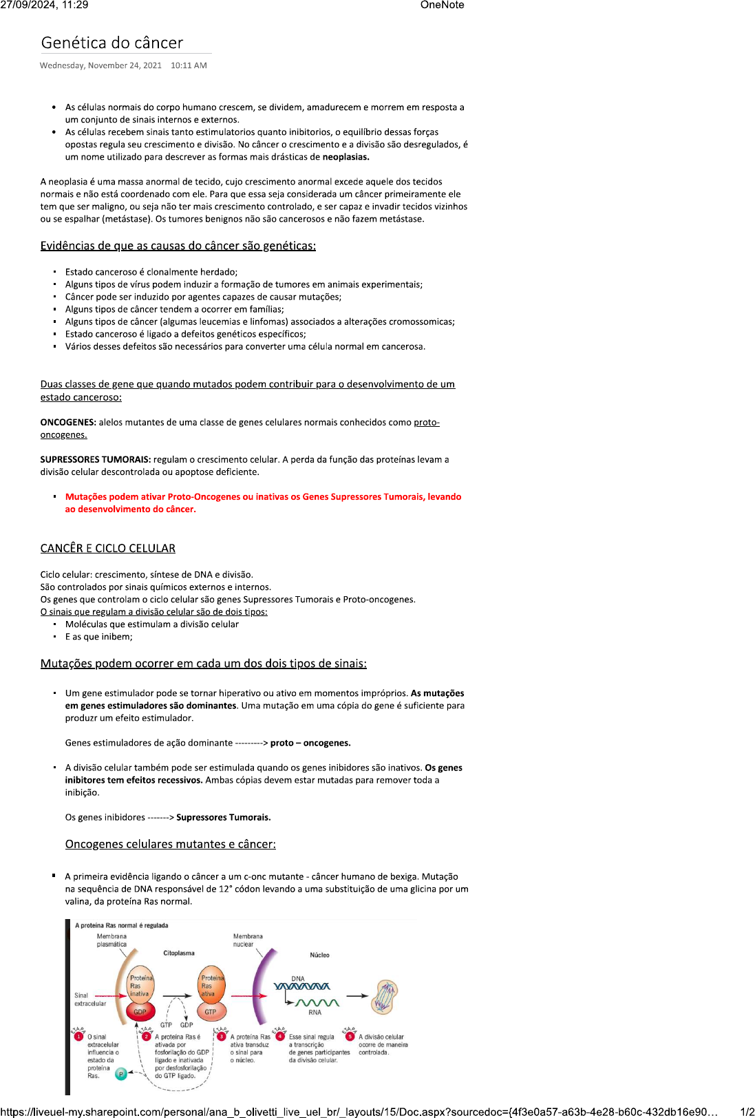 <p>27/09/2024, 11:29 OneNote Genética do câncer Wednesday, November 24, 2021 10:11 AM As células normais do corpo humano crescem, se dividem, amadurecem e morrem em resposta a um conjunto de sinais internos e externos. As células recebem sinais tanto estimulatorios quanto inibitorios, o equilíbrio dessas forças opostas regula seu crescimento e divisão. No câncer o crescimento e a divisão são desregulados, é um nome utilizado para descrever as formas mais drásticas de neoplasias. A neoplasia é uma massa anormal de tecido, cujo crescimento anormal excede aquele dos tecidos normais e não está coordenado com ele. Para que essa seja considerada um câncer primeiramente ele tem que ser maligno, ou seja não ter mais crescimento controlado, e ser capaz e invadir tecidos vizinhos ou se espalhar (metástase). Os tumores benignos não são cancerosos e não fazem metástase. Evidências de que as causas do câncer são genéticas: Estado canceroso é clonalmente herdado; Alguns tipos de vírus podem induzir a formação de tumores em animais experimentais; Câncer pode ser induzido por agentes capazes de causar mutações; Alguns tipos de câncer tendem a ocorrer em famílias; Alguns tipos de câncer (algumas leucemias e linfomas) associados a alterações cromossomicas; Estado canceroso é ligado a defeitos genéticos específicos; Vários desses defeitos são necessários para converter uma célula normal em cancerosa. Duas classes de gene que quando mutados podem contribuir para o desenvolvimento de um estado canceroso: ONCOGENES: alelos mutantes de uma classe de genes celulares normais conhecidos como proto- oncogenes. SUPRESSORES TUMORAIS: regulam o crescimento celular. A perda da função das proteínas levam a divisão celular descontrolada ou apoptose deficiente. Mutações podem ativar Proto-Oncogenes ou inativas os Genes Supressores Tumorais, levando ao desenvolvimento do câncer. E CICLO CELULAR Ciclo celular: crescimento, síntese de DNA e divisão. São controlados por sinais químicos externos e internos. Os genes que controlam o ciclo celular são genes Supressores Tumorais e Proto-oncogenes. o sinais que regulam a divisão celular são de dois tipos: Moleculas que estimulam a divisão celular E as que inibem; Mutações podem ocorrer em cada um dos dois tipos de sinais: Um gene estimulador pode se tornar hiperativo ou ativo em momentos impróprios. As mutações em genes estimuladores são dominantes. Uma mutação em uma cópia do gene é suficiente para produzr um efeito estimulador. Genes estimuladores de ação dominante proto oncogenes. A divisão celular também pode ser estimulada quando os genes inibidores são inativos. Os genes inibitores tem efeitos recessivos. Ambas cópias devem estar mutadas para remover toda a inibição. Os genes inibidores Supressores Tumorais. Oncogenes celulares mutantes e câncer: A primeira evidência ligando o câncer a um mutante - câncer humano de bexiga. Mutação na sequência de DNA responsável de 12° códon levando a uma substituição de uma glicina por um valina, da proteína Ras normal. A proteína Ras normal é regulada Membrana Membrana plasmática nuclear Citoplasma Núcleo Proteína DNA Ras Ras Sinal inativa ativa extracelular GDP GTP RNA A GTP GDP sinal A proteína Ras é A proteína Ras Esse sinal regula A divisão celular extracelular ativada por ativa transduz a transcrição ocorre de maneira influencia fosforilação do GDP o sinal para de genes participantes controlada. estado da ligado inativada núcleo. da divisão celular. proteína por desfosforilação Ras. do GTP ligado. 1/2</p><p>27/09/2024, 11:29 OneNote A proteína Ras mutante não é regulada Membrana Membrana plasmática nuclear Citoplasma Núcleo DNA Ras ativa Sinal extracelular RNA GTP Câncer sinal A proteína Ras A proteína Ras Esse sinal causa a A divisão celular extracelular não mutante mutante transduz transcrição imprópria ocorre de maneira influencia permanece no um sinal constitutivo de genes participantes descontrolada estado da proteína estado ativo. para núcleo. da divisão celular. Ras mutante.</p>