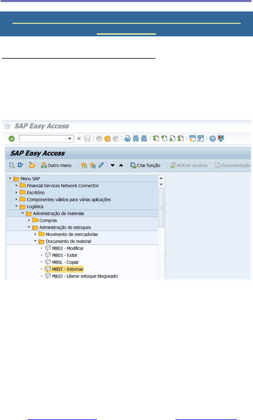 <p>Curso Prático de MM 3 – Movimentação de Mercadorias – Aula 7</p><p>Sites: www.grandesprojetos.com www.juliobattisti.com.br</p><p>Página 1 – Última Atualização – 06.10.2023</p><p>Proibido o uso deste material em sala de aula e em treinamentos sem autorização do autor.</p><p>Aula 7 – Estorno de Documento de Material – mbst,</p><p>mb03 e mb51</p><p>Estorno de Documento de Material – mbst, mb03 e mb51</p><p> O que é: É o estorno de documento de material na transação MBST;</p><p> Quando usar: Quando se quer estornar um documento de material específico;</p><p> Como Fazer: O código da transação para definir países é: mbst</p><p>Copyright by SAP AG</p><p>Figura – Estorno de Documento de Material – Transação mbst</p><p>O estorno de documento de material na transação MBST é um processo no sistema que</p><p>permite reverter a movimentação de materiais registrada em um documento.</p><p>Curso Prático de MM 3 – Movimentação de Mercadorias – Aula 7</p><p>Sites: www.grandesprojetos.com www.juliobattisti.com.br</p><p>Página 2 – Última Atualização – 06.10.2023</p><p>Proibido o uso deste material em sala de aula e em treinamentos sem autorização do autor.</p><p>Copyright by SAP AG</p><p>Figura – Estornar Documento de Material – 1ª Tela</p><p>Primeiramente entra-se com a Data de Lançamento. Em seguida digita o número do Doc.</p><p>Material. O sistema busca o último documento aberto ou salvo no sistema. Caso não seja este</p><p>o documento, você pode alterar o número do documento ou realizar uma busca pelo</p><p>documento a ser estornado.</p><p>Depois coloca-se o Ano do Doc do Material. Em Motivo do Movimento, você pode colocar, por</p><p>exemplo = 0002 – Incompleto.</p><p>As informações de “Nota de Acompanhamento de Mercadoria” deixa-se com os valores</p><p>padrões.</p><p>Curso Prático de MM 3 – Movimentação de Mercadorias – Aula 7</p><p>Sites: www.grandesprojetos.com www.juliobattisti.com.br</p><p>Página 3 – Última Atualização – 06.10.2023</p><p>Proibido o uso deste material em sala de aula e em treinamentos sem autorização do autor.</p><p>Copyright by SAP AG</p><p>Figura – Motivo do Movimento (Estorno)</p><p>Copyright by SAP AG</p><p>Figura – Doc. Material</p><p>Copyright by SAP AG</p><p>Figura – Botão ENTER</p><p>Curso Prático de MM 3 – Movimentação de Mercadorias – Aula 7</p><p>Sites: www.grandesprojetos.com www.juliobattisti.com.br</p><p>Página 4 – Última Atualização – 06.10.2023</p><p>Proibido o uso deste material em sala de aula e em treinamentos sem autorização do autor.</p><p>Copyright by SAP AG</p><p>Figura – Lista de Documentos de Material</p><p>Copyright by SAP AG</p><p>Figura – Lista de Materiais Disponíveis</p><p>Curso Prático de MM 3 – Movimentação de Mercadorias – Aula 7</p><p>Sites: www.grandesprojetos.com www.juliobattisti.com.br</p><p>Página 5 – Última Atualização – 06.10.2023</p><p>Proibido o uso deste material em sala de aula e em treinamentos sem autorização do autor.</p><p>Caso não saiba o número do documento, você pode clicar na caixa Mach Code e realizar a</p><p>pesquisa.</p><p>Copyright by SAP AG</p><p>Figura – Botão ENTER</p><p>Copyright by SAP AG</p><p>Figura – Estornar Documento de Material: Tela de Seleção</p><p>Copyright by SAP AG</p><p>Figura – Botão Gravar</p><p>Copyright by SAP AG</p><p>Figura – Número do Documento Salvo</p><p>Curso Prático de MM 3 – Movimentação de Mercadorias – Aula 7</p><p>Sites: www.grandesprojetos.com www.juliobattisti.com.br</p><p>Página 6 – Última Atualização – 06.10.2023</p><p>Proibido o uso deste material em sala de aula e em treinamentos sem autorização do autor.</p><p>Copyright by SAP AG</p><p>Figura – Seleção de Localizações Disponíveis</p><p>Agora você pode visualizar o documento lançado. Vá para o Menu – Documento de Material /</p><p>Exibir ou vá ou para a transação mb03 (visão compras) ou fb03 (visão financeira).</p><p>Copyright by SAP AG</p><p>Figura – Botão ENTER</p><p>Em seguida aparecerá a síntese do documento. Para visualizar o Documento Contábil, clique</p><p>no botão “Docs. Contábeis”.</p><p>Curso Prático de MM 3 – Movimentação de Mercadorias – Aula 7</p><p>Sites: www.grandesprojetos.com www.juliobattisti.com.br</p><p>Página 7 – Última Atualização – 06.10.2023</p><p>Proibido o uso deste material em sala de aula e em treinamentos sem autorização do autor.</p><p>Copyright by SAP AG</p><p>Figura – Síntese do Documento de Material</p><p>Copyright by SAP AG</p><p>Figura – Botão Docs. Contábeis</p><p>Copyright by SAP AG</p><p>Figura – Lista de Documentos na Contabilidade</p><p>Curso Prático de MM 3 – Movimentação de Mercadorias – Aula 7</p><p>Sites: www.grandesprojetos.com www.juliobattisti.com.br</p><p>Página 8 – Última Atualização – 06.10.2023</p><p>Proibido o uso deste material em sala de aula e em treinamentos sem autorização do autor.</p><p>Copyright by SAP AG</p><p>Figura – Documento Contábil</p><p>Na janela que se abre dê um duplo clique no número do Documento Contábil.</p><p>Copyright by SAP AG</p><p>Figura – Exibir Documento Contábil</p><p>Copyright by SAP AG</p><p>Figura – Botão Voltar</p><p>Para finalizarmos, agora iremos para a mb51. Para facilitar a busca, coloque a data de</p><p>lançamento do seu documento de estorno.</p><p>Curso Prático de MM 3 – Movimentação de Mercadorias – Aula 7</p><p>Sites: www.grandesprojetos.com www.juliobattisti.com.br</p><p>Página 9 – Última Atualização – 06.10.2023</p><p>Proibido o uso deste material em sala de aula e em treinamentos sem autorização do autor.</p><p>Copyright by SAP AG</p><p>Figura – Lista de Documentos de Material</p><p>Copyright by SAP AG</p><p>Figura – Seleção de Localizações Disponíveis</p><p>Curso Prático de MM 3 – Movimentação de Mercadorias – Aula 7</p><p>Sites: www.grandesprojetos.co