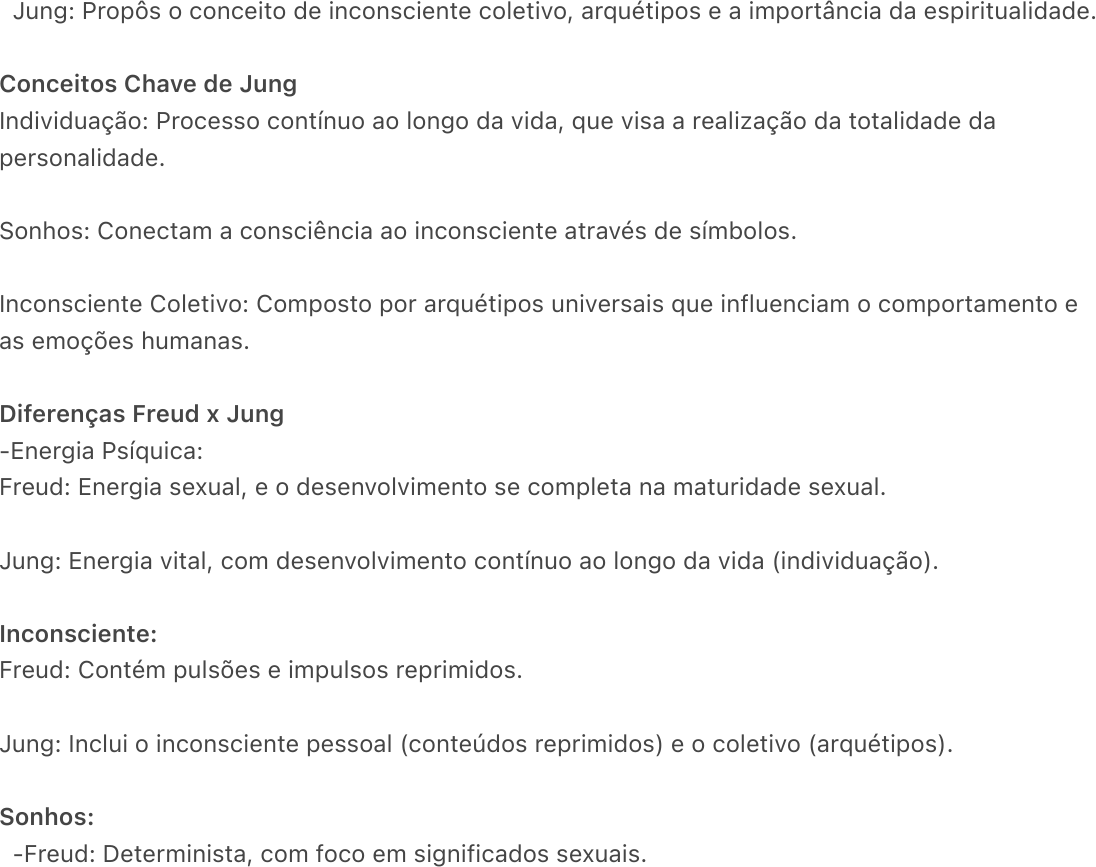 <p>Resumo Junguiana</p><p>Origens da Psicologia Analítica</p><p>- Definição: É um conjunto de conhecimentos que investiga a estrutura e funcionamento da</p><p>psique e uma prática psicoterapêutica formulada por Carl Jung.</p><p>- Influências: Jung escolheu a psiquiatria após estudar sobre psicose, definida como doença da</p><p>personalidade no manual de psiquiatria.</p><p>- Bleuer: Tentou humanizar o tratamento psiquiátrico, tratando problemas mentais com mais</p><p>dignidade. Nessa época, a esquizofrenia era considerada demência precoce.</p><p>Ruptura com Freud</p><p>Motivo: Divergências teóricas, principalmente sobre a energia psíquica e o inconsciente.</p><p>Freud: Enfatizava a repressão sexual e o complexo de Édipo.</p><p>Jung: Propôs o conceito de inconsciente coletivo, arquétipos e a importância da espiritualidade.</p><p>Conceitos Chave de Jung</p><p>Individuação: Processo contínuo ao longo da vida, que visa a realização da totalidade da</p><p>personalidade.</p><p>Sonhos: Conectam a consciência ao inconsciente através de símbolos.</p><p>Inconsciente Coletivo: Composto por arquétipos universais que influenciam o comportamento e</p><p>as emoções humanas.</p><p>Diferenças Freud x Jung</p><p>-Energia Psíquica:</p><p>Freud: Energia sexual, e o desenvolvimento se completa na maturidade sexual.</p><p>Jung: Energia vital, com desenvolvimento contínuo ao longo da vida (individuação).</p><p>Inconsciente:</p><p>Freud: Contém pulsões e impulsos reprimidos.</p><p>Jung: Inclui o inconsciente pessoal (conteúdos reprimidos) e o coletivo (arquétipos).</p><p>Sonhos:</p><p>-Freud: Determinista, com foco em significados sexuais.</p><p>-Jung: São símbolos conectando consciência e inconsciente.</p><p>- Cultura:</p><p>Mobile User</p><p>- Freud: Resultado da sublimação das pulsões sexuais.</p><p>-Jung: Baseada em arquétipos e experiências emocionais herdadas.</p><p>Psique Junguiana</p><p>- Composição: Estruturada em esferas concêntricas como uma cebola.</p><p>- Camada mais superficial: Consciência, centrada no ego.</p><p>- Inconsciente Pessoal: Contém complexos (vivências emocionais que afetam o ego).</p><p>- Inconsciente Coletivo: Contém arquétipos (padrões universais de comportamento).</p><p>- Ego: Centro da consciência, ligado ao Self (centro regulador da psique) através de um eixo</p><p>(ego-Self).</p><p>Individuação e Espiritualidade</p><p>Individuação: Processo pelo qual o indivíduo se torna consciente de si mesmo e de sua</p><p>totalidade psíquica.</p><p>Espiritualidade: Inclui experiências profundas, conexão com o sagrado e transcendência do ego.</p><p>Jung acreditava que a espiritualidade é uma força motriz para o desenvolvimento pessoal.</p><p>Crianças e o Inconsciente Coletivo</p><p>Início da vida: Crianças estão enraizadas no inconsciente coletivo até começarem a formar uma</p><p>identidade consciente.</p><p>Arquétipos: Manifestações do inconsciente coletivo aparecem em sonhos arquetípicos nas</p><p>crianças.</p><p>Self e Processo de Individuação</p><p>-Self: O centro profundo da psique que organiza e regula toda a personalidade.</p><p>Individuação: Busca pela realização da personalidade total, um processo contínuo ao longo da</p><p>vida.</p><p>A Consciência e o Complexo do Ego</p><p>Ego como centro da consciência: Para Jung, o ego contém todos os conteúdos conscientes,</p><p>sendo o ponto central da consciência. Sem o ego, não é possível existir consciência, pois ele</p><p>associa emoções, ideias e sentimentos ao consciente.</p><p>•Duas bases do ego•</p><p>Somática (corporal): A percepção do corpo, suas sensações e necessidades.</p><p>Mobile User</p><p>Psíquica: Inclui a vontade, capacidade de concentração e memória. A vontade permite ao ego</p><p>canalizar energia e modificar reflexos ou instintos.</p><p>Memória e identidade: A memória está ligada à capacidade de aprender, se lembrar de eventos</p><p>passados e planejar o futuro. Isso nos dá um senso contínuo de identidade, essencial para nossa</p><p>existência consciente.</p><p>Desenvolvimento da Consciência</p><p>Evolução da consciência: A consciência não é fixa, mas está em constante desenvolvimento e</p><p>depende de fatores históricos e culturais.</p><p>Teoria de Neumann: A consciência individual passa pelos mesmos estágios de desenvolvimento</p><p>que a humanidade. Ela surge do inconsciente e progride em padrões arquétipos.</p><p>Ego e inconsciente: Inicialmente, o ego tem uma atitude passiva no bebê, mas conforme a</p><p>criança se desenvolve, o ego se torna mais ativo, aprendendo a lidar com as demandas internas</p><p>e externas.</p><p>Relação com o inconsciente: O ego pode ser influenciado pelo inconsciente, mas também pode</p><p>se defender de seus conteúdos, o que leva à repressão de emoções e ideias (que passam a</p><p>compor a "sombra").</p><p>Funções do Ego na Personalidade</p><p>Adaptação: O ego ajuda na adaptação à vida interior (psique) e exterior (mundo). Conforme o</p><p>ego se fortalece, viver torna-se mais fácil, pois ele organiza pensamentos, sentimentos e</p><p>memórias, garantindo um senso de continuidade.</p><p>-Individuação: A individuação, tornar-se quem realmente somos, depende da capacidade do ego</p><p>de integrar as experiências conscientes. Uma pessoa altamente individuada é capaz de tornar</p><p>mais conteúdos psíquicos conscientes, o que resulta em equilíbrio.</p><p>Simbolização: O ego ajuda a criar significados para a vida, proporcionando um sentido de</p><p>continuidade e previsibilidade. A capacidade de simbolizar experiências é fundamental para dar</p><p>direção à nossa existência.</p><p>Desenvolvimento das Funções Psicológicas</p><p>- Quatro Funções Psicológicas:</p><p>Pensamento: Racional, focado na lógica e análise objetiva.</p><p>Sentimento: Racional, relacionado à avaliação de valor (não confundir com emoção)</p><p>Sensa