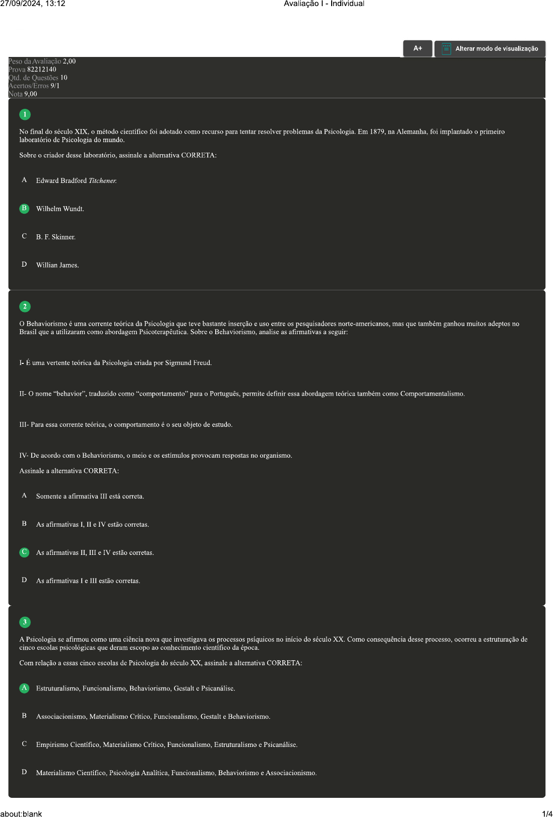 <p>27/09/2024, 13:12 Avaliação Individual A+ Alterar modo de visualização Peso da Avaliação 2,00 Prova 82212140 Otd. de Questões 10 Acertos/Erros 9/1 Nota 1 No final do século XIX. o método científico foi adotado como recurso para tentar resolver problemas da Psicologia. Em 1879. na Alemanha. foi implantado o primeiro laboratório de Psicologia do mundo. Sobre criador desse assinale a alternativa CORRETA: A Edward Bradford Titchener B Wilhelm Wundt C Skinner. D Willian James. 2 O Behaviorismo é uma corrente teórica da Psicologia que teve bastante inserção e uso entre os pesquisadores norte-americanos. mas que também ganhou muitos adeptos no Brasil que a utilizaram como abordagem Psicoterapêutica. Sobre Behaviorismo. analise as afirmativas a seguir: I- É uma vertente teórica da Psicologia criada por Sigmund II- O nome "behavior". traduzido como "comportamento" para Português, permite definir essa abordagem teórica também como Comportamentalismo III- Para essa corrente teórica, comportamento é seu objeto de estudo. IV- De acordo com O Behaviorismo. o meio e os estímulos provocam respostas no organismo. Assinale a alternativa CORRETA: A Somente a afirmativa III está correta. B As afirmativas I. e IV estão corretas. C As afirmativas III e IV estão corretas. D As afirmativas I III estão corretas. 3 A Psicologia se afirmou como uma ciência nova que investigava os processos psíquicos no início do século Como consequência desse processo, ocorreu a estruturação de cinco escolas psicológicas que deram escopo ao conhecimento científico da época. Com relação a essas cinco escolas de Psicologia do século assinale a alternativa CORRETA Estruturalismo. Funcionalismo. Behaviorismo. Gestalt e Psicanálise. B Materialismo Funcionalismo. Gestalt e C Empirismo Científico. Materialismo Crítico. Funcionalismo. Estruturalismo e Psicanálise. D Materialismo Científico. Psicologia Analítica. Funcionalismo. Behaviorismo e about:blank 1/4</p><p>27/09/2024, 13:12 Avaliação Individual No século XX, quando a Psicologia se estabeleceu como ciência, diferentes pesquisadores constituíram novos objetos de surgindo correntes teóricas como: a Gestalt e a Sobre a assinale a alternativa CORRETA: A A Psicanálise surgiu a partir da prática da Psicofísica. resgatando para a Psicologia a relevância da afetividade e trazendo a proposta da consciência como objeto de estudo. B A investigação do inconsciente freudiano representa compreender as características estruturais da mente e buscar os elementos que compõem a consciência C A Psicanálise emergiu como uma negação da fragmentação das ações e processos humanos, afirmadas pelas abordagens da Psicologia científica do século que entendia homem como uma totalidade. D O trabalho com a Psicanálise corresponde a seguir o processo inaugural de Freud e compreender funcionamento das áreas obscuras da vida psíquica, driblando os mecanismos de defesa. 5 Para que psicólogo possa trabalhar afinado a uma equipe multiprofissional, ele precisa cumprir a exigência de trocas com outros profissionais e que estes em conjunto consigam atingir a complexidade dos casos que precisam e buscam tratamento e de compreender como que contexto interfere no processo de subjetivação de cada indivíduo. Acerca dos desafios e facilitadores da prática do psicólogo em uma equipe multiprofissional. analise as afirmativas a seguir: Os desafios a prática do psicólogo são os incentivos às ações conjuntas, à integralidade e à interligação entre os profissionais de diferentes áreas do conhecimento, e que atrapalham que cada um execute seu próprio trabalho. II- Os desafios que atrapalham a efetuação da interdisciplinaridade na atuação das equipes é a formação de alguns profissionais, que preconizam seus próprios conhecimentos técnicos invalidando as práticas do contexto social em que se trabalha e a dos outros profissionais. III- Os desafios têm a ver com a prática interdisciplinar que intenciona desmerecer ou deslegitimar as especialidades. que precisa ser utilizado na área de trabalho é a fragmentação do conhecimento. entendendo e respeitando as singularidades de cada área profissional. que facilita o trabalho de uma equipe multiprofissional é, a atuação do psicólogo como ator principal, trazendo receptividade e escuta especializada para a harmonia do ambiente de trabalho. Assinale a alternativa CORRETA: A As afirmativas e IV estão corretas. Somente a afirmativa II está correta. C As afirmativas e III estão corretas D As afirmativas III e IV estão corretas. Revisar Conteúdo do Livro 6 Quando a Psicologia começa a se distanciar da Filosofia e da Biologia, estruturaram-se formas de explicar funcionamento da mente e comportamento humanos a partir de coordenadas científicas. Antes era comum que as escolas disputassem entre si aquela que teria domínio da Psicologia. No entanto, hoje já se parte do entendimento do ecletismo da Psicologia. Sobre as primeiras correntes teóricas ou escolas de Psicologia, associe os itens, utilizando código a seguir: I- II- Associacionismo. III- Estruturalismo. ( ) O nome dessa escola advém do entendimento de que a aprendizagem se constitui por um processo de associação das ideias das mais simples às mais complexas. about:blank 2/4</p><p>27/09/2024, 13:12 Avaliação Individual ( ) Ampla parte de sua pesquisa foi estruturada em experiências pessoais, reproduzidas com rigor em diferentes partes de suas obras, como "A interpretação dos sonhos" (1900) e "A psicopatologia da vida cotidiana" (1901), dentre outras. ( ) Esta escola foi implementada por Wundt e seu método de observação é a introspecção. ( ) O importante autor dessa escola é Edward L. e sua relevância está em ter se tornado autor de uma primeira teoria de aprendizagem na Psicologia. Assinale a alternativa que apresenta a sequência CORRETA: A B D 7 A Psicologia é um saber que procura entender homem a par