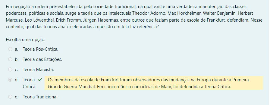 <p>Em negação à ordem pré-estabelecida pela sociedade tradicional, na qual existe uma verdadeira manutenção das classes poderosas, políticas e sociais, surge a teoria que os intelectuais Theodor Adorno, Max Horkheimer, Walter Benjamin, Herbert Marcuse, Leo Löwenthal, Erich Fromm, Jürgen Habermas, entre outros que faziam parte da escola de Frankfurt, defendiam. Nesse contexto, qual das teorias abaixo elencadas a questão em tela faz referência? Escolha uma opção: a. Teoria Pós-Crítica. b. Teoria das Estações. Teoria Marxista. d. Teoria Os membros da escola de Frankfurt foram observadores das mudanças na Europa durante a Primeira Grande Guerra Mundial. Em concordância com ideias de Marx, foi defendida a Teoria Crítica. e. Teoria Tradicional.</p>
