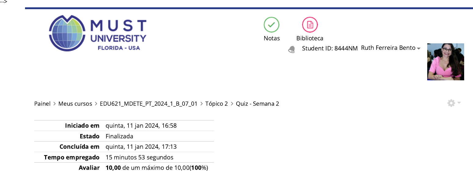 <p>Painel Meus cursos EDU621_MDETE_PT_2024_1_B_07_01 Tópico 2 Quiz - Semana 2</p><p>Iniciado em quinta, 11 jan 2024, 16:58</p><p>Estado Finalizada</p><p>Concluída em quinta, 11 jan 2024, 17:13</p><p>Tempo empregado 15 minutos 53 segundos</p><p>Avaliar 10,00 de um máximo de 10,00(100%)</p><p>--></p><p>Student ID: 8444NM</p><p>Notas Biblioteca</p><p> </p><p>Ruth Ferreira Bento</p><p>Questão 1 Correto Atingiu 1,00 de 1,00</p><p>Assinale a competência do Designer Instrucional relacionada à comunicação:</p><p>Escolha uma opção:</p><p>a. Preocupar-se com a usabilidade e com a capacidade de motivação dos prováveis participantes dos cursos.</p><p>b. Atualizar e melhorar habilidades, atitudes e conhecimentos referentes ao design instrucional e as suas áreas</p><p>relacionadas.</p><p>c. Identi�car e descrever as características da população-alvo.</p><p>d. Promover colaboração, parcerias e relacionamentos entre os participantes de um projeto de design.</p><p>A resposta correta é: Preocupar-se com a usabilidade e com a capacidade de motivação dos prováveis participantes dos cursos.</p><p>Questão 2 Correto Atingiu 1,00 de 1,00</p><p>Considerando as interações síncronas e assíncronas:</p><p>I – Síncronas: webconferência, chat, fóruns, acesso à internet.</p><p>II – Assíncronas: fóruns, avaliações, quizzes, debates.</p><p>Escolha uma opção:</p><p>a. I e II são falsas</p><p>b. I e II são verdadeiras</p><p>c. II é verdadeira e I é falsa</p><p>d. I é falsa e II é verdadeira</p><p>A resposta correta é: I é falsa e II é verdadeira</p><p>Questão 3 Correto Atingiu 1,00 de 1,00</p><p>Assinale a alternativa que indica a importância da colaboração de especialistas com os conteudistas para validar os materiais</p><p>selecionados:</p><p>Escolha uma opção:</p><p>a. Essencial na integralização dos materiais construídos pela equipe de design instrucional.</p><p>b. Necessário para a de�nição das avaliações que serão inseridas no design instrucional.</p><p>c. Importante para que os materiais tenham diferentes formatos em diferentes mídias.</p><p>d. Fundamental para referenciar os pontos do plano de ensino no conteúdo que foi desenvolvido pelo conteudista.</p><p>A resposta correta é: Essencial na integralização dos materiais construídos pela equipe de design instrucional.</p><p>Questão 4 Correto Atingiu 1,00 de 1,00</p><p>O conteúdo programático contém a descrição dos conteúdos elencados na ementa e:</p><p>Escolha uma opção:</p><p>a. Soma-se ao conteúdo programático para dar ao aluno a visão do que já conhece, e é necessário para entrar no curso.</p><p>b. Analisa o atual cenário da educação trazendo os caminhos para a solução dos problemas detectados.</p><p>c. Sintetiza todo o trabalho do Design Instrucional.</p><p>d. Deve ser estruturado em seções, temas, módulos, aulas, detalhando os assuntos gerais e especí�cos que serão</p><p>abordados ao longo da disciplina.</p><p>A resposta correta é: Deve ser estruturado em seções, temas, módulos, aulas, detalhando os assuntos gerais e especí�cos que serão</p><p>abordados ao longo da disciplina.</p><p>Questão 5 Correto Atingiu 1,00 de 1,00</p><p>A gestão da comunicação deve ser considerada porque:</p><p>Escolha uma opção:</p><p>a. A comunicação entre todos os envolvidos no projeto é importante para a qualidade da produção e o alcance dos</p><p>objetivos previstos.</p><p>b. De�ne as regras de quem é hierarquicamente compromissado e pode tomar as decisões de forma aleatória.</p><p>c. O trabalho do Designer Instrucional visa atender a educação e áreas correlatas.</p><p>d. O Designer Instrucional precisa saber escrever e editar mensagens claras, concisas e corretas.</p><p>A resposta correta é: A comunicação entre todos os envolvidos no projeto é importante para a qualidade da produção e o alcance dos</p><p>objetivos previstos.</p><p>Questão 6 Correto Atingiu 1,00 de 1,00</p><p>As competências do Design Instrucional ligadas à comunicação são:</p><p>I – Comunicar-se de forma e�caz.</p><p>II – Ensinar como gravar a divulgação dos resultados.</p><p>III – Participar das reuniões como obrigação.</p><p>IV – Elaborar layout para a leitura de mensagens</p><p>V– Coordenar reuniões com e�cácia e ser um bom ouvinte.</p><p>VI – Ter interlocução com toda a equipe do projeto</p><p>VII – Incentivar a divulgação nas redes sociais</p><p>Estão corretas:</p><p>Escolha uma opção:</p><p>a. I, III, V, VII</p><p>b. II, IV, VI, VII</p><p>c. III, IV, VI, VII</p><p>d. I, IV, V, VI</p><p>A resposta correta é: I, IV, V, VI</p><p>Questão 7 Correto Atingiu 1,00 de 1,00</p><p>O trabalho do instrutor on-line depende:</p><p>Escolha uma opção:</p><p>a. Da aplicação de técnicas voltadas para a integração e trabalho em grupo, incentivando o encontro presencial em</p><p>bibliotecas públicas e projetos culturais.</p><p>b. Da simpatia que os alunos terão pelo instrutor.</p><p>c. Do cuidado na estruturação do curso, na escolha dos recursos e mídias, nas estratégias de comunicação realizadas pelo</p><p>Designer Instrucional.</p><p>d. Da sensibilidade do instrutor entender o aluno, questioná-lo e conhecê-lo pessoalmente.</p><p>A resposta correta é: Do cuidado na estruturação do curso, na escolha dos recursos e mídias, nas estratégias de comunicação realizadas</p><p>pelo Designer Instrucional.</p><p>Questão 8 Correto Atingiu 1,00 de 1,00</p><p>A aprendizagem autodirigida baseia-se em:</p><p>Escolha uma opção:</p><p>a. O aprendiz conta com o apoio do professor na mediação e de tutores que orientam os estudos e as atividades</p><p>propostas.</p><p>b. O aprendiz planeja, desenvolve e regula sua aprendizagem usando os recursos que se encontram disponíveis.</p><p>c. O aprendiz aplica em seu cotidiano os conteúdos ensinados atribuindo sentido à aprendizagem.</p><p>d. O aprendiz colabora com os colegas e juntos constroem novos con