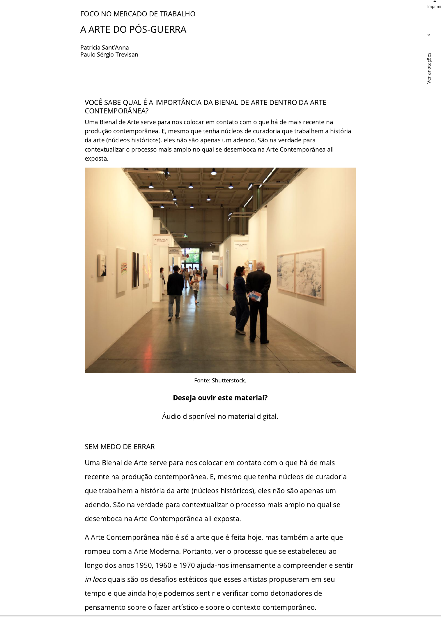 <p>FOCO NO MERCADO DE TRABALHO</p><p>A ARTE DO PÓS-GUERRA</p><p>Patricia Sant’Anna</p><p>Paulo Sérgio Trevisan</p><p>Imprimi</p><p>SEM MEDO DE ERRAR</p><p>Uma Bienal de Arte serve para nos colocar em contato com o que há de mais</p><p>recente na produção contemporânea. E, mesmo que tenha núcleos de curadoria</p><p>que trabalhem a história da arte (núcleos históricos), eles não são apenas um</p><p>adendo. São na verdade para contextualizar o processo mais amplo no qual se</p><p>desemboca na Arte Contemporânea ali exposta.</p><p>A Arte Contemporânea não é só a arte que é feita hoje, mas também a arte que</p><p>rompeu com a Arte Moderna. Portanto, ver o processo que se estabeleceu ao</p><p>longo dos anos 1950, 1960 e 1970 ajuda-nos imensamente a compreender e sentir</p><p>in loco quais são os desa�os estéticos que esses artistas propuseram em seu</p><p>tempo e que ainda hoje podemos sentir e veri�car como detonadores de</p><p>pensamento sobre o fazer artístico e sobre o contexto contemporâneo.</p><p>VOCÊ SABE QUAL É A IMPORTÂNCIA DA BIENAL DE ARTE DENTRO DA ARTE</p><p>CONTEMPORÂNEA?</p><p>Uma Bienal de Arte serve para nos colocar em contato com o que há de mais recente na</p><p>produção contemporânea. E, mesmo que tenha núcleos de curadoria que trabalhem a história</p><p>da arte (núcleos históricos), eles não são apenas um adendo. São na verdade para</p><p>contextualizar o processo mais amplo no qual se desemboca na Arte Contemporânea ali</p><p>exposta.</p><p>Fonte: Shutterstock.</p><p>Deseja ouvir este material?</p><p>Áudio disponível no material digital.</p><p>0</p><p>V</p><p>e</p><p>r</p><p>a</p><p>n</p><p>o</p><p>ta</p><p>çõ</p><p>e</p><p>s</p><p>Organizar uma bienal é uma ação curatorial. Curadoria é o estudo aprofundado de</p><p>experiências estéticas que podem criar um diálogo sensível sobre determinado</p><p>assunto ou tema. Portanto, não é simplesmente escolher obras e manifestações de</p><p>arte, mas criar, com elas, diálogos e textos sensíveis que possam fazer o visitante</p><p>compreender mais profundamente a própria obra ou mesmo correlacioná-la a</p><p>uma série de outras obras de maneira a criar uma rede signi�cativa. As curadorias</p><p>podem ter diversos caminhos: cronológicos, de gênero, por temática etc. O</p><p>importante é que ela desperte o interesse do visitante sobre o tema central da</p><p>exposição e o faça pensar sobre o assunto.</p><p>0</p><p>V</p><p>e</p><p>r</p><p>a</p><p>n</p><p>o</p><p>ta</p><p>çõ</p><p>e</p><p>s</p>