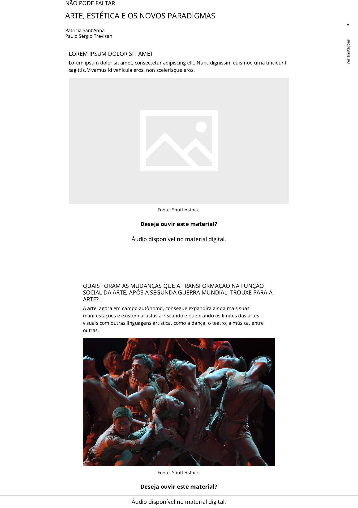 <p>NÃO PODE FALTAR</p><p>ARTE, ESTÉTICA E OS NOVOS PARADIGMAS</p><p>Patricia Sant’Anna</p><p>Paulo Sérgio Trevisan</p><p>Imprimi</p><p>QUAIS FORAM AS MUDANÇAS QUE A TRANSFORMAÇÃO NA FUNÇÃO</p><p>SOCIAL DA ARTE, APÓS A SEGUNDA GUERRA MUNDIAL, TROUXE PARA A</p><p>ARTE?</p><p>A arte, agora em campo autônomo, consegue expandira ainda mais suas</p><p>manifestações e existem artistas arriscando e quebrando os limites das artes</p><p>visuais com outras linguagens artística, como a dança, o teatro, a música, entre</p><p>outras.</p><p>Fonte: Shutterstock.</p><p>Deseja ouvir este material?</p><p>Áudio disponível no material digital.</p><p>LOREM IPSUM DOLOR SIT AMET</p><p>Lorem ipsum dolor sit amet, consectetur adipiscing elit. Nunc dignissim euismod urna tincidunt</p><p>sagittis. Vivamus id vehicula eros, non scelerisque eros.</p><p>Fonte: Shutterstock.</p><p>Deseja ouvir este material?</p><p>Áudio disponível no material digital.</p><p>0</p><p>V</p><p>e</p><p>r</p><p>a</p><p>n</p><p>o</p><p>ta</p><p>çõ</p><p>e</p><p>s</p><p>PRATICAR PARA APRENDER</p><p>Do outro lado da cidade há a exposição e a apresentação de arte</p><p>performática intitulada Corpore (in)sano. Pelo título dá para imaginar</p><p>que o objeto central será o corpo, tanto em pintura quanto escultura e</p><p>também na arte performática, que utiliza as expressões corporais do</p><p>artista e do espectador como modo de execução da arte. Você entende</p><p>que a arte performática é parte das Artes Visuais ou Artes Cênicas? Por</p><p>que a arte performática tem ampliado seu espaço nas exposições de</p><p>arte como a Bienal? Você consegue identi�car quais outras formas</p><p>artísticas também se utilizam do corpo nas Artes Visuais? O modo como</p><p>a body art se utiliza do corpo como expressão artística é o mesmo que a</p><p>arte performática?</p><p>CONCEITO-CHAVE</p><p>AS ABORDAGENS CRÍTICAS: WALTER BENJAMIN E ESCOLA DE</p><p>FRANKFURT</p><p>No ensaio A obra de arte na era de sua reprodutibilidade técnica, de</p><p>1935, Walter Benjamin demonstra como as artes passam de um campo</p><p>com justi�cativas e compreensão religiosa para um campo todo seu. Ele</p><p>entende que as artes, antes, possuíam aura que é a absoluta</p><p>singularidade do ser. A arte assim era algo que se realiza enquanto</p><p>exemplar único, sem repetição. Sua qualidade é eterna, superando</p><p>qualquer efemeridade cotidiana. Assim, no caso da obra de arte, é ter</p><p>autenticidade. A obra de arte possui aura quando é única, una, sem</p><p>possibilidade de repetição, duradoura, é nova e tradicional ao mesmo</p><p>tempo, pois trans�gura a realidade. As artes tinham como �m social</p><p>sacralizar o mundo, dessa maneira, por conta de sua origem religiosa, a</p><p>arte tinha essa qualidade “aurática”.</p><p>A sociedade industrial quebra com os pressupostos que construíam o</p><p>objeto artístico com aura: dissolvem a distância e a transcendência dos</p><p>objetos artísticos, dando a uma multidão obras de artes para serem</p><p>vistas, quando antes só alguns tinham acesso a elas. Não é a</p><p>reprodução em si que é o problema, a�nal alunos imitavam os mestres.</p><p>O que transforma isso é a reprodutibilidade técnica, que torna possível</p><p>a produção do objeto artístico em série e que, em alguns tipos como a</p><p>fotogra�a, o disco (música) e o cinema, não se consegue distinguir</p><p>original da cópia. Isso fez com que Benjamin reexaminasse os</p><p>pressupostos para compreender original e cópia.</p><p>Nesse cenário, a sociedade ocidental passou por diversas</p><p>transformações ao longo do século XX, que desencadearam o que os</p><p>�lósofos chamam de desencantamento do mundo. Isso signi�ca que a</p><p>0</p><p>V</p><p>e</p><p>r</p><p>a</p><p>n</p><p>o</p><p>ta</p><p>çõ</p><p>e</p><p>s</p><p>maneira como abordamos o mundo deixa de ser baseada em mitos e</p><p>passa a ser, cada vez mais, racional, deixa de ouvir explicações advindas</p><p>da magia e torna-se cada vez mais cientí�ca e lógica.</p><p>Esse processo liberou as artes da função e da �nalidade religiosa,</p><p>dando-lhes autonomia. Walter Benjamin dedica-se a compreender essa</p><p>autonomia das artes e vê a sociedade industrial de uma maneira</p><p>otimista, pois considera que a reprodução das obras de arte – livros</p><p>feitos em escala, artes grá�cas, fotogra�a revelando imagens de</p><p>diversos lugares, rádio levando música a quem quiser ouvir e o cinema –</p><p>permitiria a maioria das pessoas o acesso a criações que anteriormente</p><p>poucos no mundo poderiam usufruir. Benjamin acreditava que a</p><p>reprodução técnica tornava o acesso às artes e à cultura mais</p><p>democrático, porém não levou em conta que a reprodução visaria o</p><p>lucro, e não a democratização das artes.</p><p>A Escola de Frankfurt é uma escola de teoria social e �loso�a que faz</p><p>crítica à cultura de massa e à indústria cultural – indústria cultural é uma</p><p>“expressão cunhada por Theodor Adorno e Max Horkheimer para</p><p>indicar uma cultura baseada na ideia e na prática do consumo de</p><p>‘produtos culturais’ fabricados em série”, para ambos os pesquisadores,</p><p>o termo indústria cultural substitui cultura de massa (CHAUÍ, 2008, p.</p><p>290). Atualmente, de modo geral, entende-se cultura de massa ou</p><p>cultura pop como uma formação cultural que é compatível e</p><p>reconhecível por grande parte da população, sem discriminação das</p><p>individualidades, e indústria cultural é toda a produção (seja de cunho</p><p>artístico, de entretenimento, midiática etc.) que tem como foco a cultura</p><p>de massa e é produzida com objetivos mercadológicos.</p><p>Formada por Max Horkheimer, Theodor W. Adorno, Herbert Marcuse,</p><p>Jürgen Habermas, entre outros, a Escola de Frankfurt trata de um grupo</p><p>de cientistas s